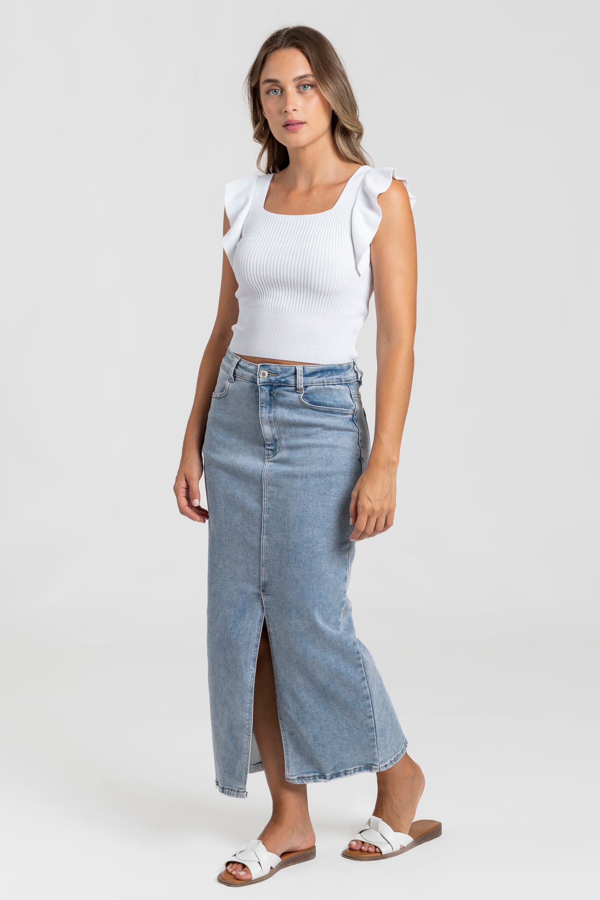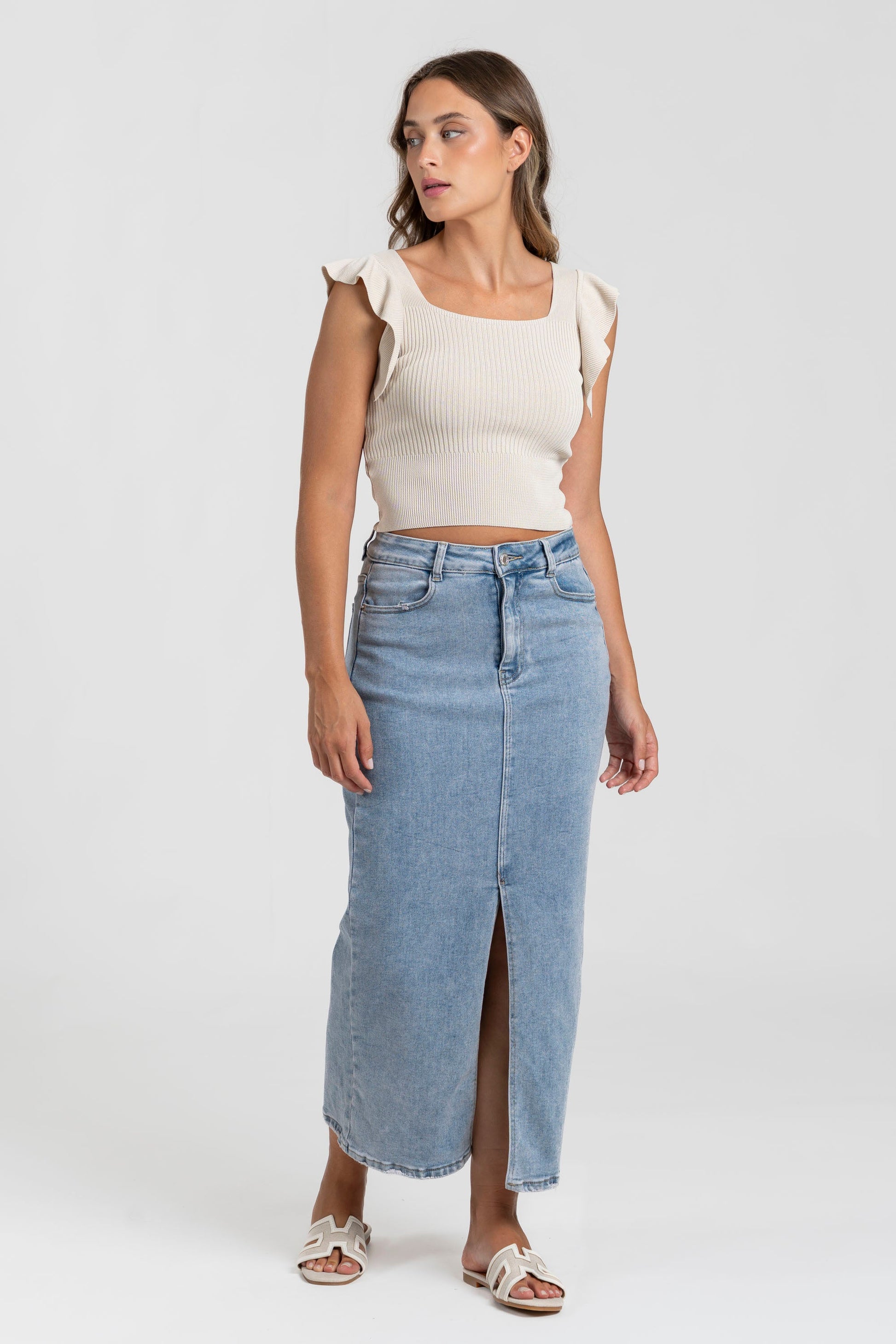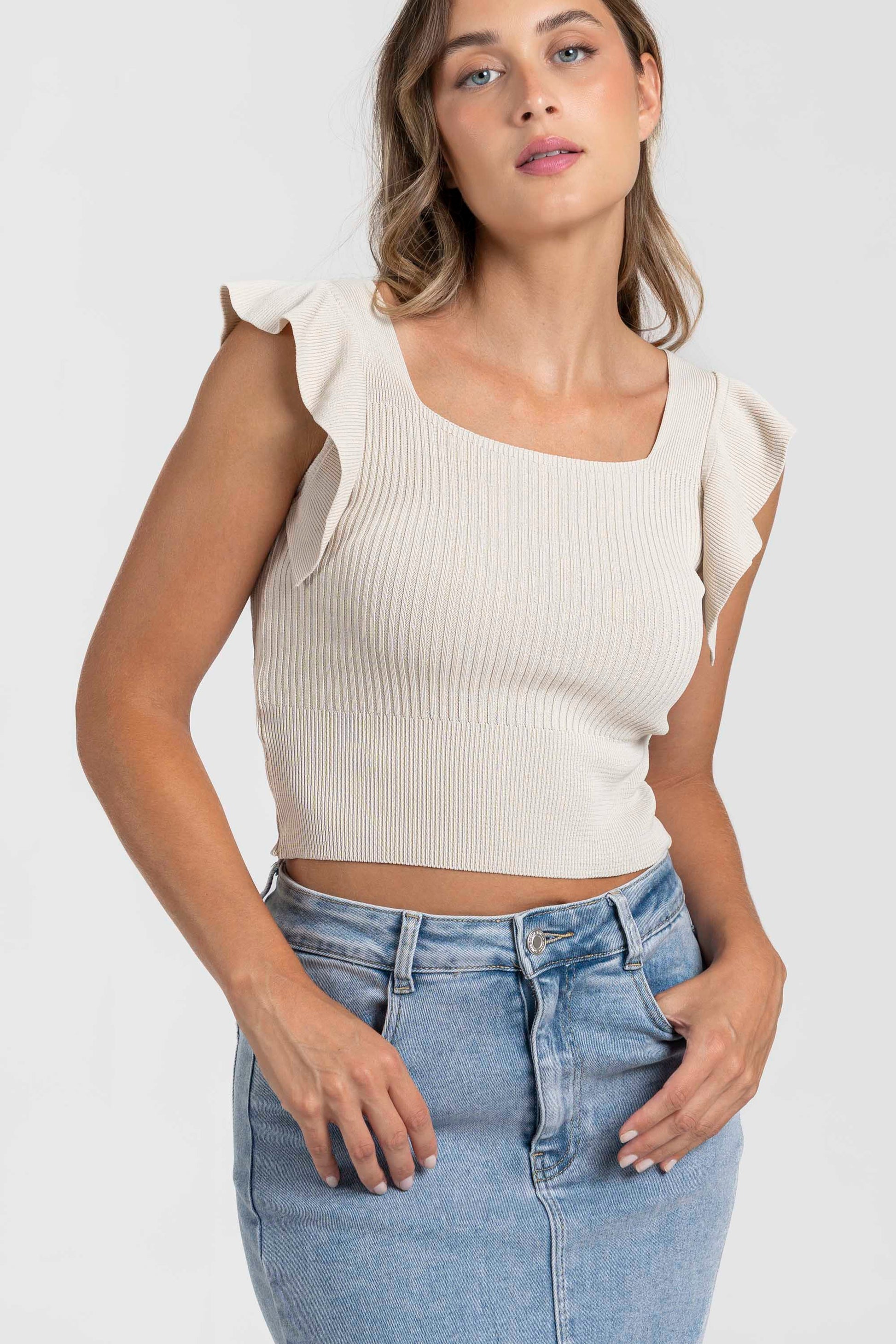 Tejido punto. Tirantes anchos con volantes. Escote cuadrado. Talla modelo: XS. Altura modelo 1,66 m.