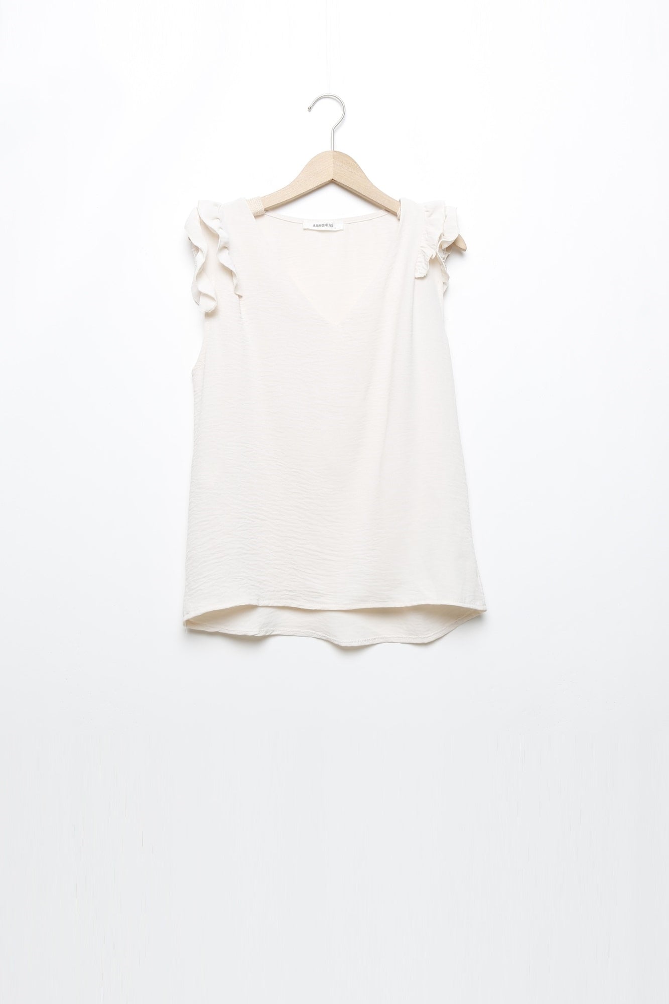 Tejido de gasa. Diseño recto. Diseño fluido. Cuello pico. Manga sisa. Detalles con encaje. Parte de atrás ligeramente más larga.