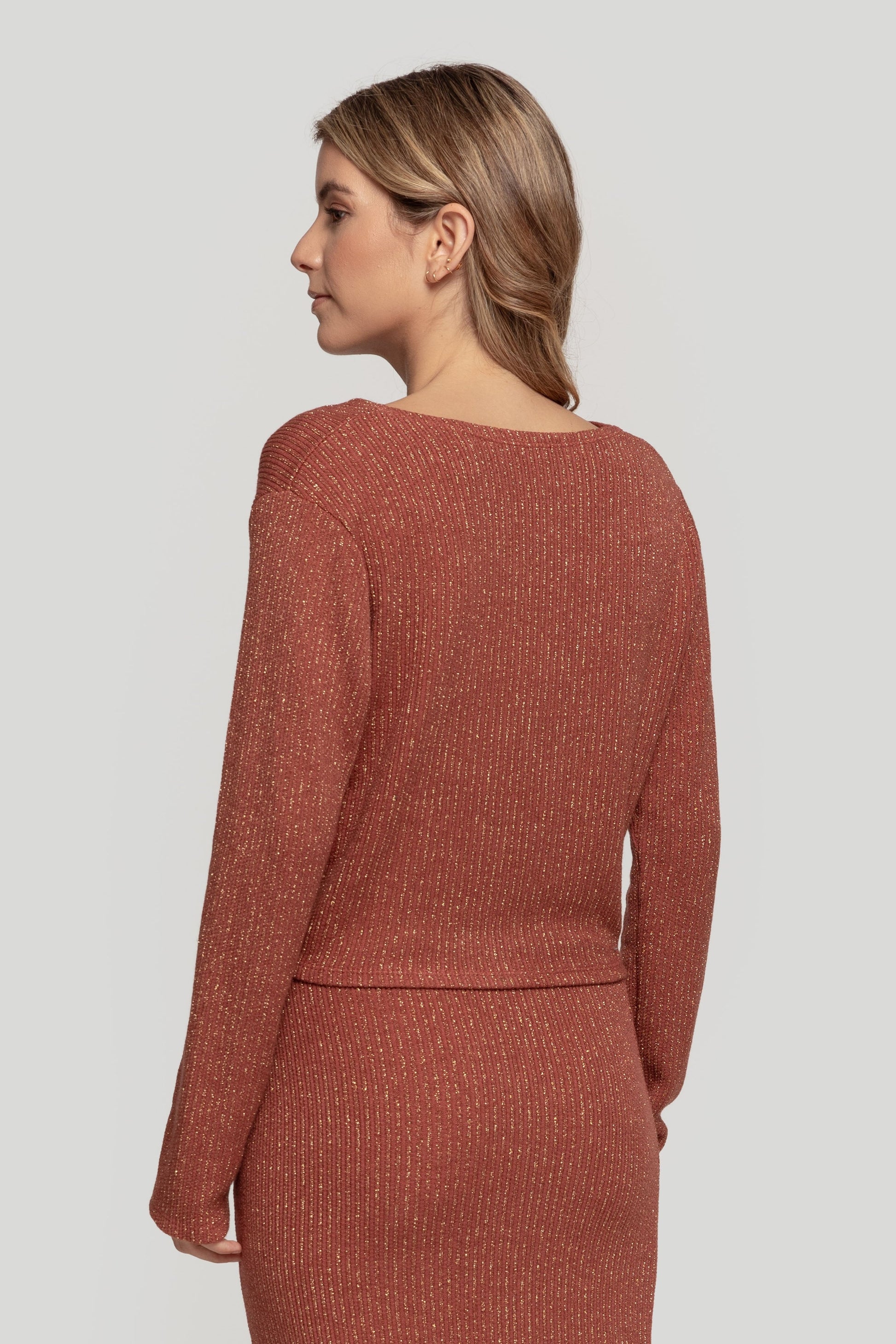 Tejido de canalé. Tejido elástico. Diseño crop. Diseño nudo. Cuello pico. Manga larga. Trama brillante. Talla modelo: S. Altura modelo: 1,70 m.