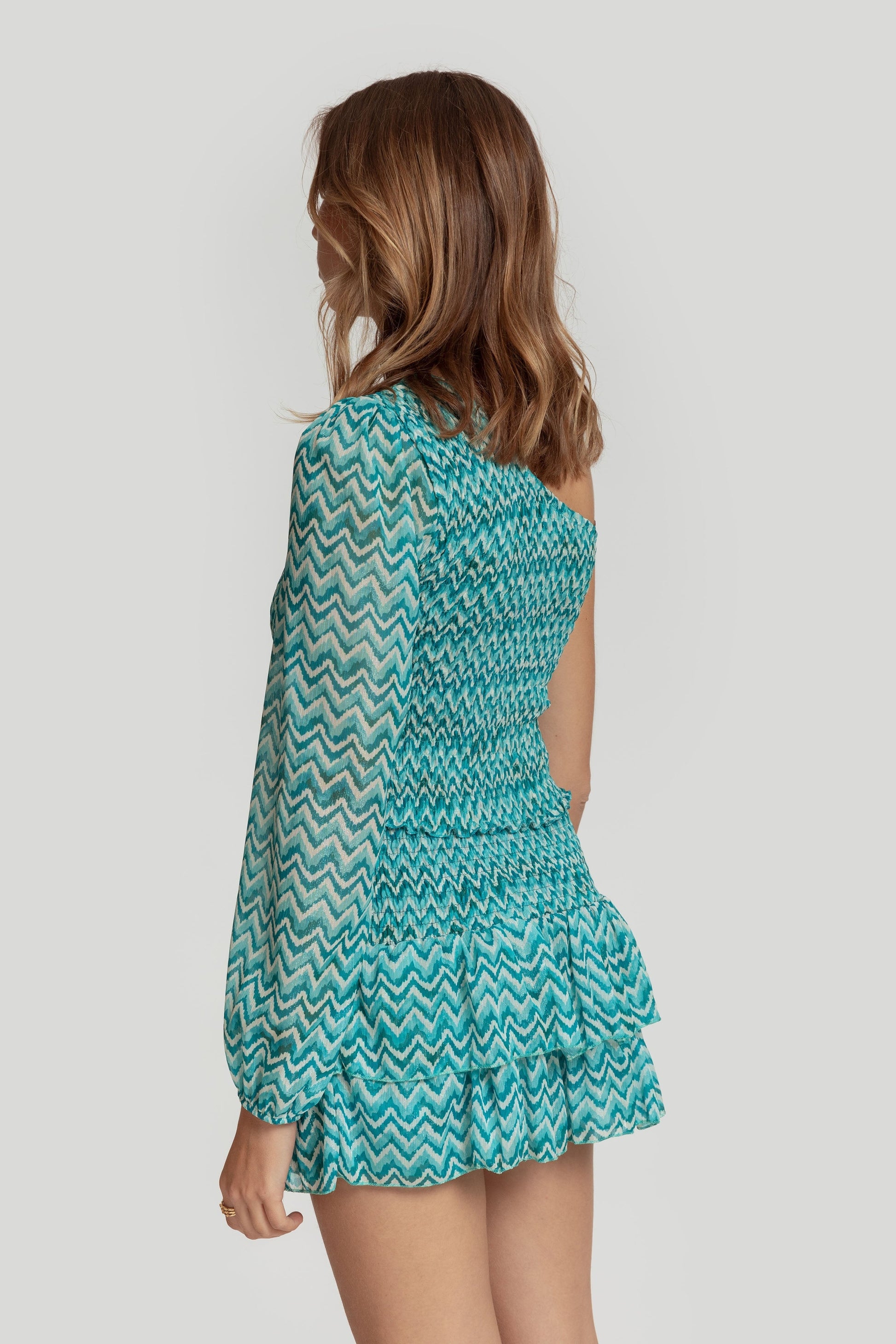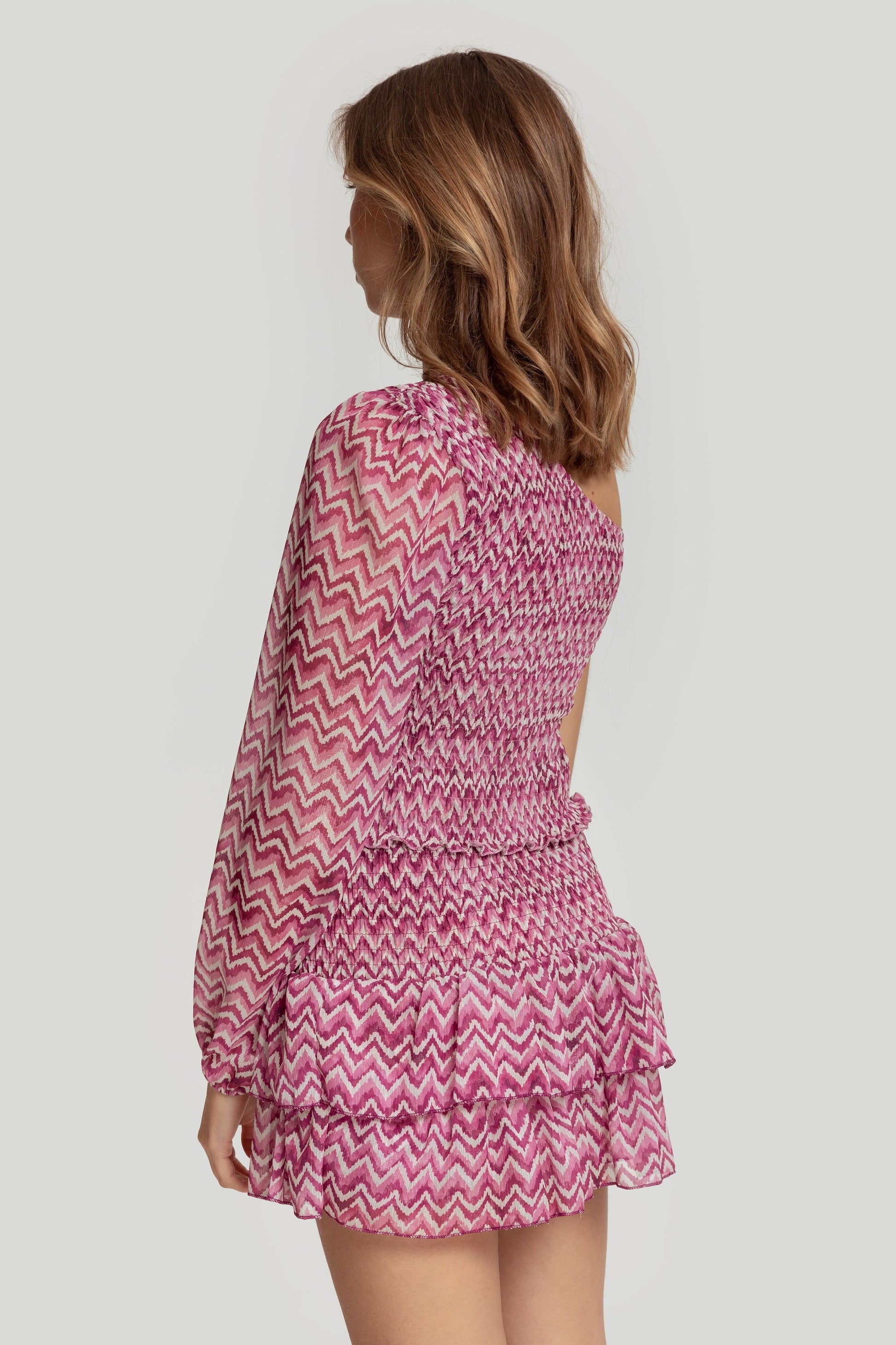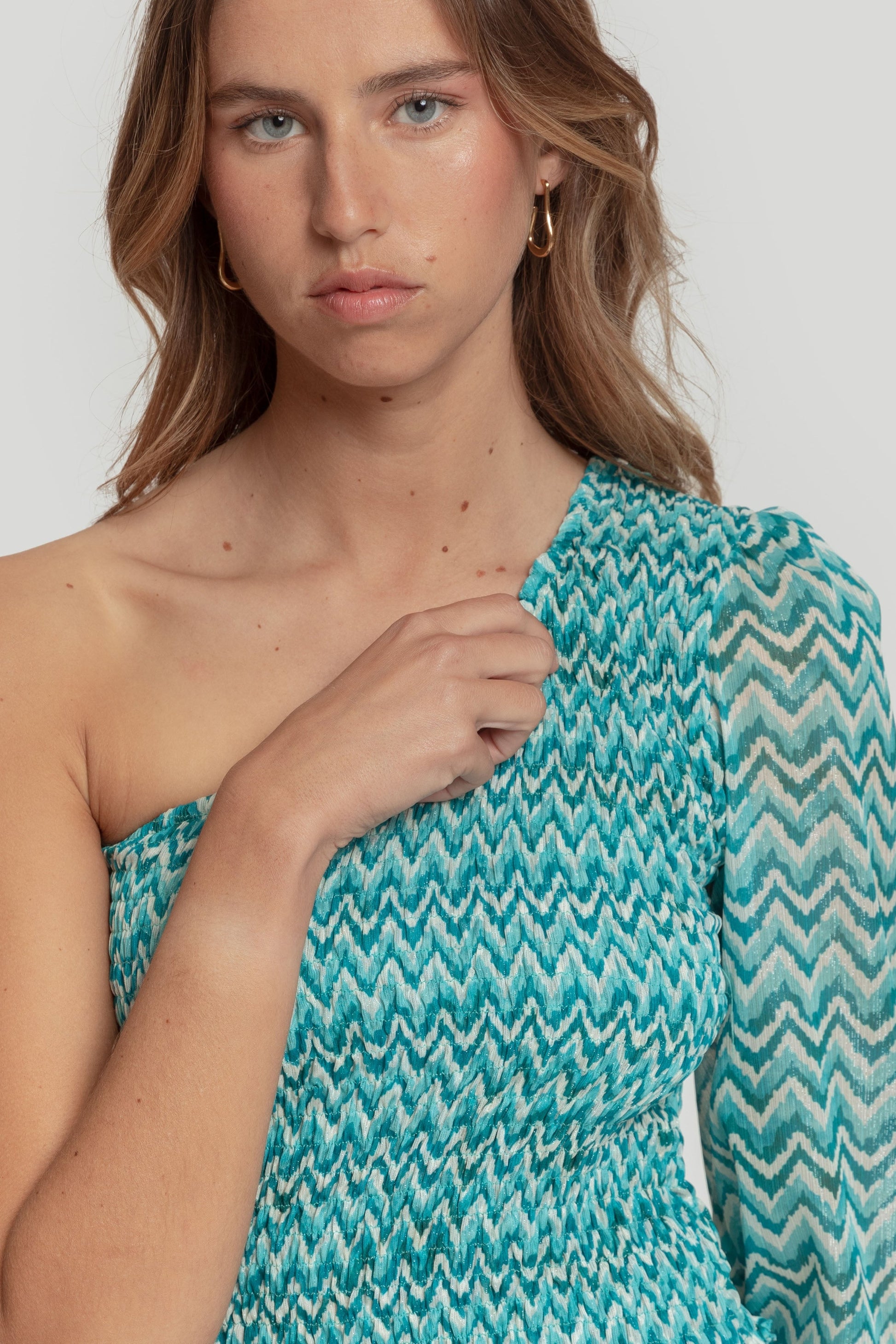 Tejido de gasa. Tejido brillo. Diseño crop. Panel elástico. Manga asimétrica. Manga larga. Puño elástico. Talla modelo: S. Altura modelo: 1,70 m.