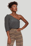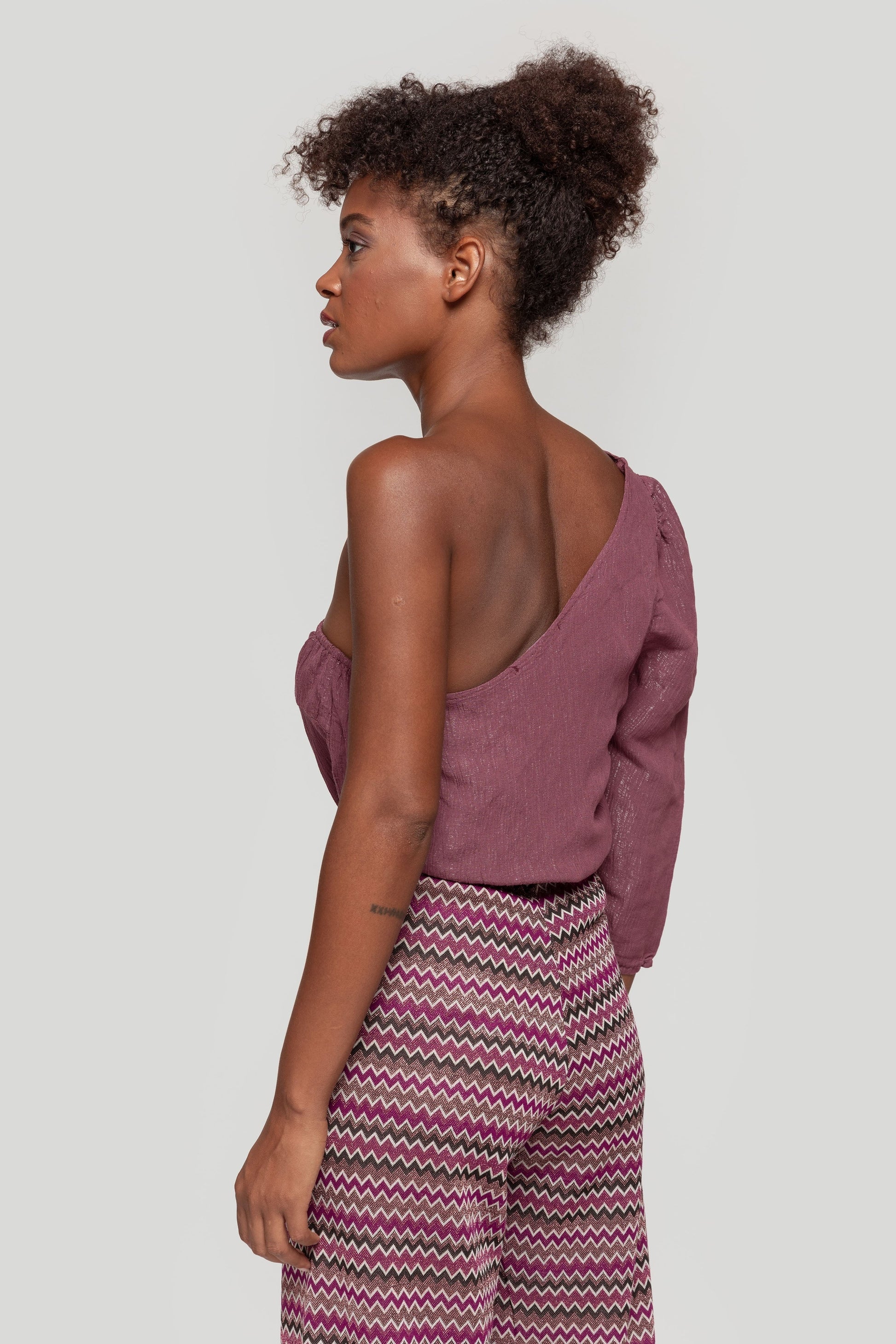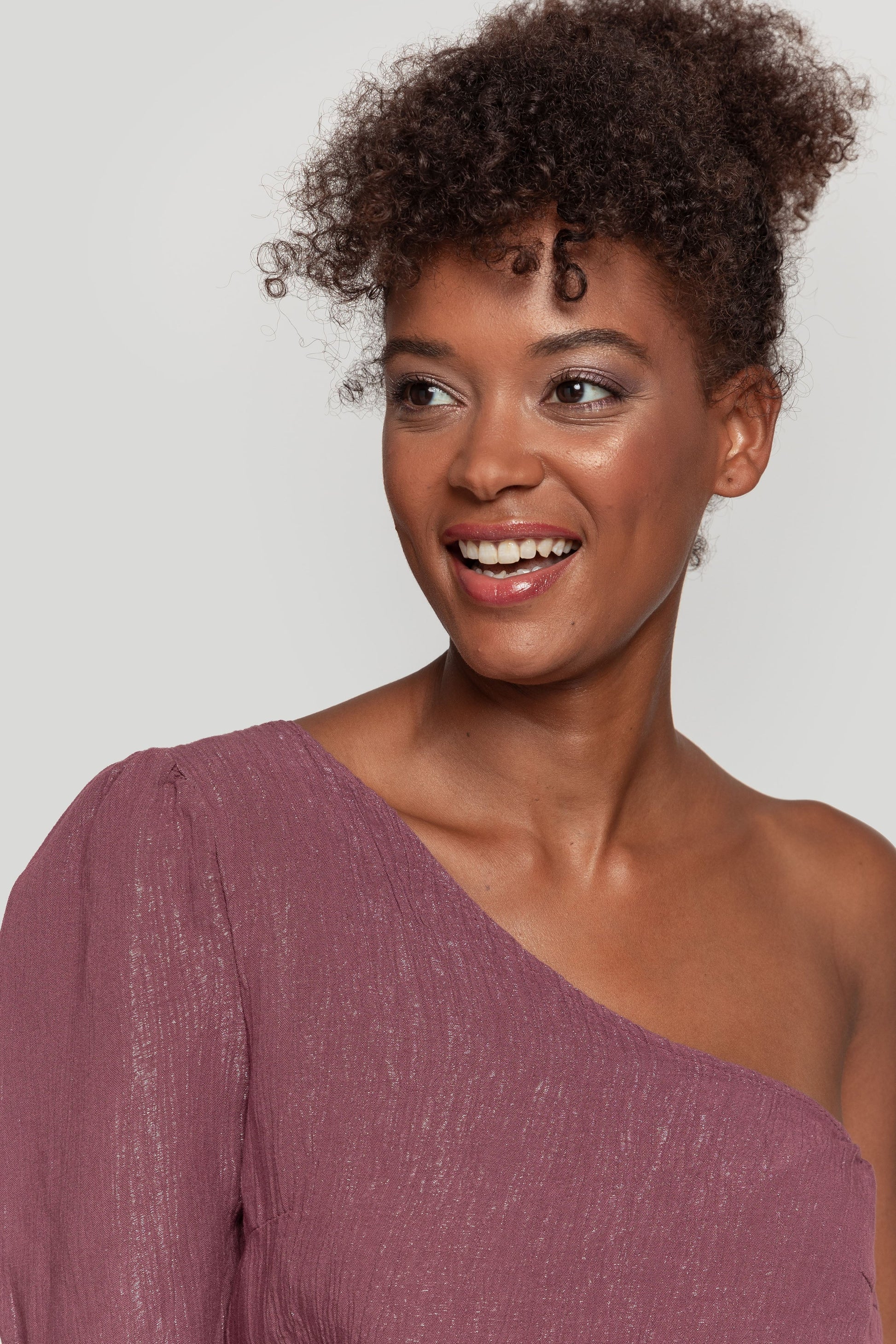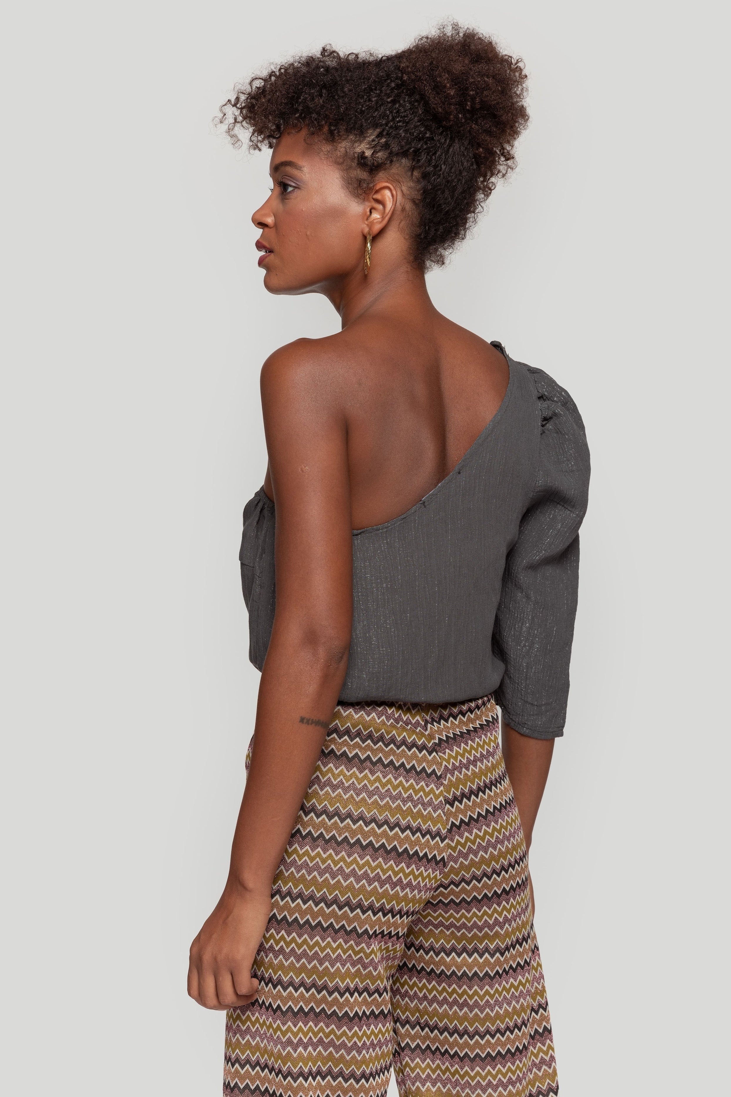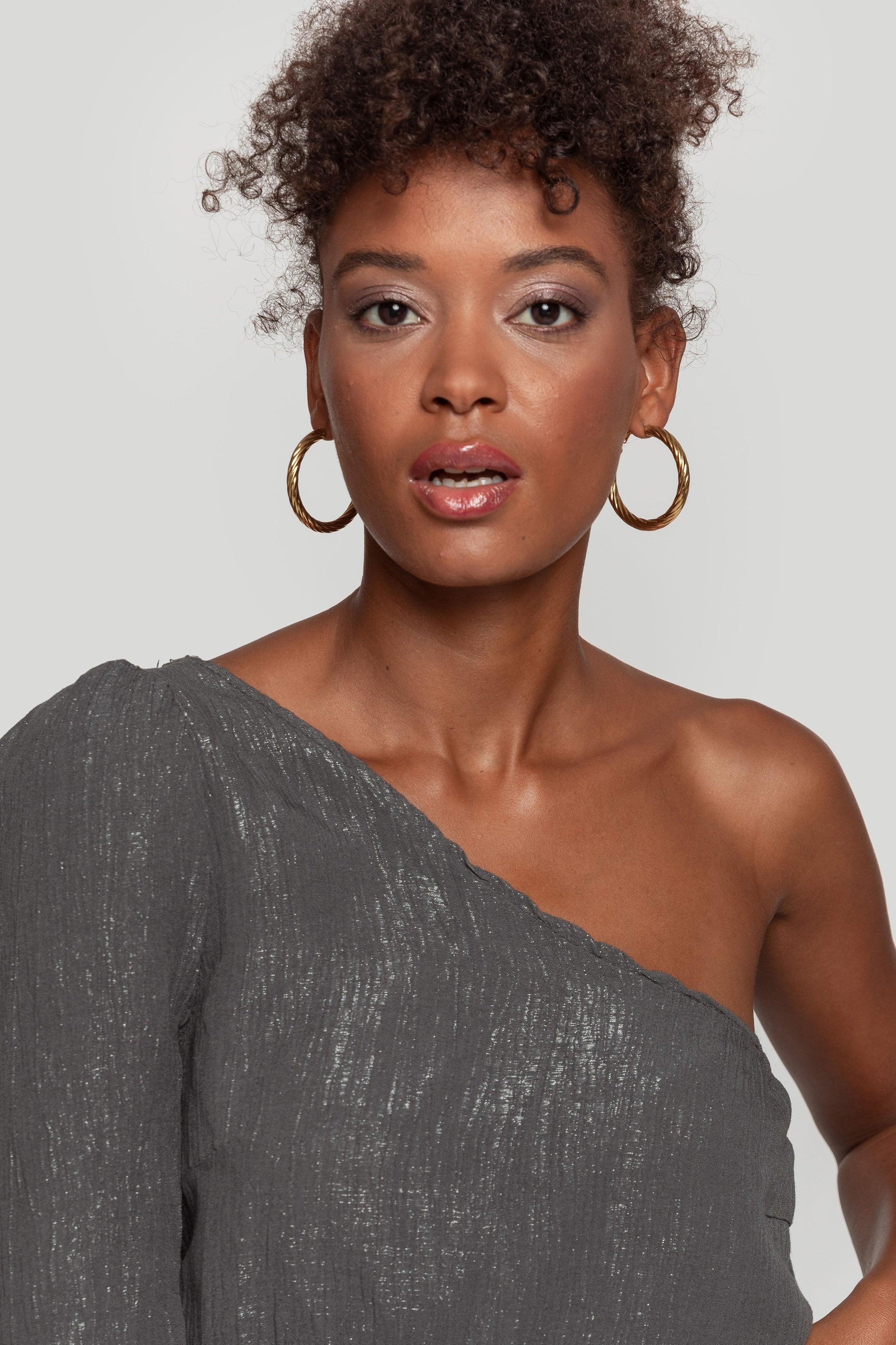 Tejido brillo. Diseño recto. Manga simetrica. Manga larga. Talla modelo: S. Altura modelo 1,70 m.