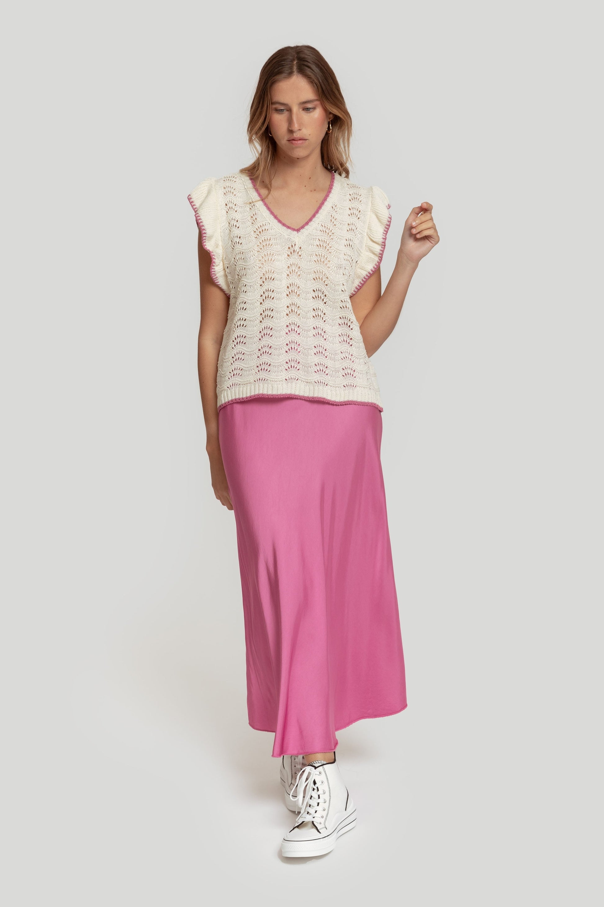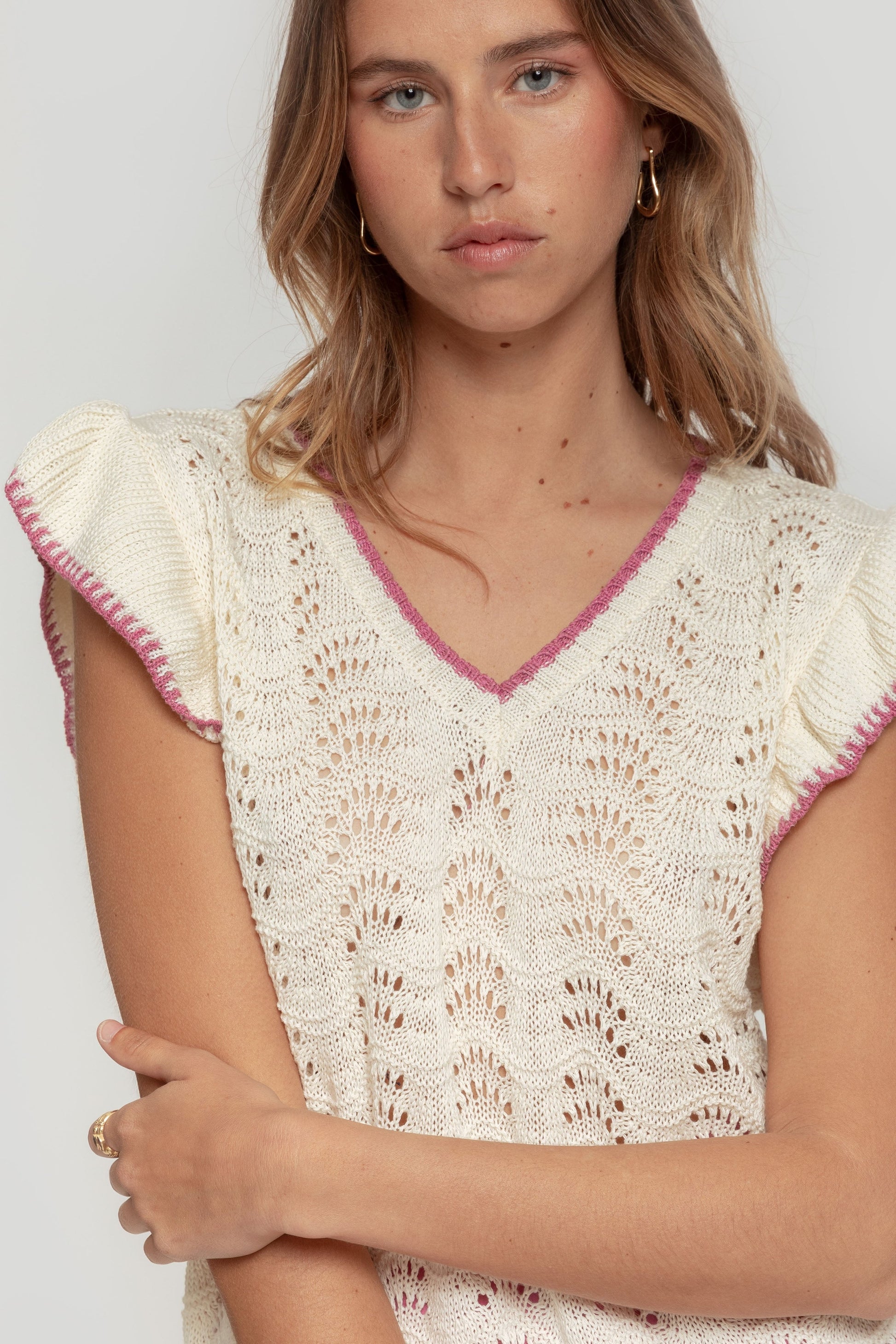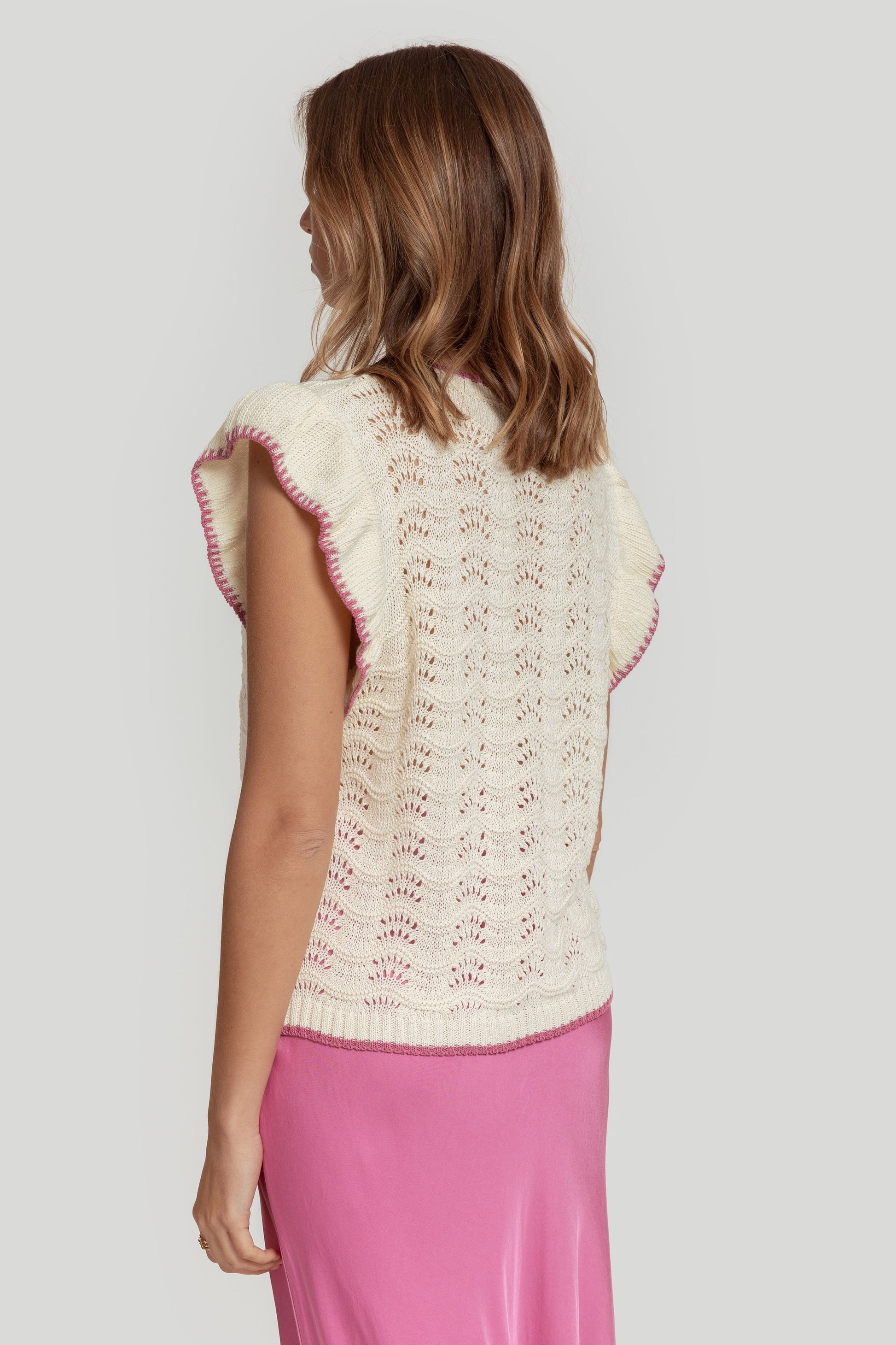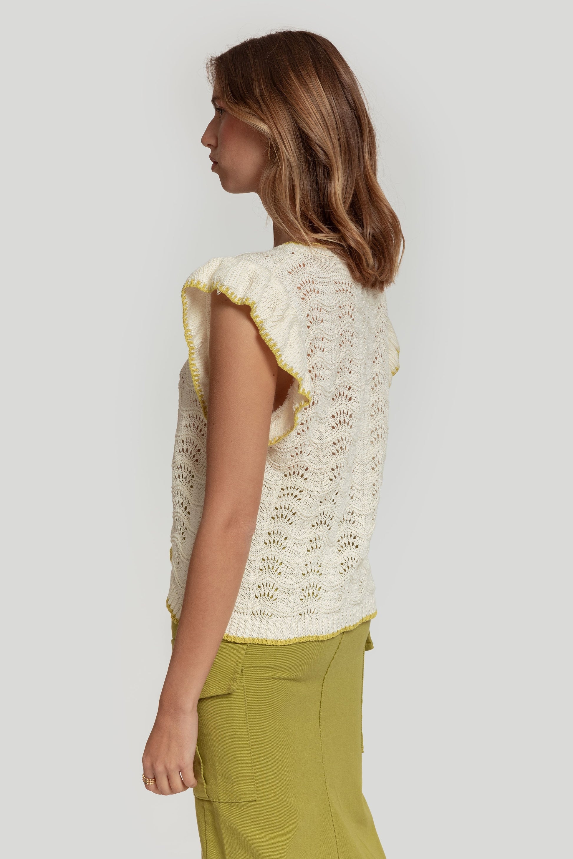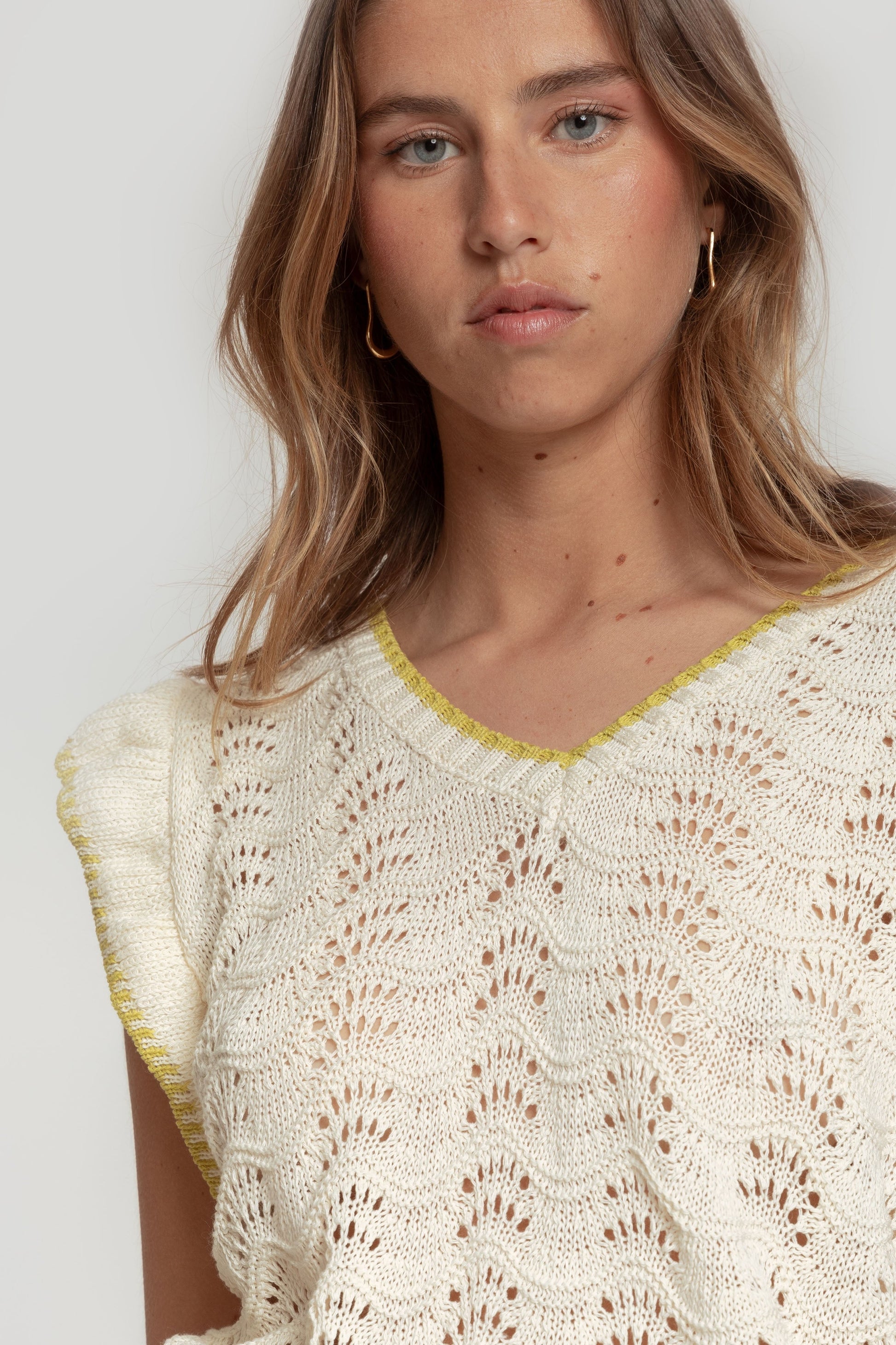 Tejido de algodón. Tejido de punto. Tejido trenzado. Diseño recto. Manga sisa. Terminaciones en otro color. Talla modelo: S. Altura modelo: 1,70 m.
