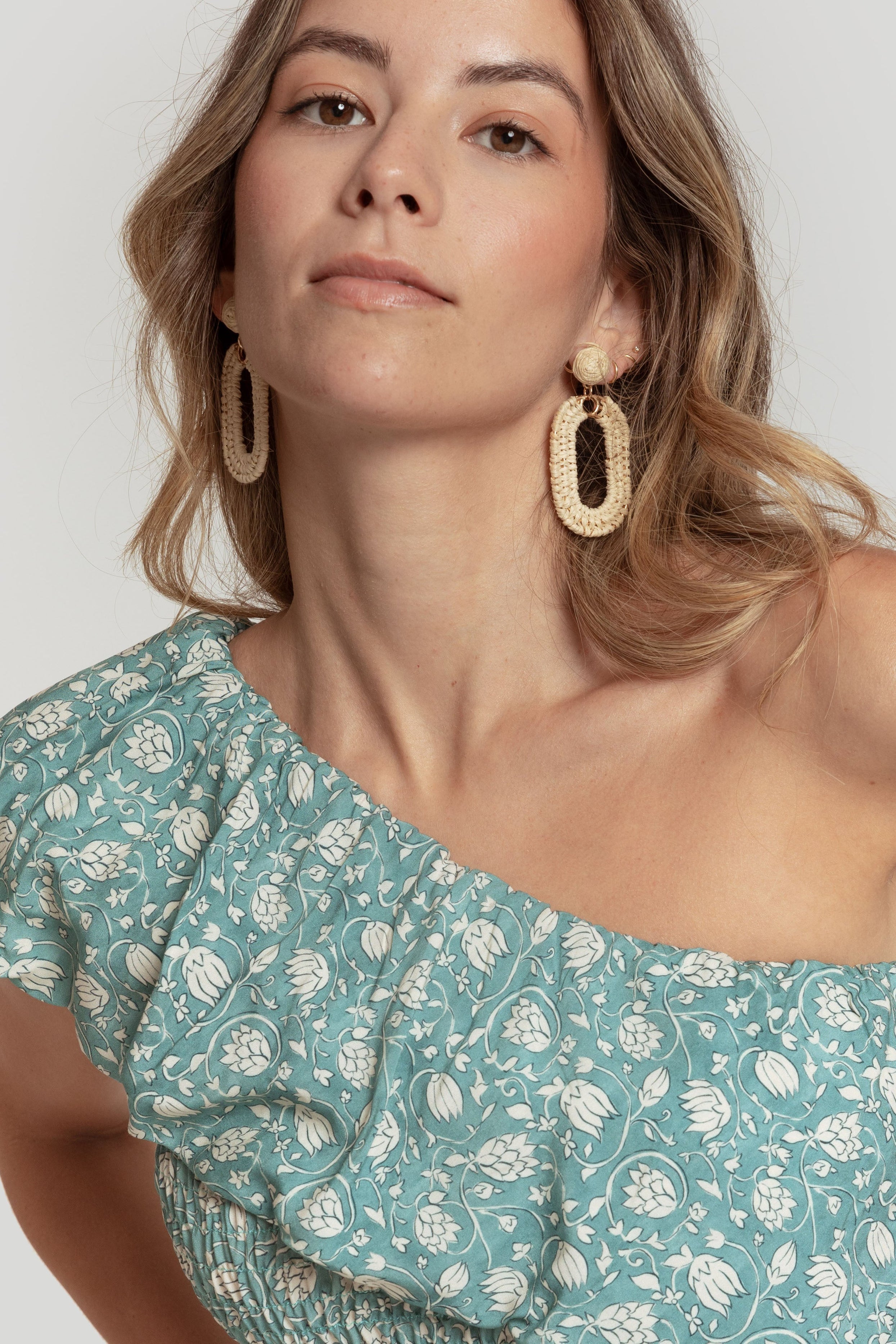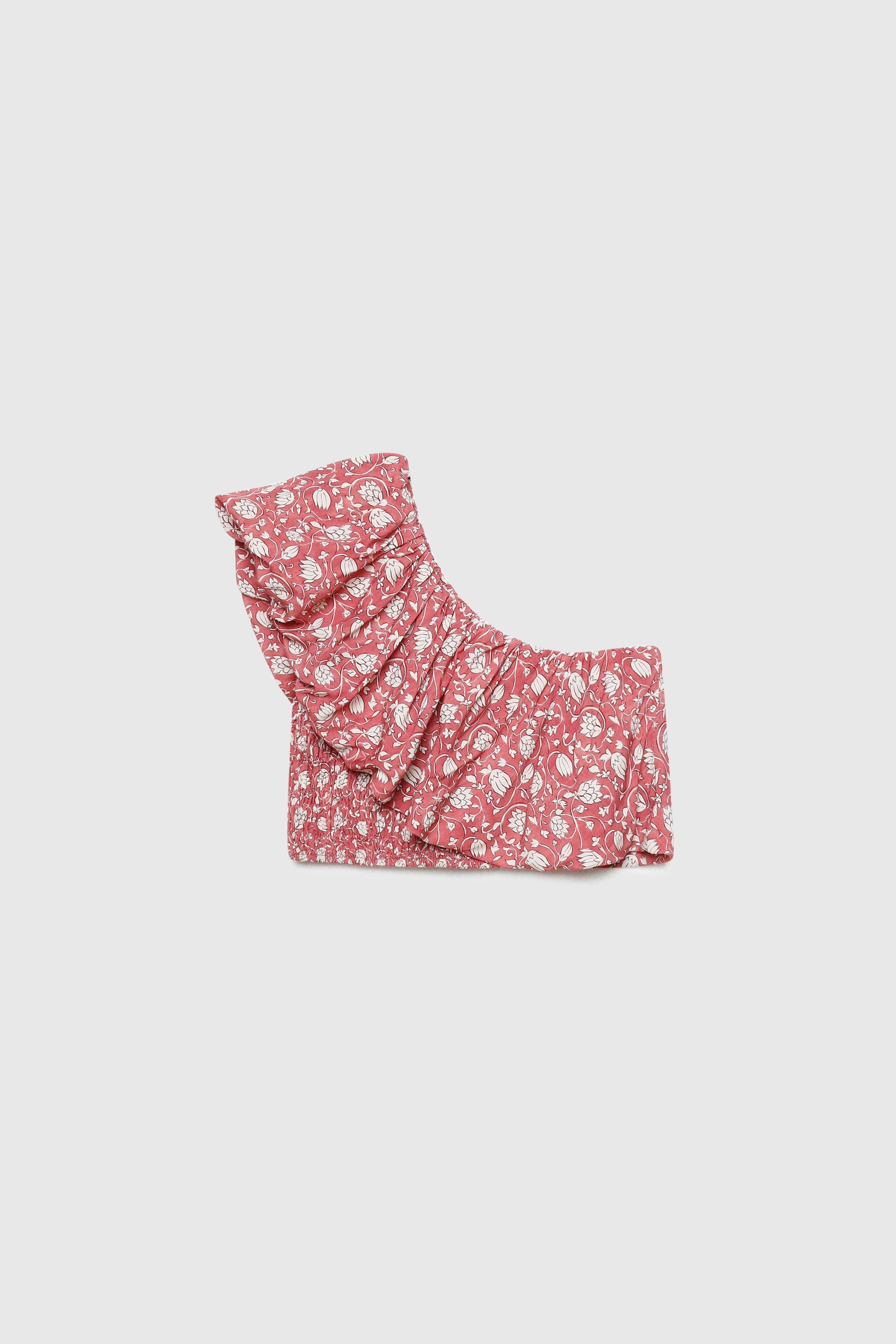Tejido fluido. Diseño estampado. Cuerpo elástico. Manga asimétrica. volante amplio. Talla modelo: S. Altura modelo: 1,70 m.