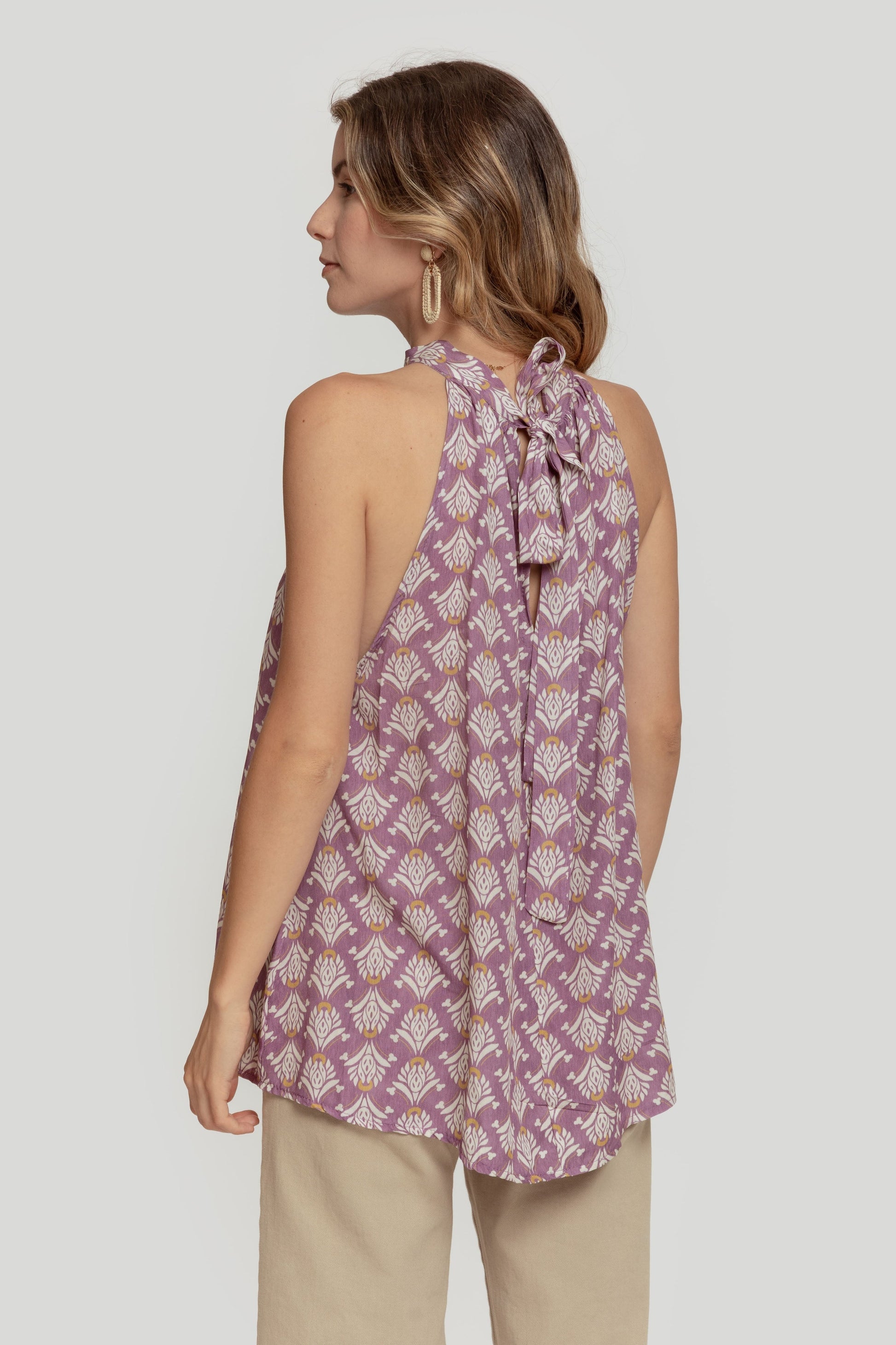 Tejido fluido. Diseño estampado. Diseño amplio. Cuello halter. Lazo posterior en el cuello. Talla modelo: S. Altura modelo: 1,70 m.