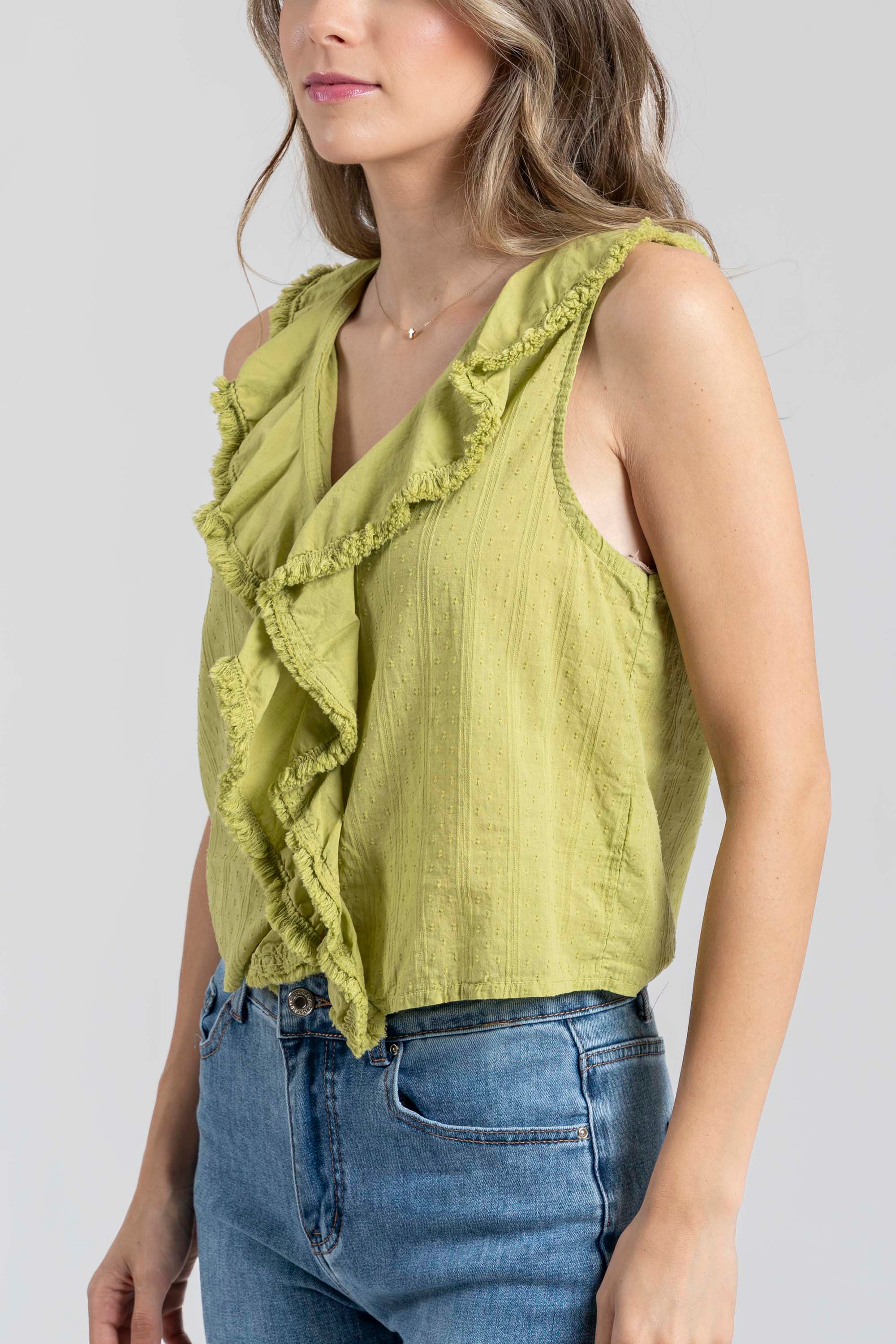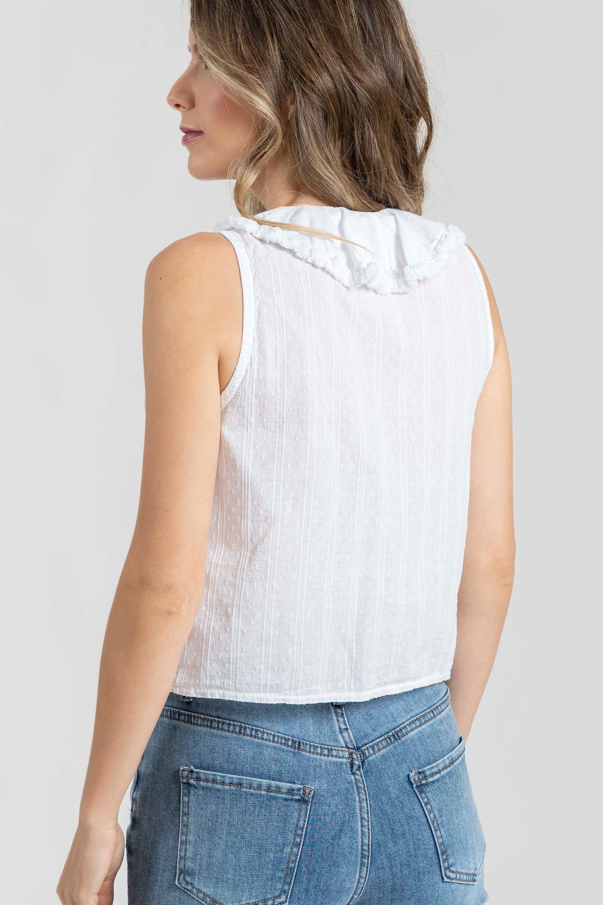 Tejido algodón. Escote pico. Manga sisa. Cierre botones.