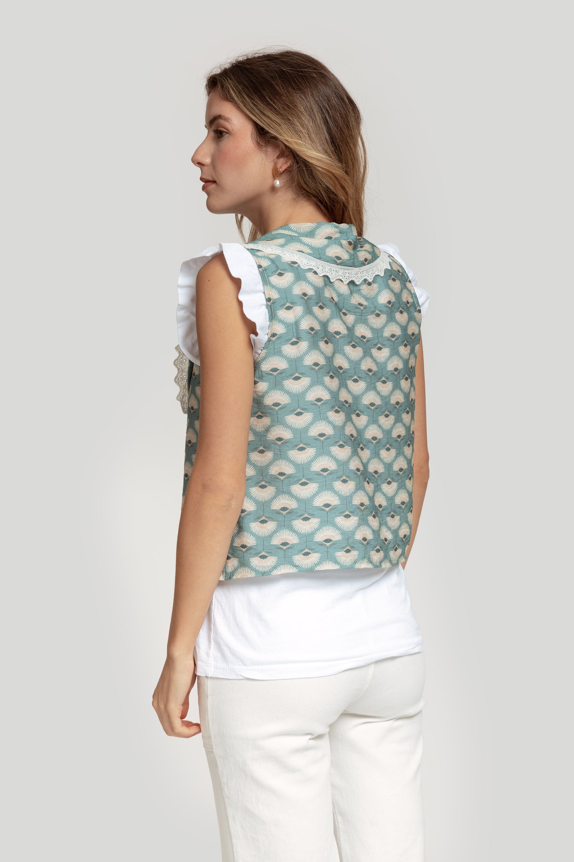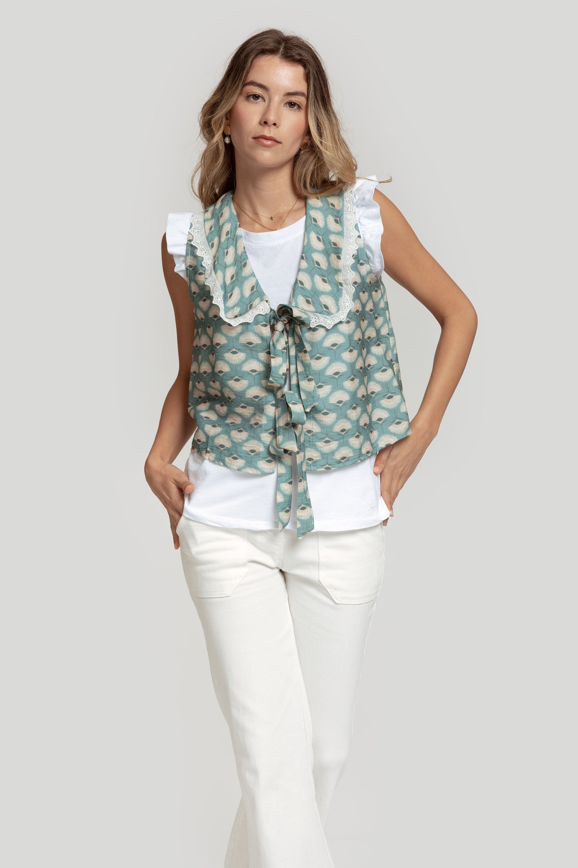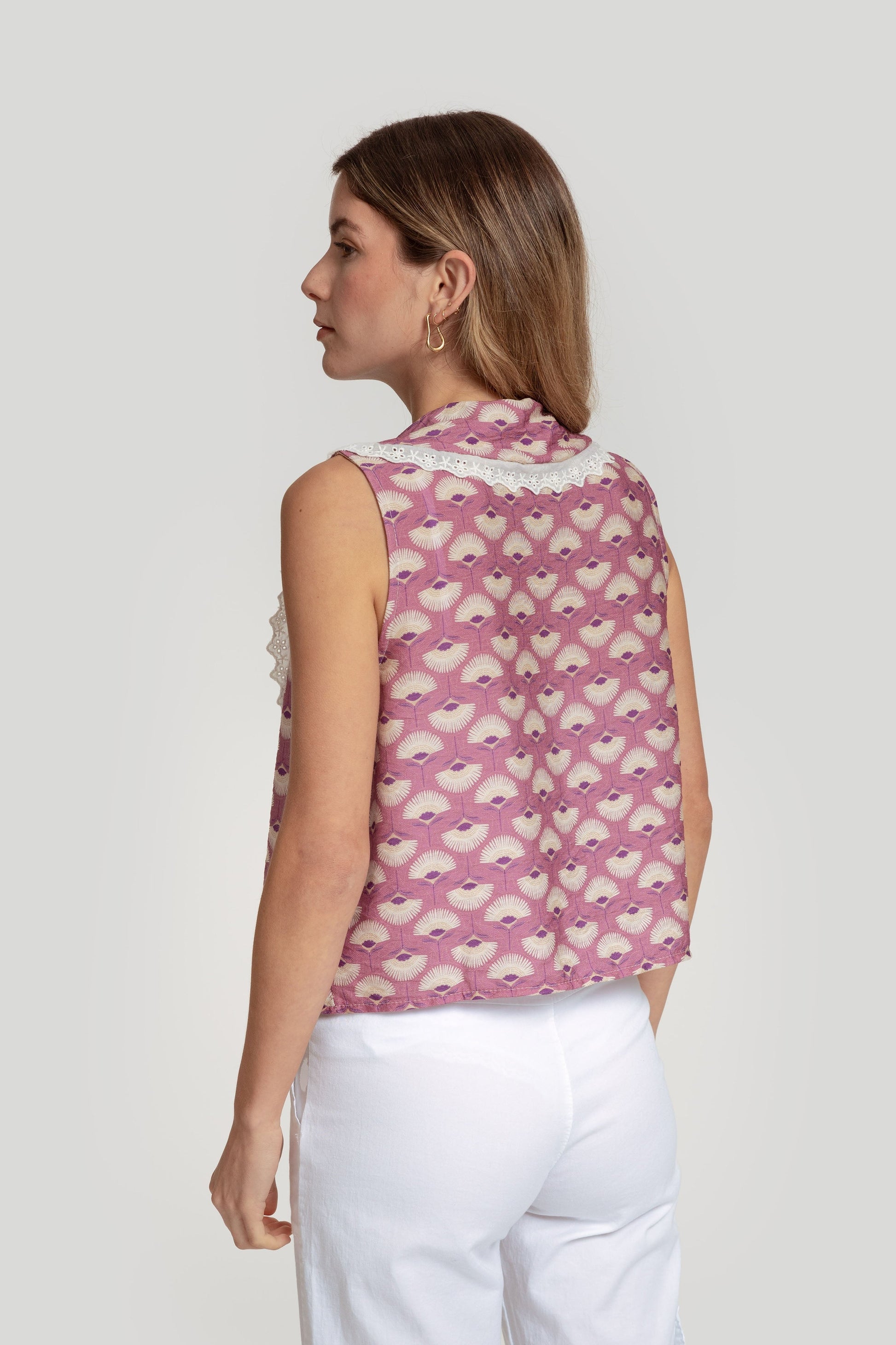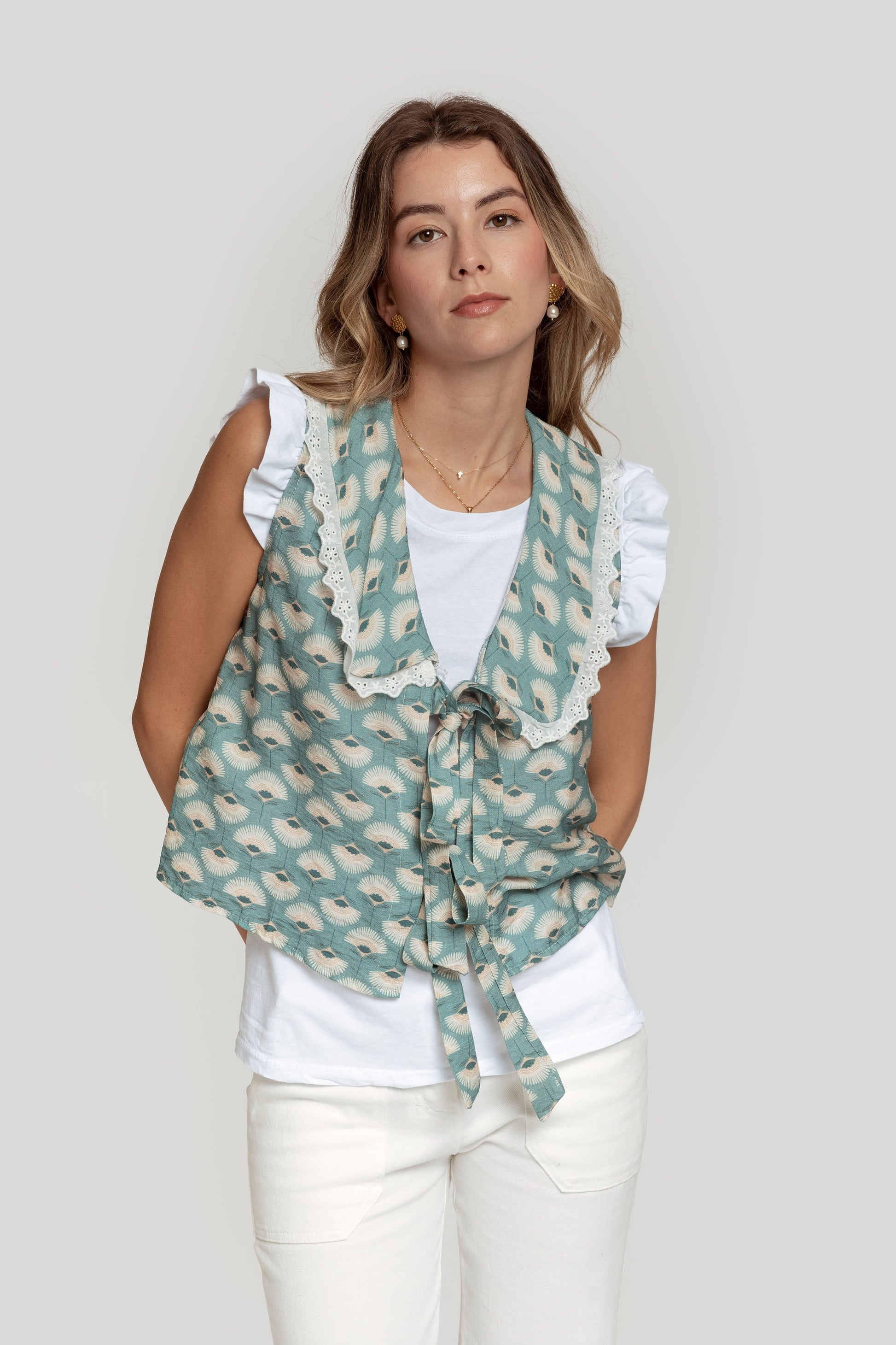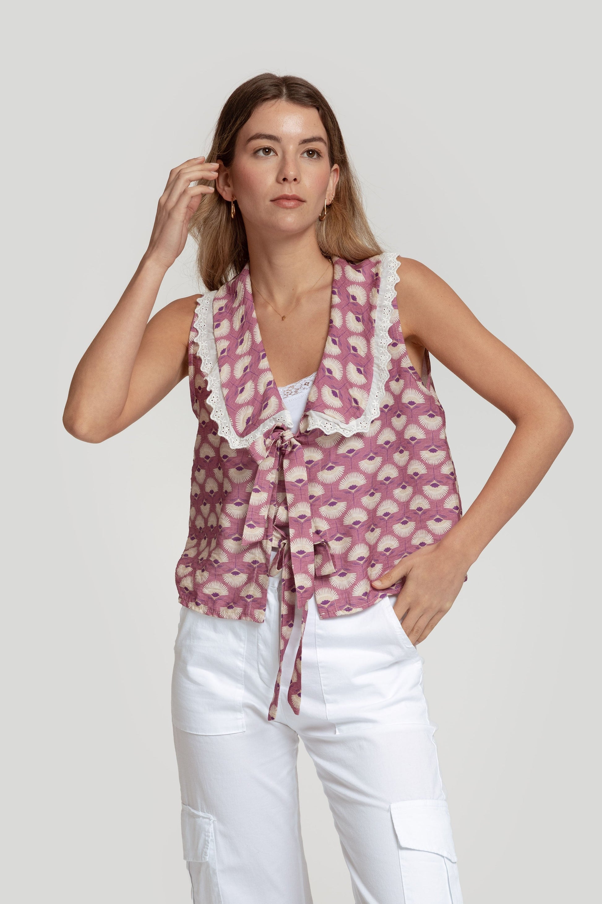 Tejido fluido. Diseño estampado. Diseño amplio. Diseño recto. Cuello bobo. Manga sisa. Cierre de lazos. Talla modelo: S. Altura modelo: 1,70 m.