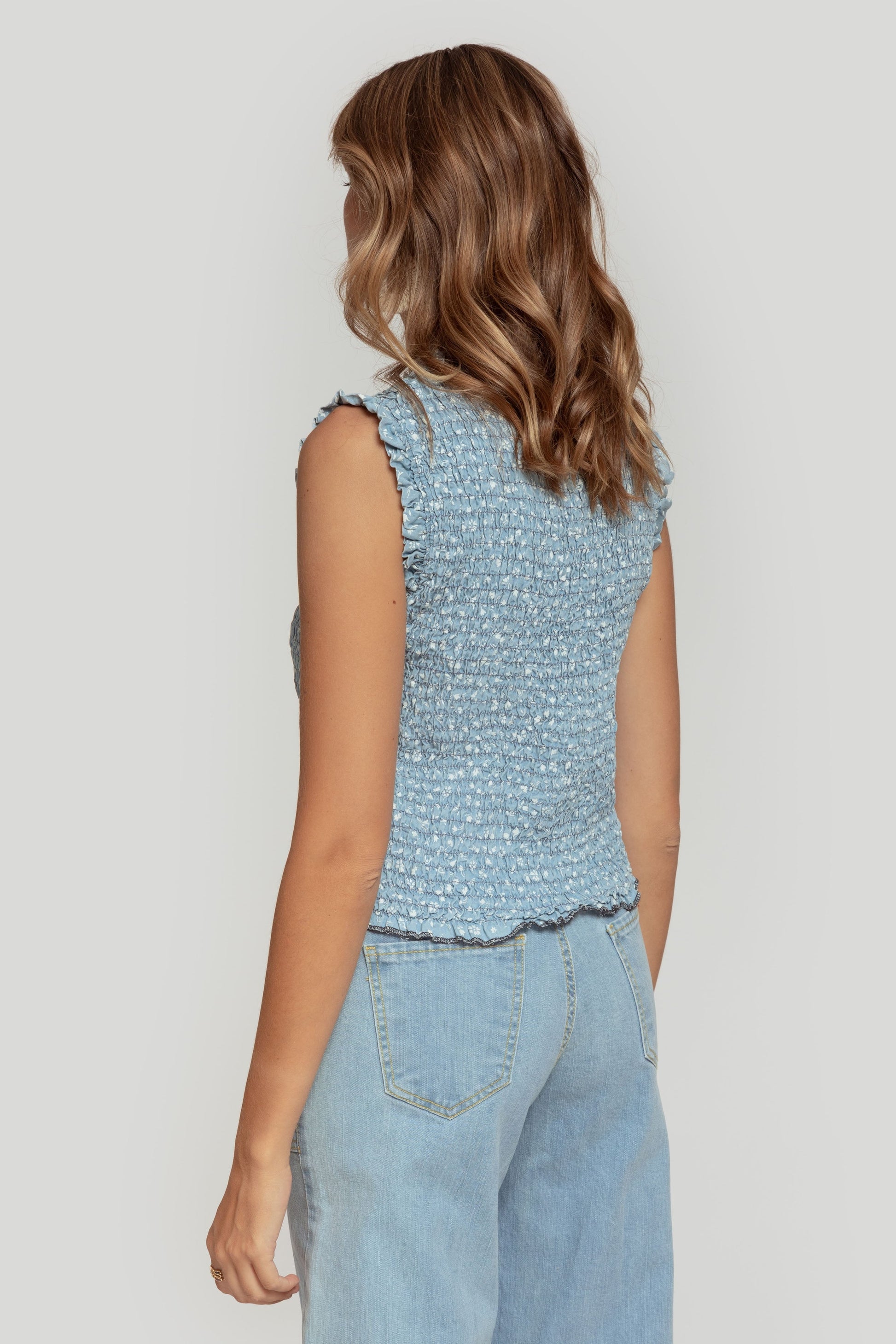 Tejido tencel. Tejido elástico. Diseño estampado. Diseño recto. Escote pico. Manga sisa. Acabado festoneado. Talla modelo: S. Altura modelo: 1,70 m.