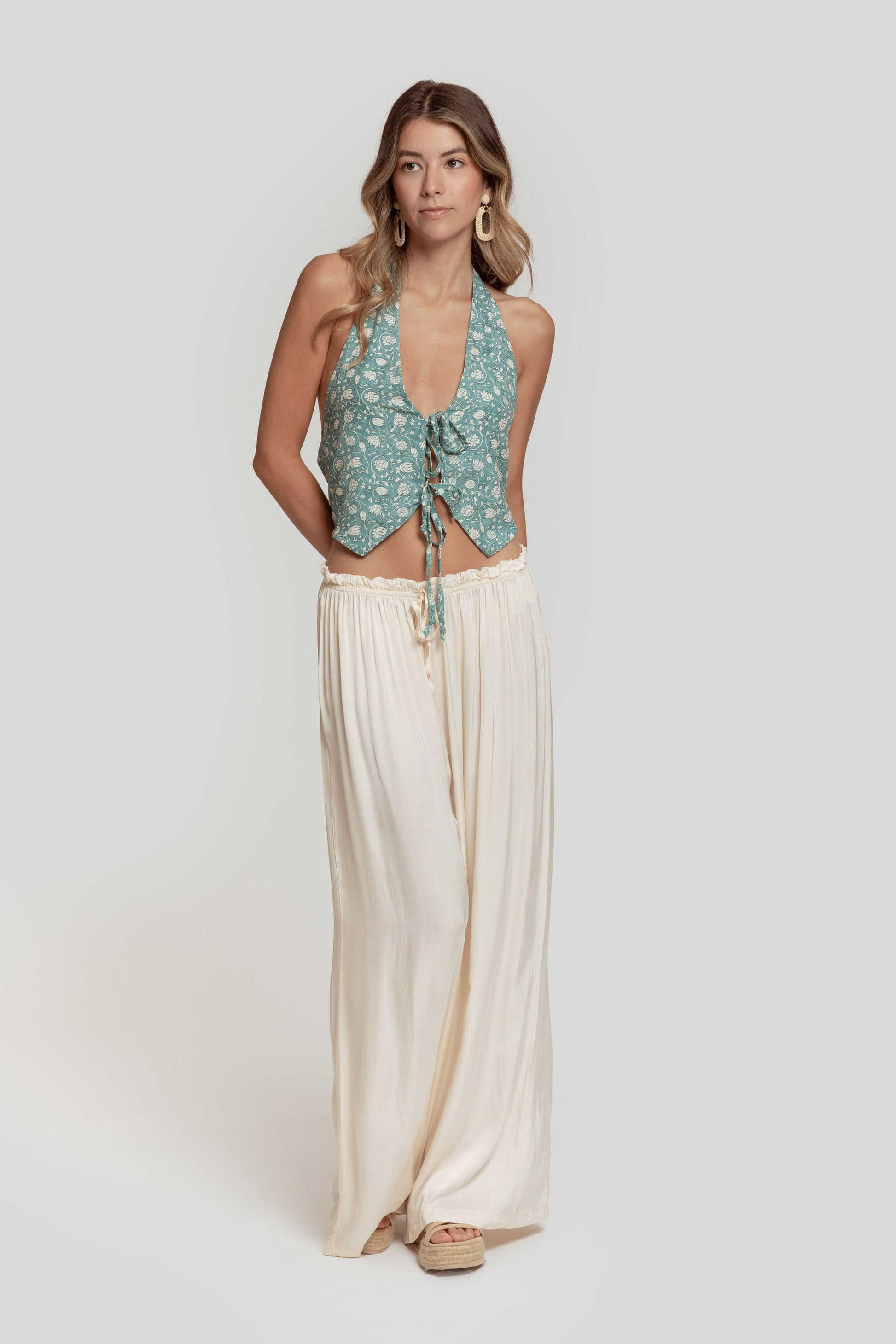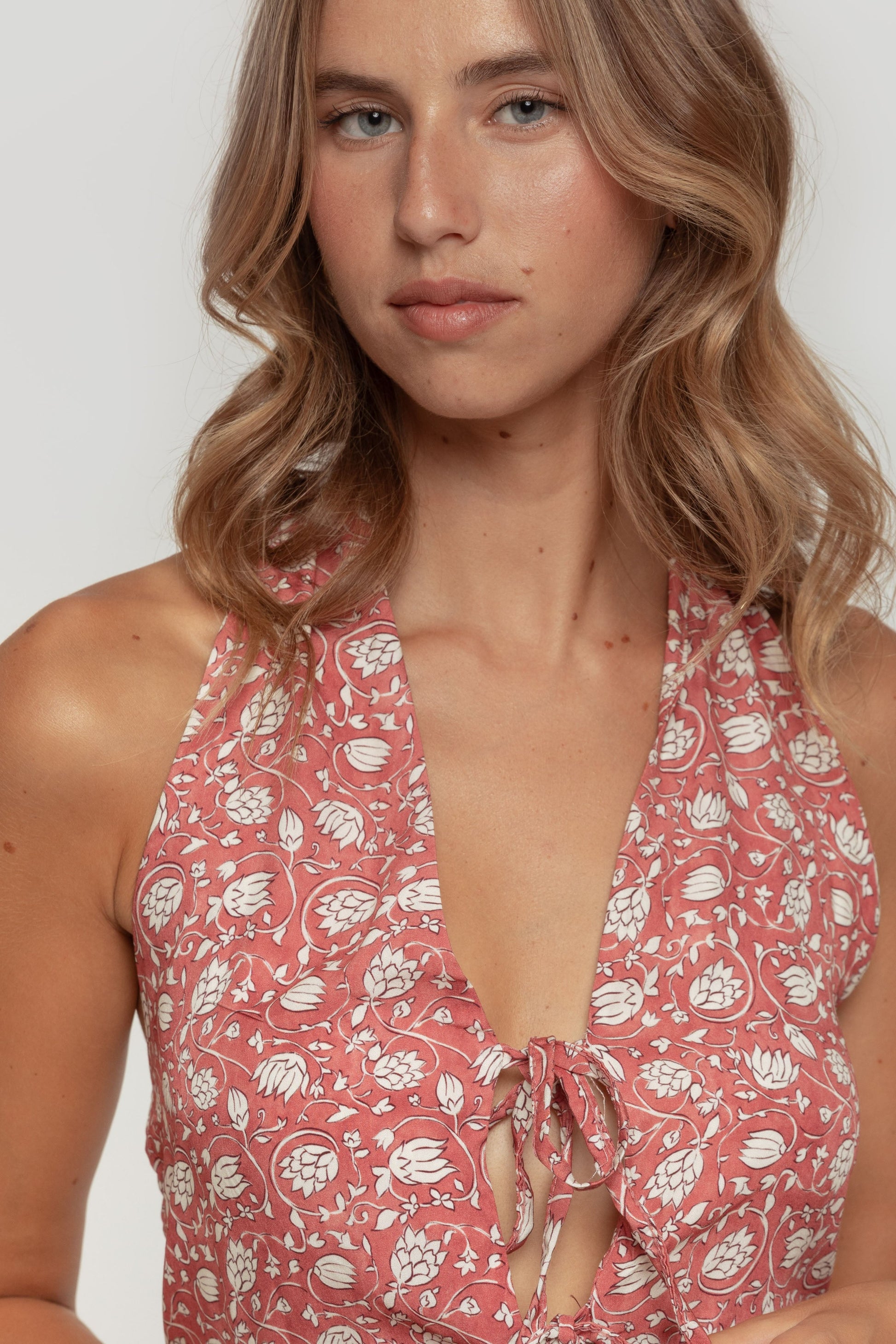 Tejido fluido. Diseño estampado. Cuello halter. Cierre de lazos. Anudado al cuello. Espalda elástica. Talla modelo: S. Altura modelo: 1,70 m.