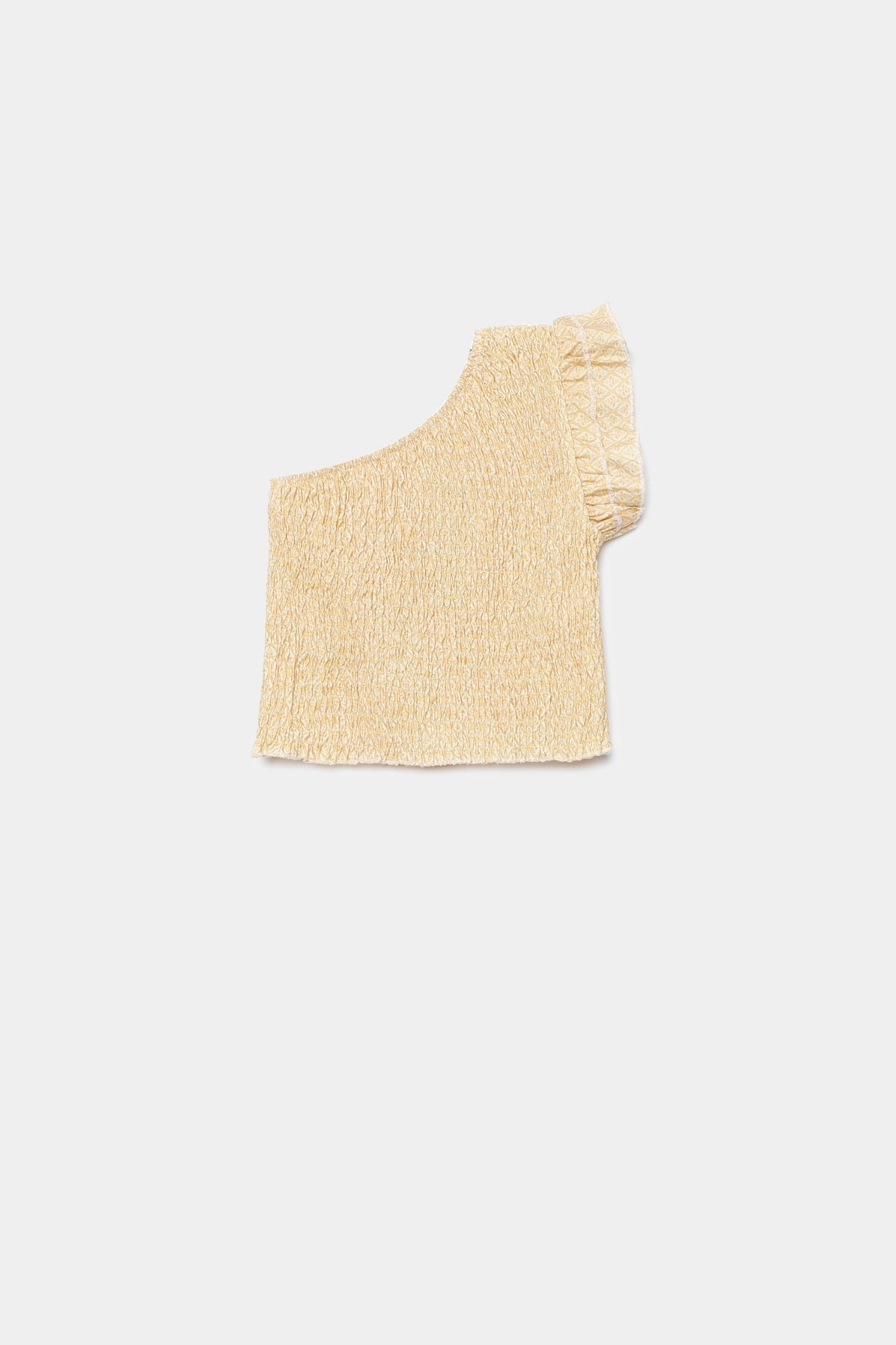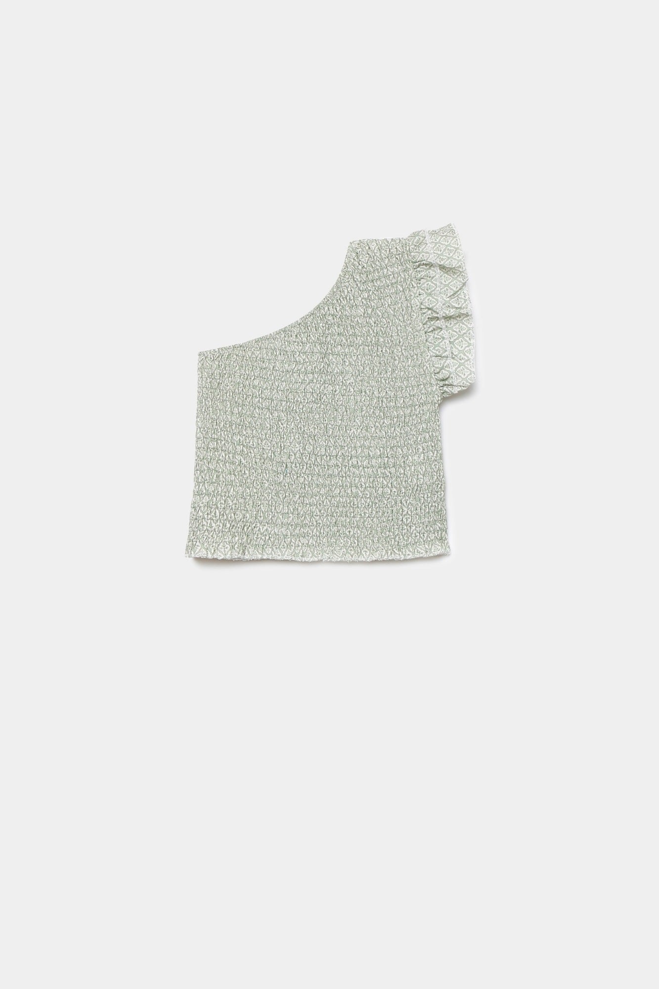 Tejido estampado. Diseño crop. Cuerpo nido. Manga asimétrica. Talla S. Altura modelo: 1.70 m