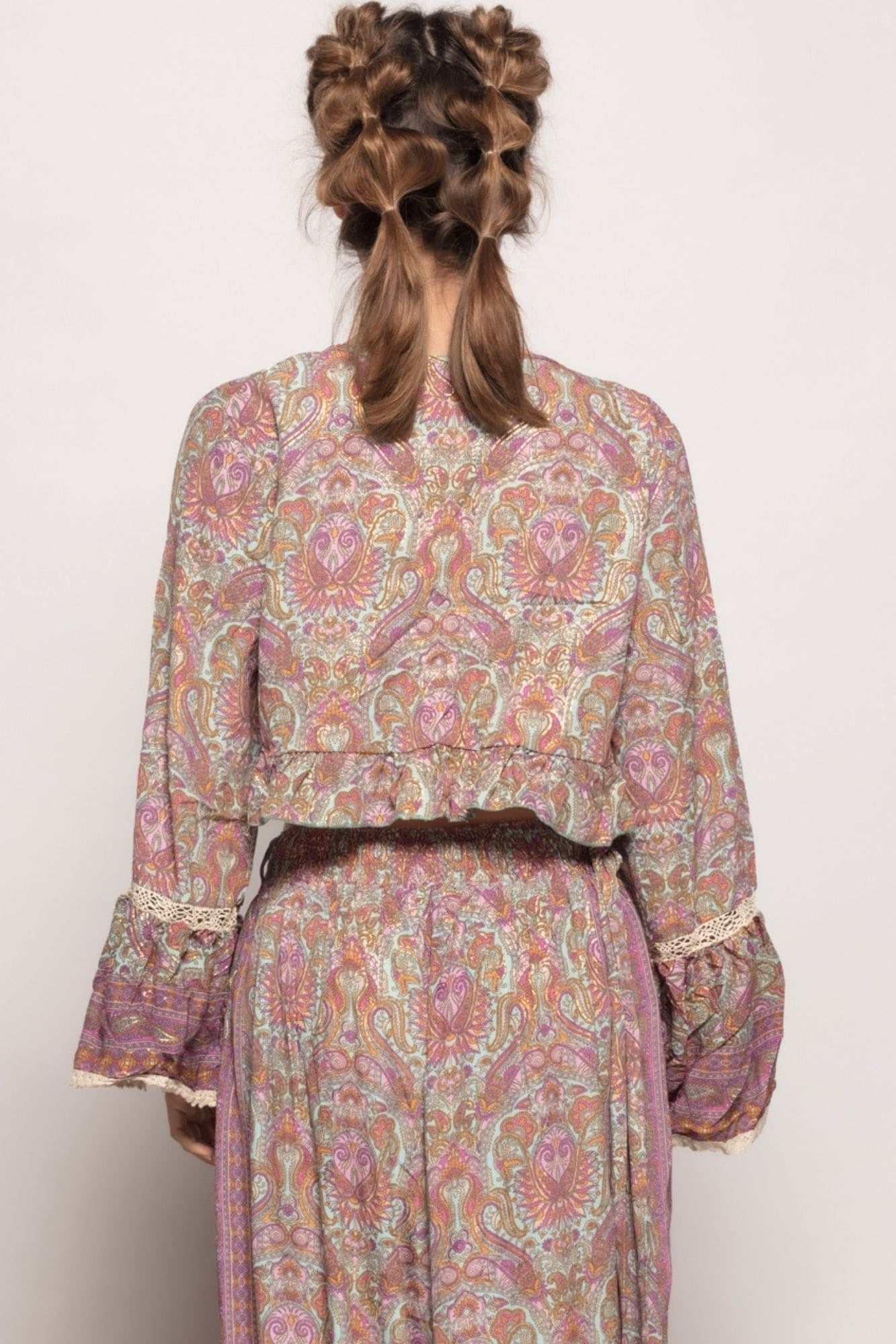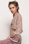 Top estampado boho con detalles metalizados. Tejido de acabado suave. Diseño nudo. Escote pico,. Manga largas amplias con acabado acampanado. Detalles crochet. Largo: 40 cm. Talla modelo: S. Altura modelo: 1,67 m.