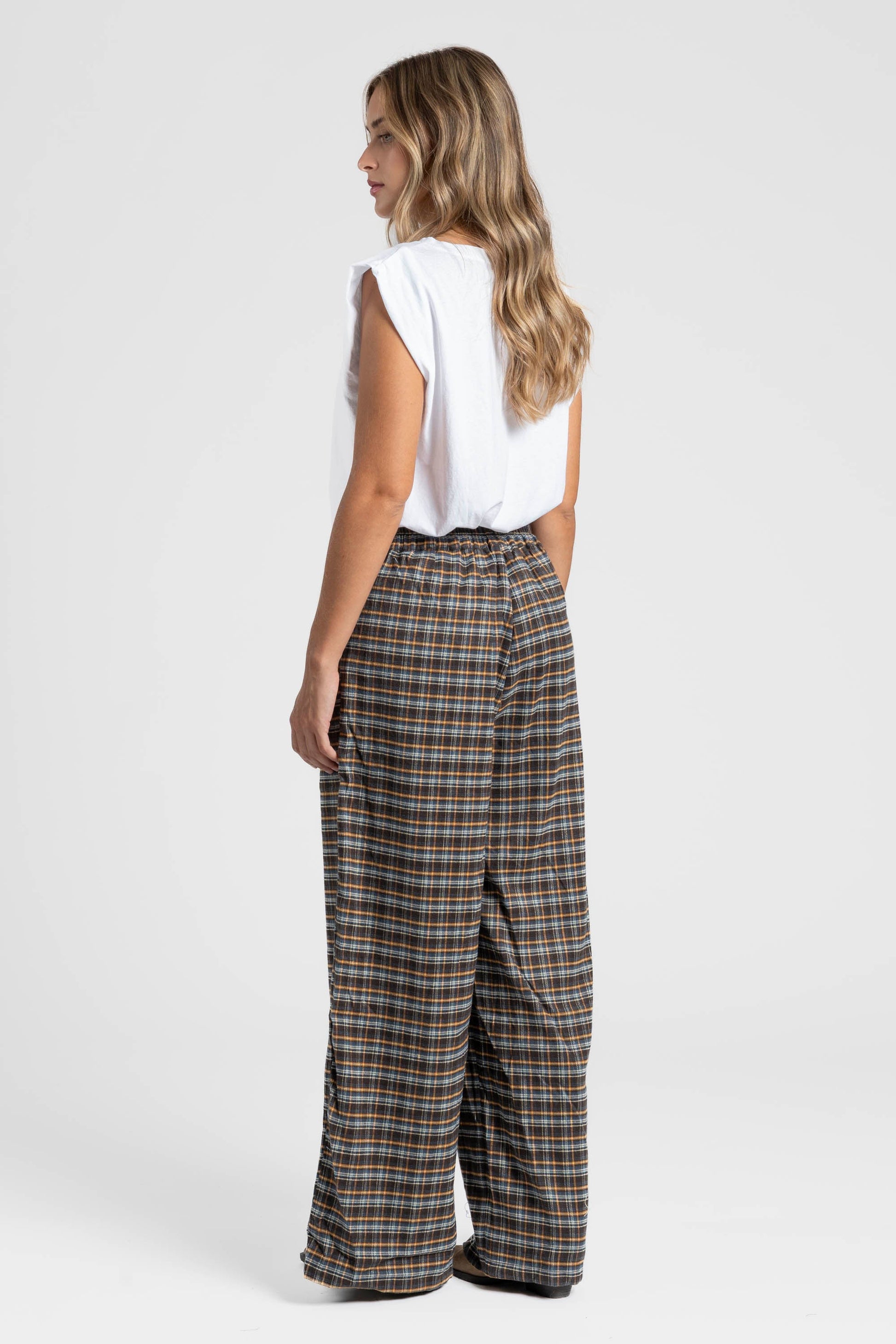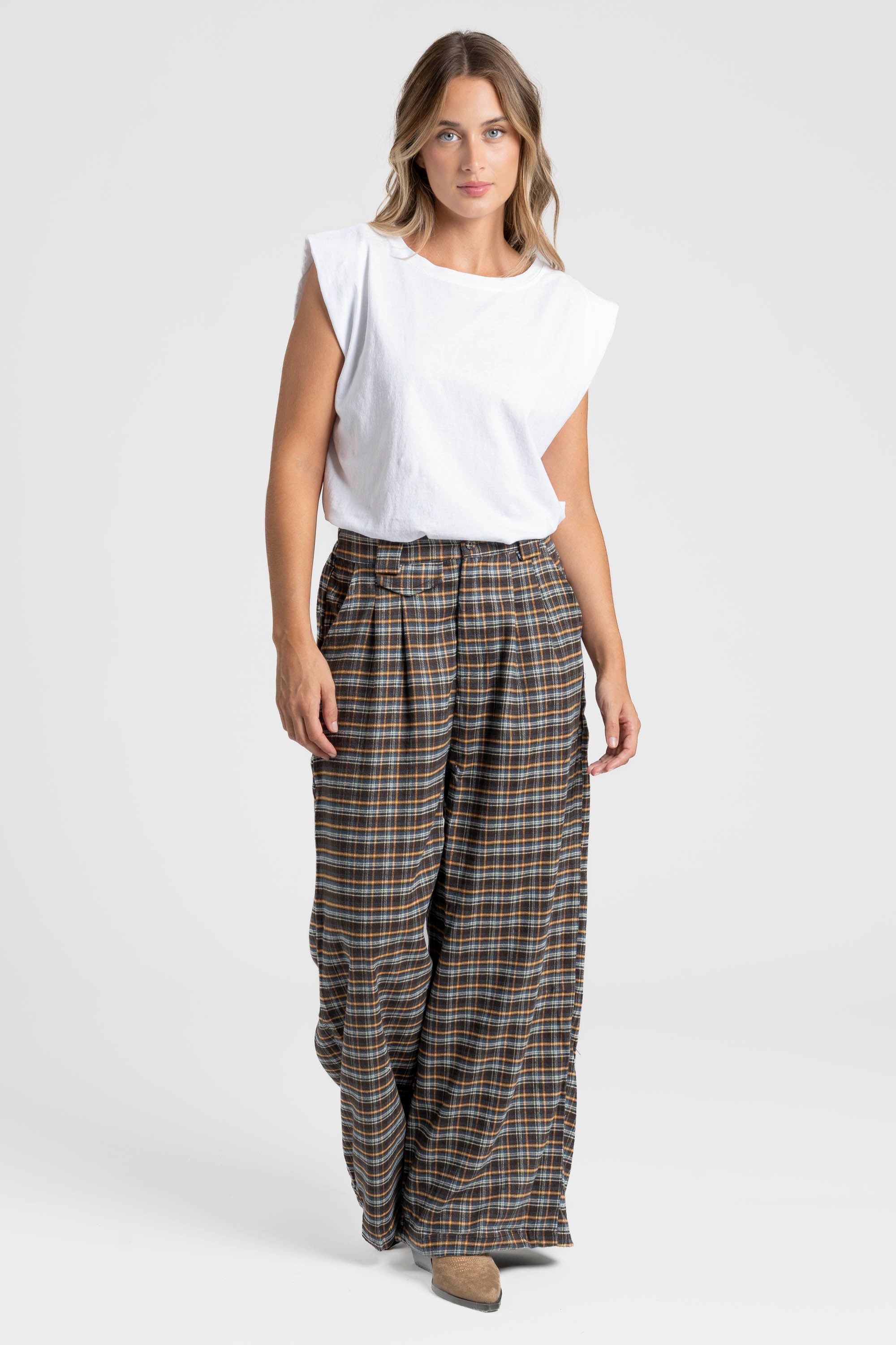 Tejido de algodón. Cintura media. Bolsillos laterales. Pernera ancha. Cierre cremallera.