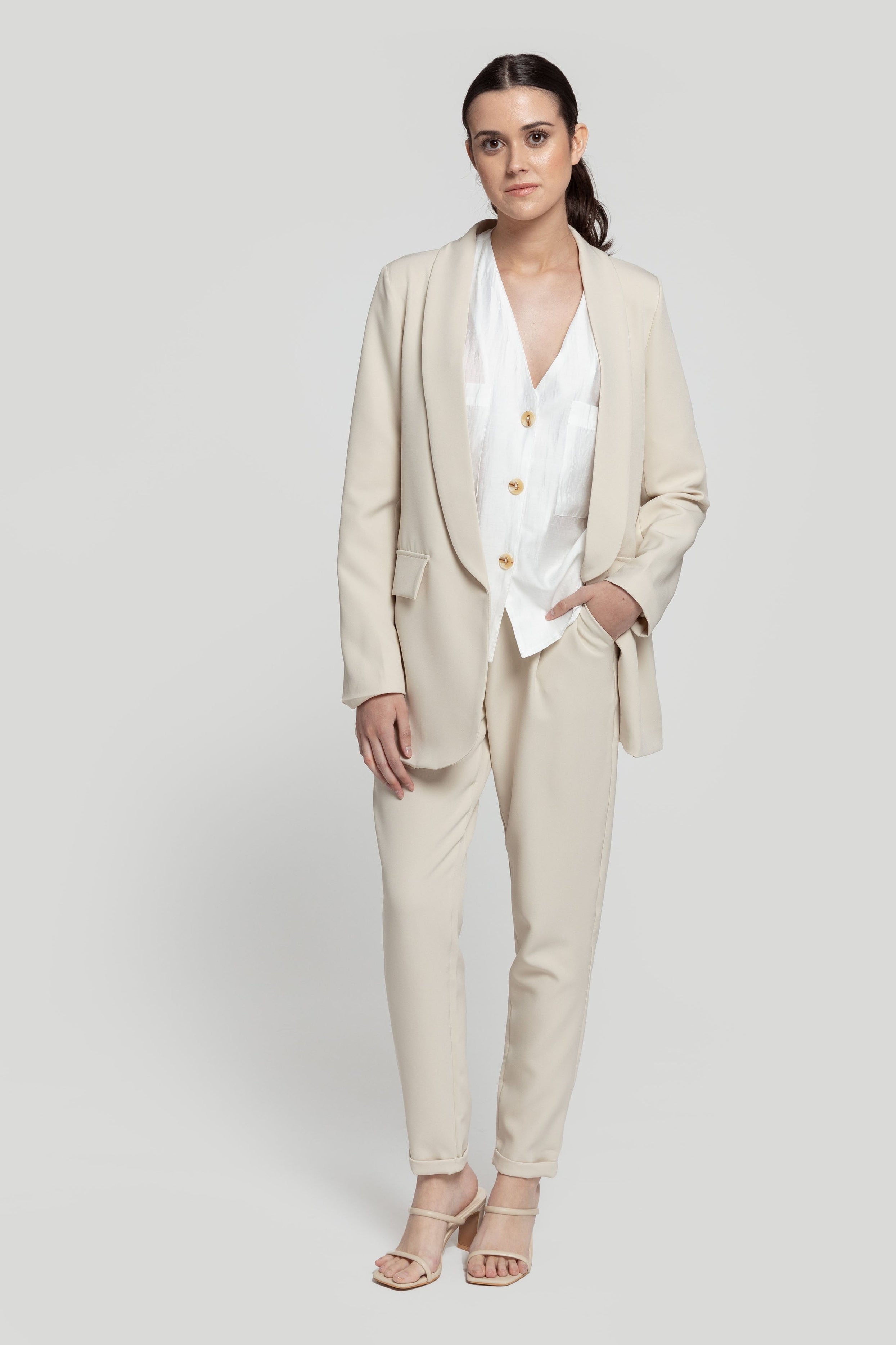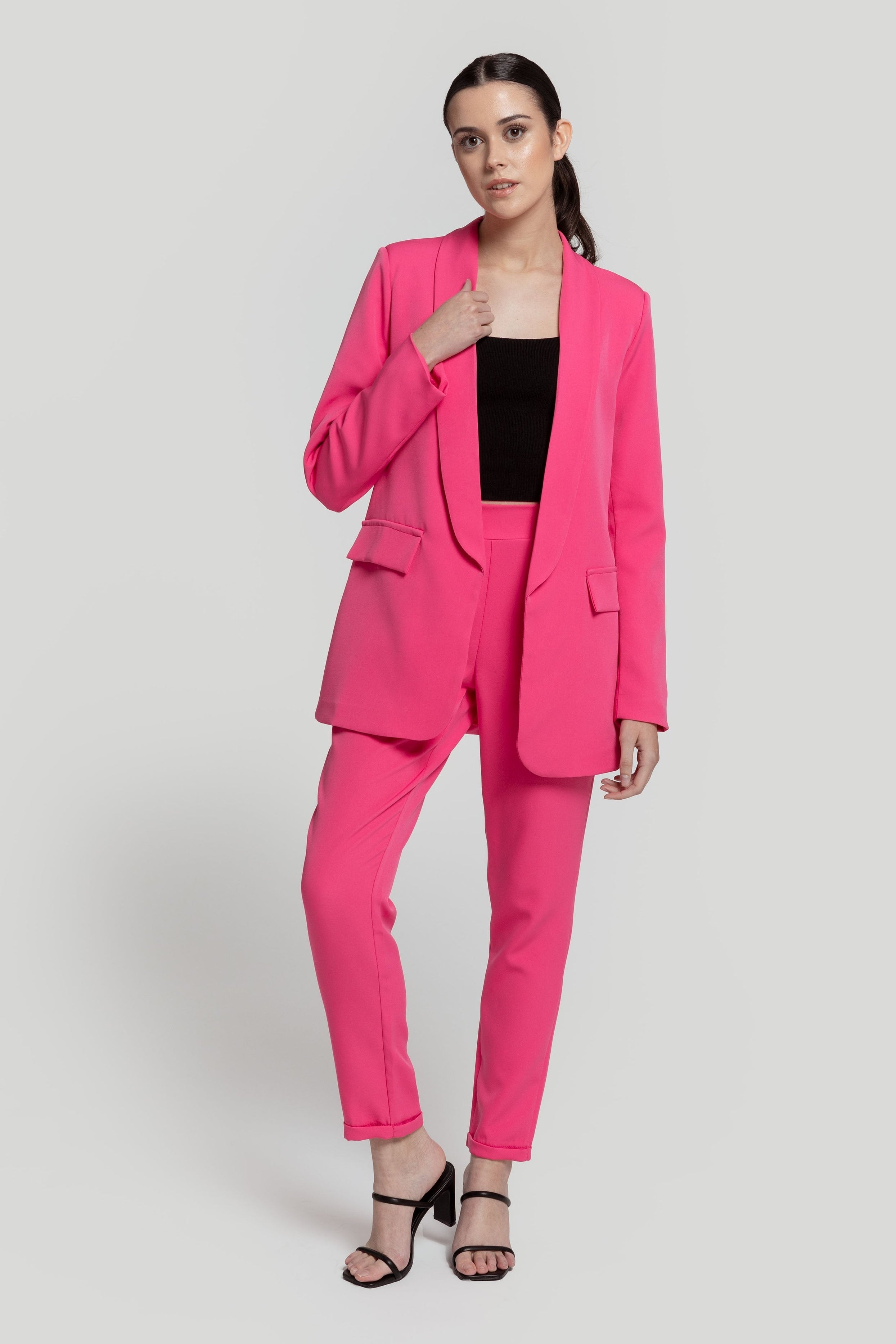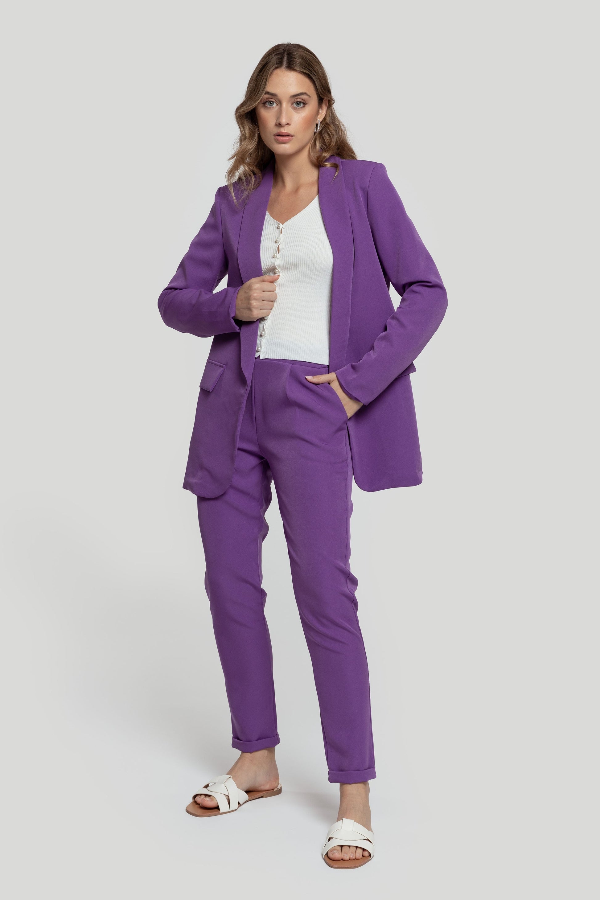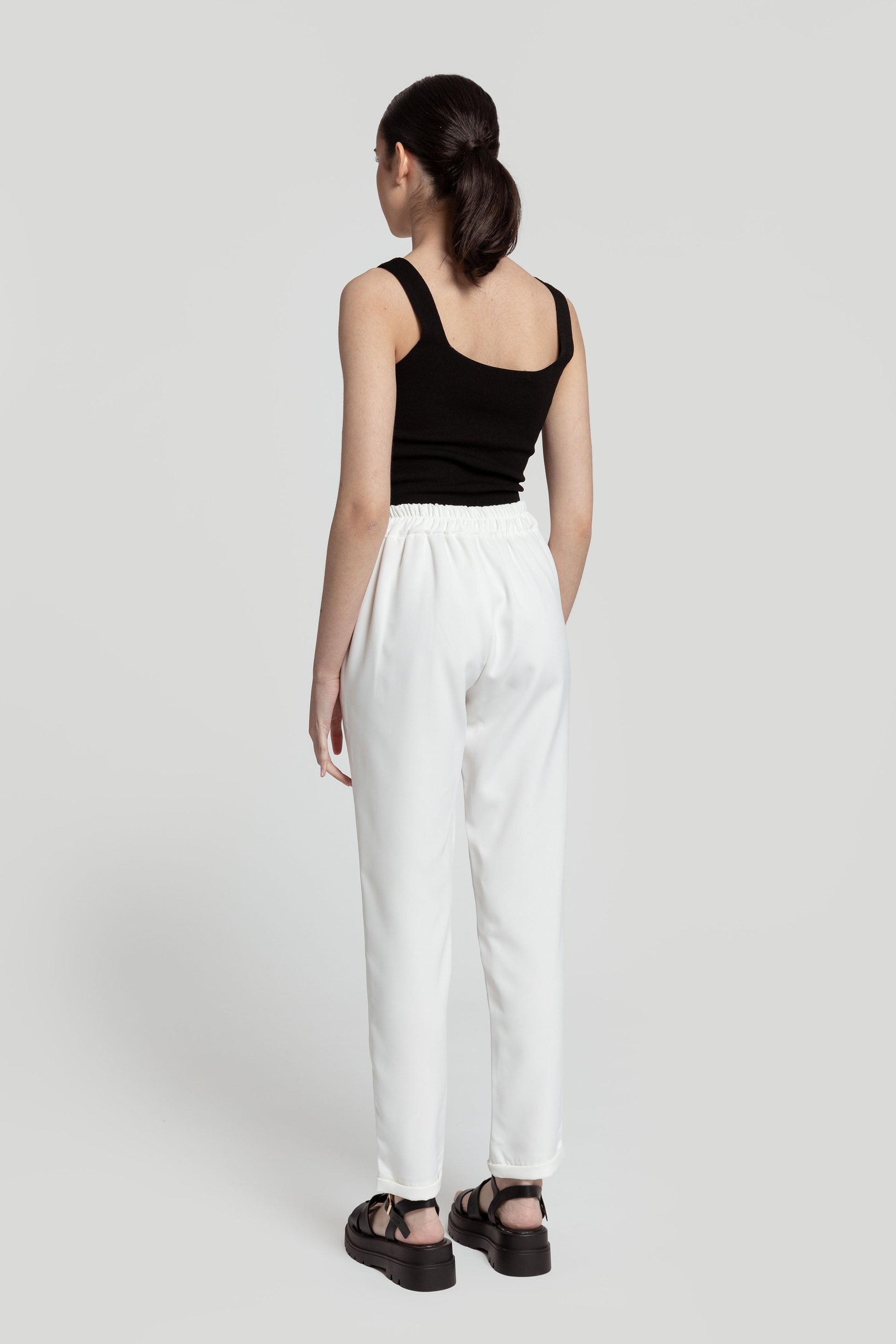 Pantalón de traje. Tejido fluido. Diseño estándar. Diseño recto. Tiro medio. Cintura elástica. Dos bolsillos laterales. Bajo tobillero. Talla modelo: S. Altura modelo 1, 67 m.