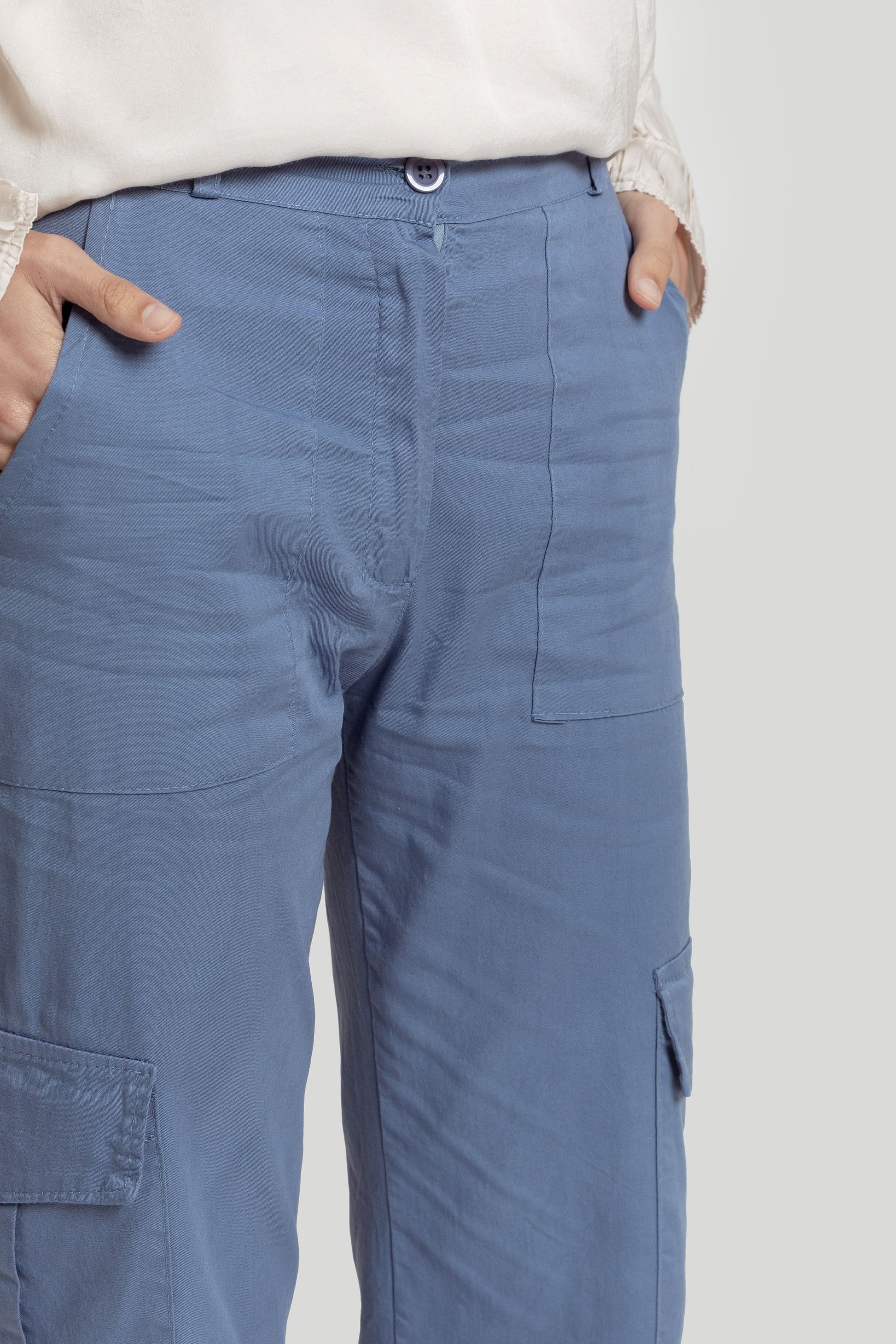Pantalón básico. Tejido mezcla de algodón. Tejido ligero. Tejido elástico. Diseño cargo. Tiro alto. Trabillas. Cierre de cremallera y botón. Bolsillo laterales.. Talla modelo: S. Altura modelo: 1.70 m