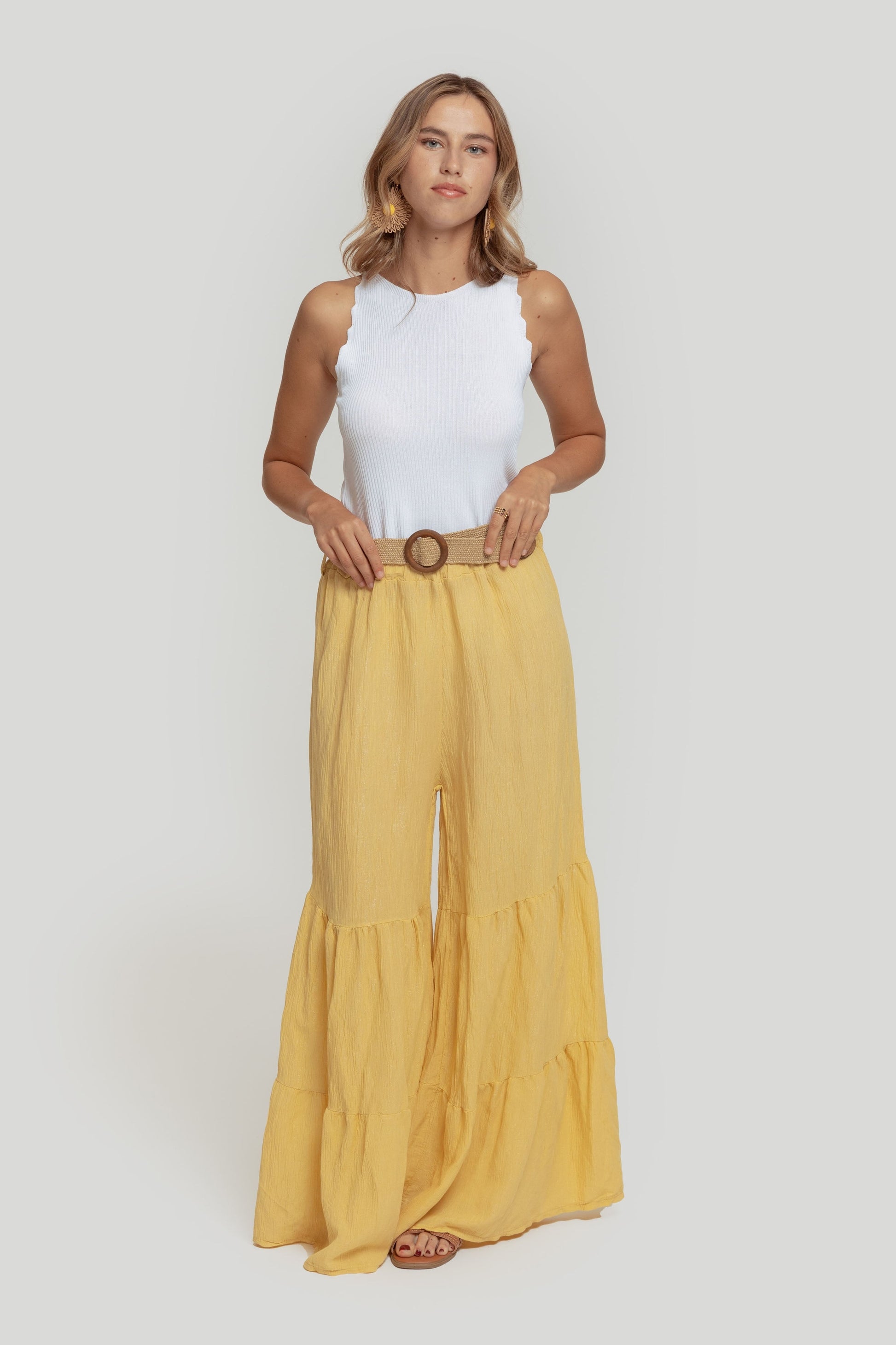 Tejido con textura. Tejido brillo. Diseño flare. Tiro alto. Cintura elástica. Incluye cinturón. Talla modelo: S. Altura modelo 1,70 m.