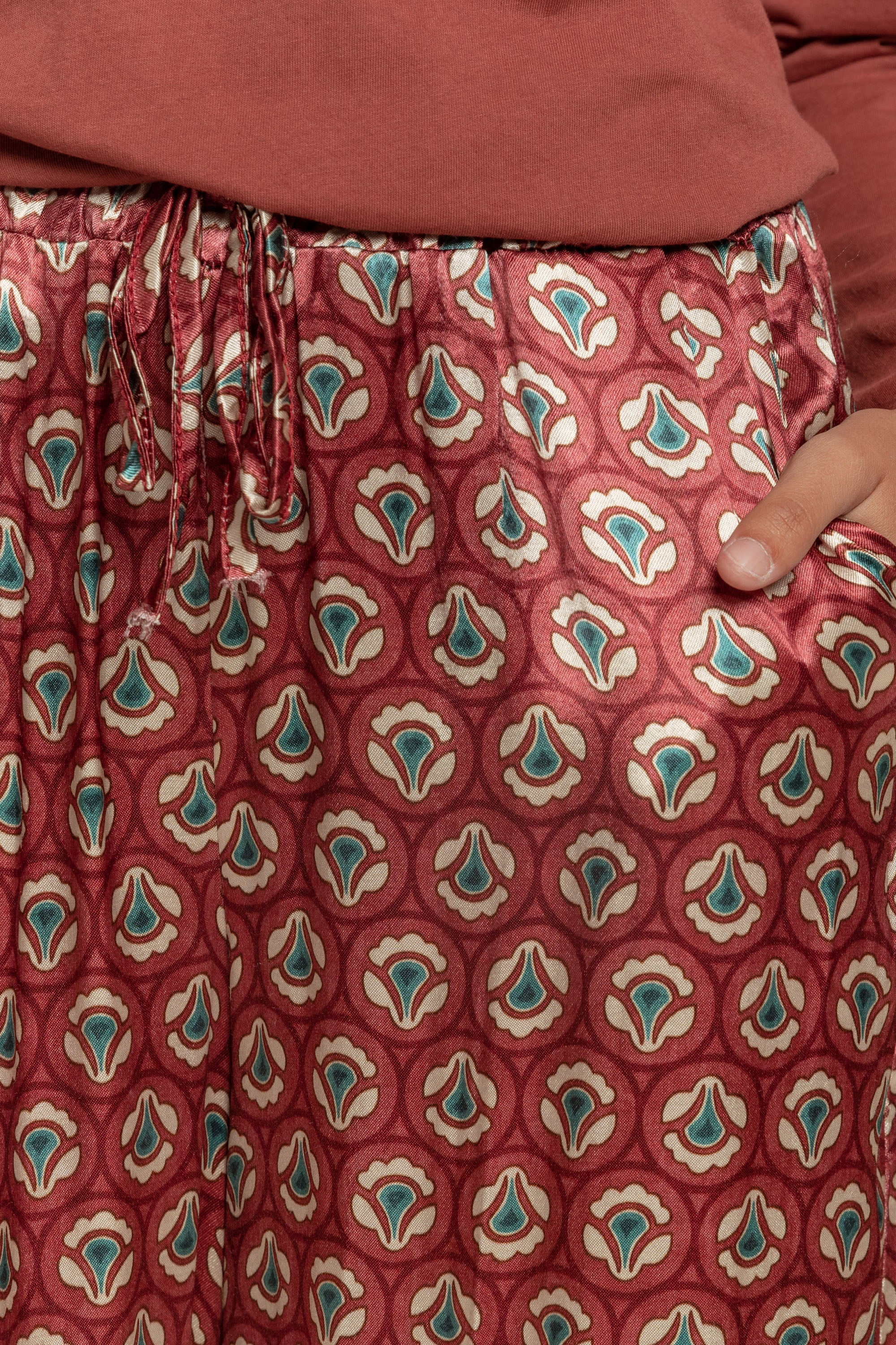 Tejido satinado. Diseño amplio. Diseño recto. Tiro alto. Cintura elástica. Perneras amplias. Tira decorativa.