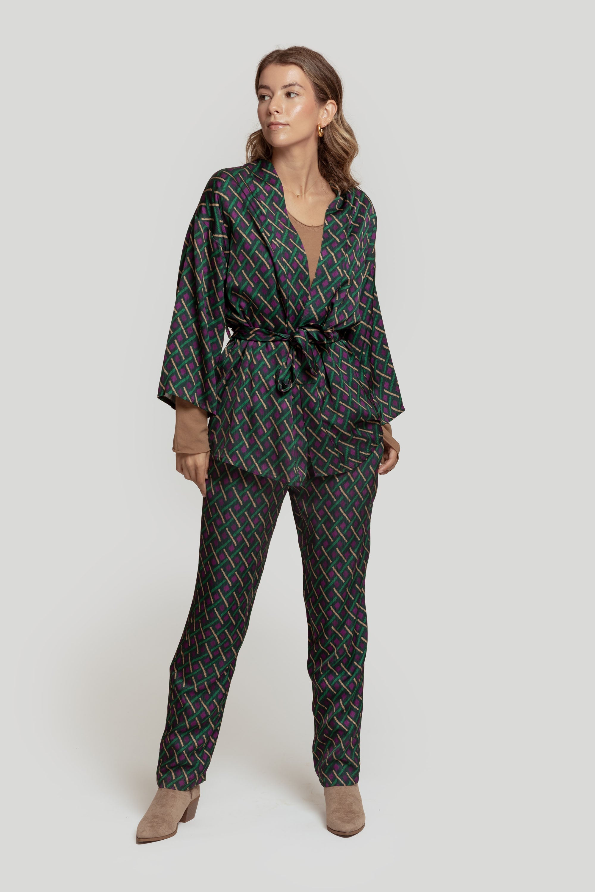 Tejido satinado. Diseño estampado. Diseño recto. Diseño maxi. Diseño wideleg. Tiro alto. Cintura elástica. Talla modelo: S. Altura modelo: 1.70 m.