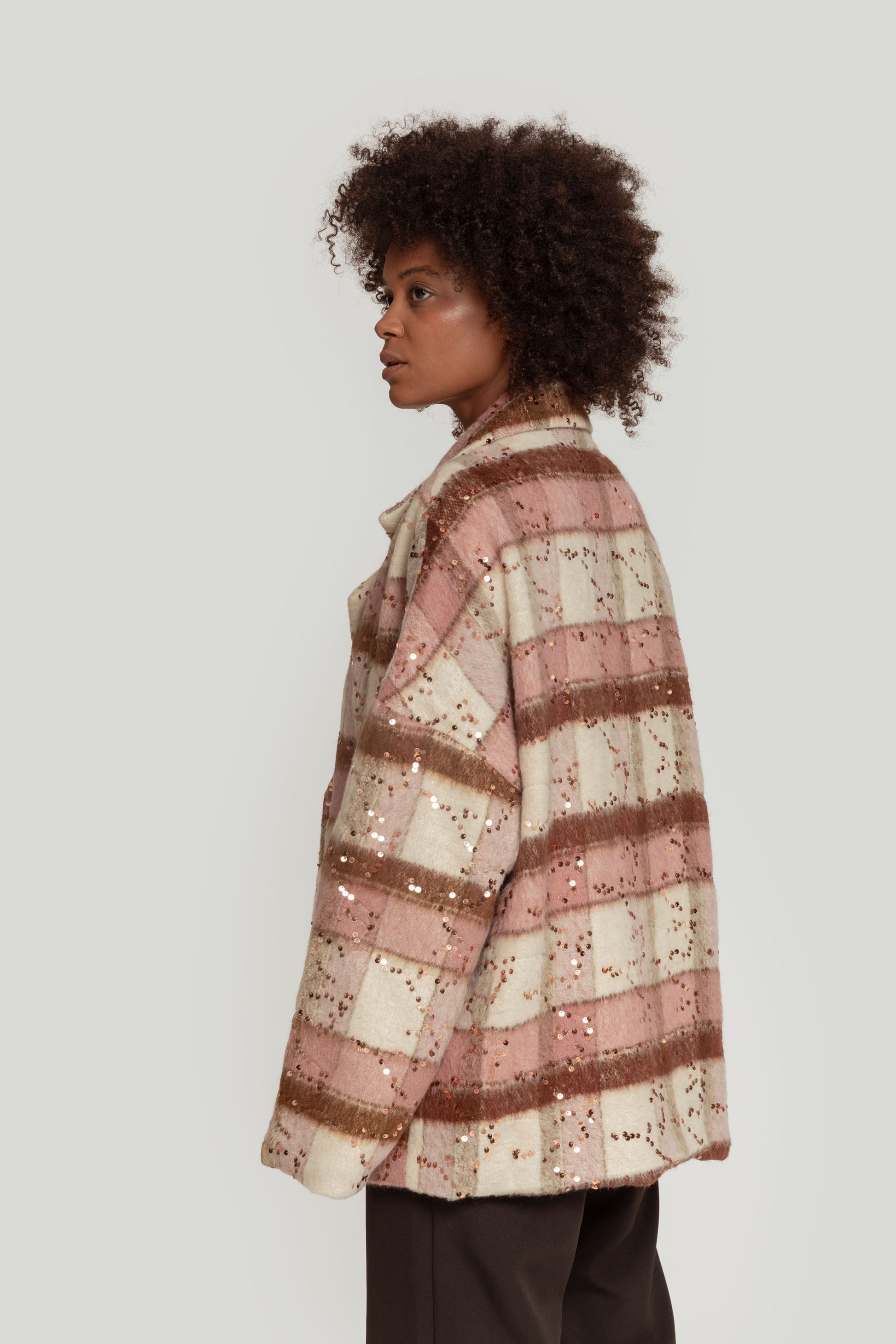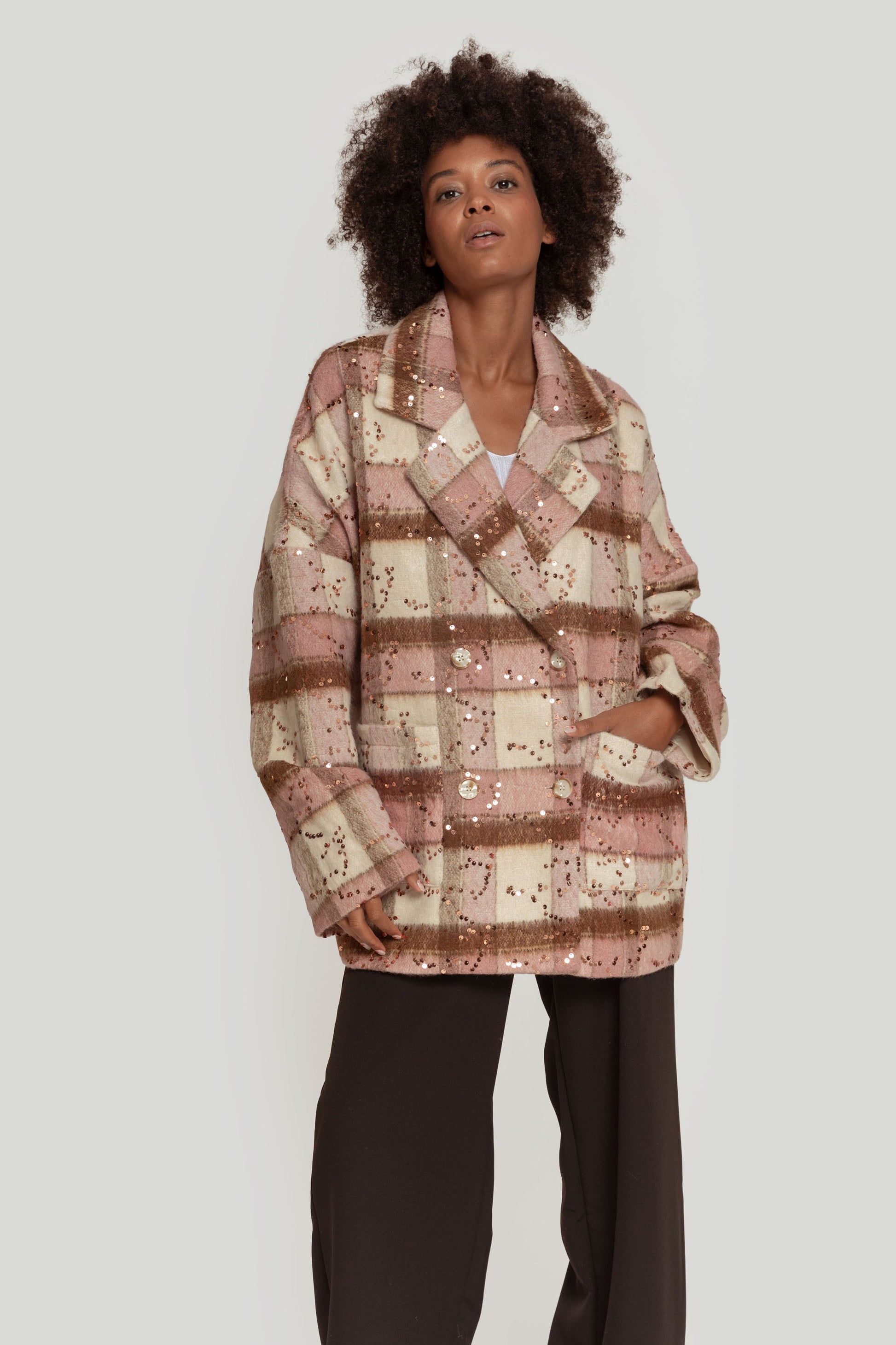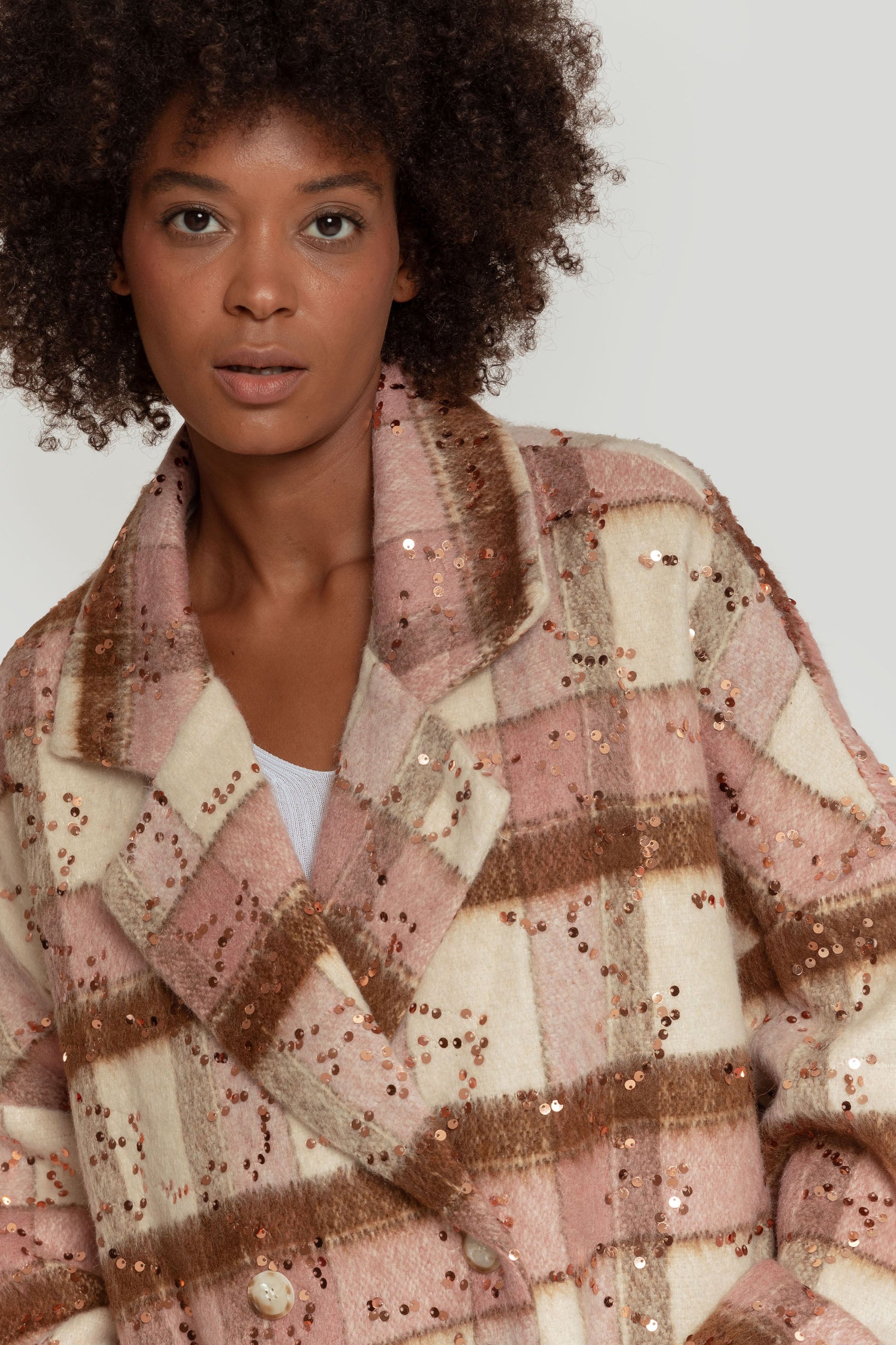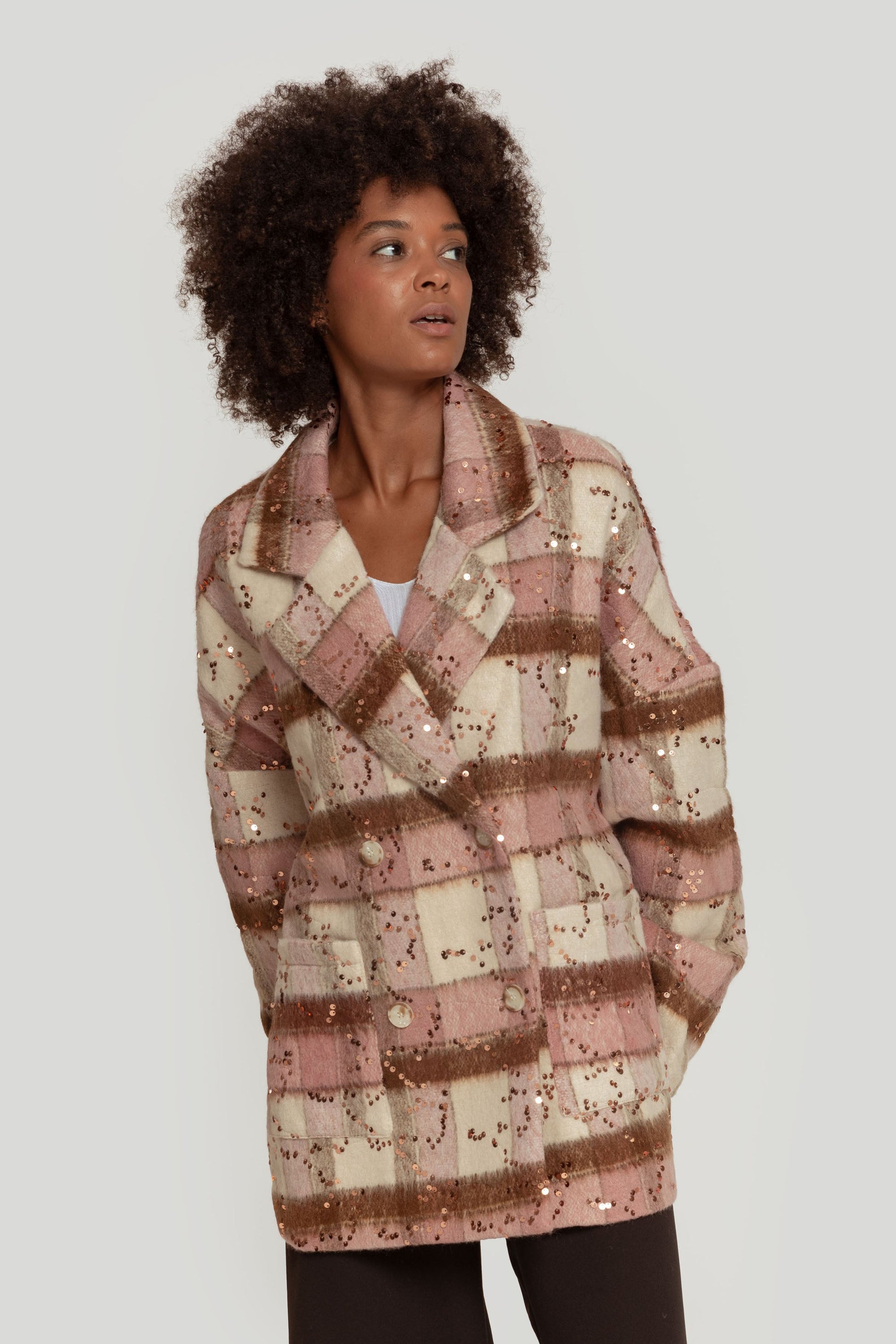 Diseño cruzado. Diseño estampado. Diseño oversize. Diseño recto. Cuello de solapa. Manga larga. Bolsillos de solapa. Cierre de botones. Detalles lentejuelas. Acabado pelos. Forrado. Talla única. Altura modelo 1,66 m.