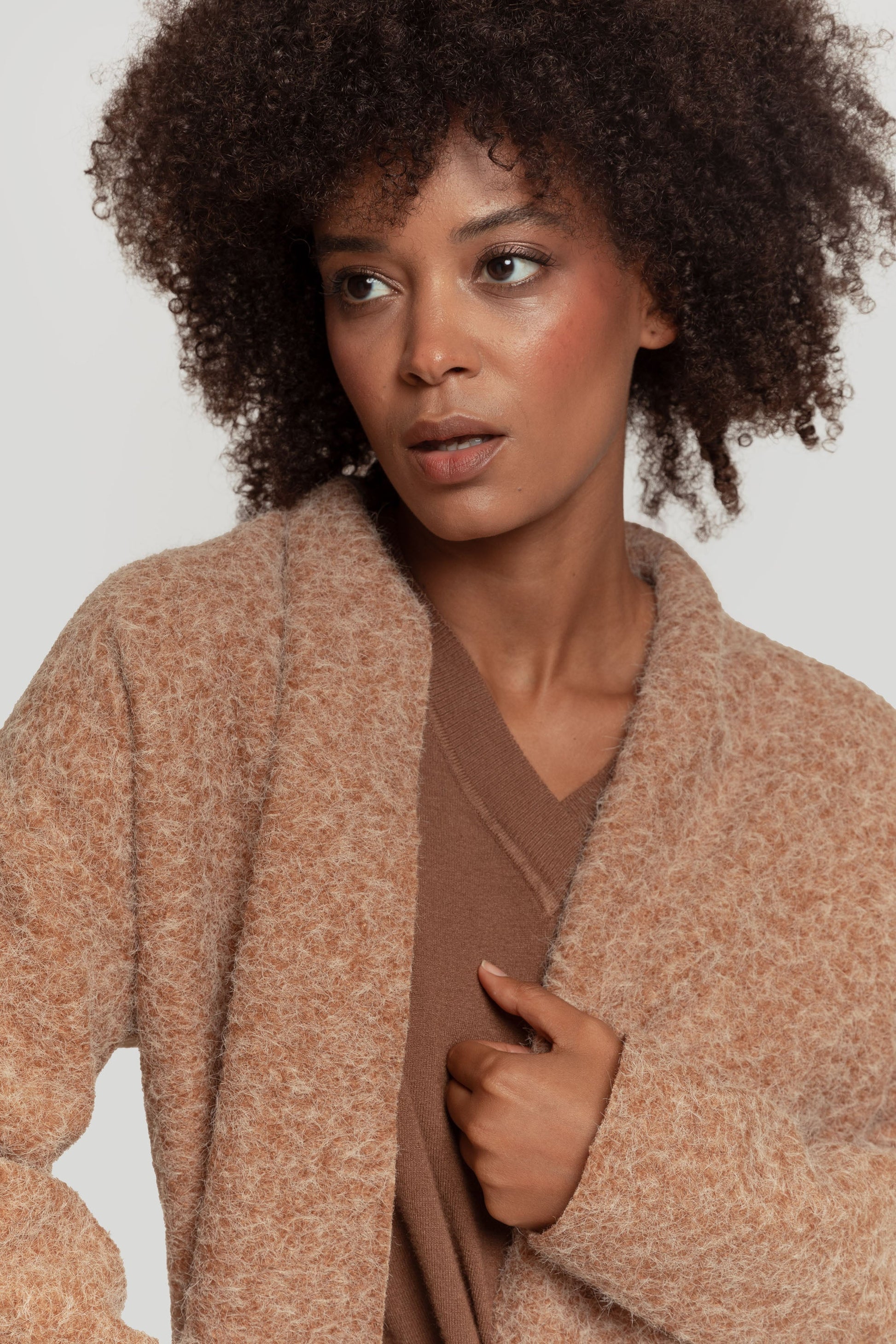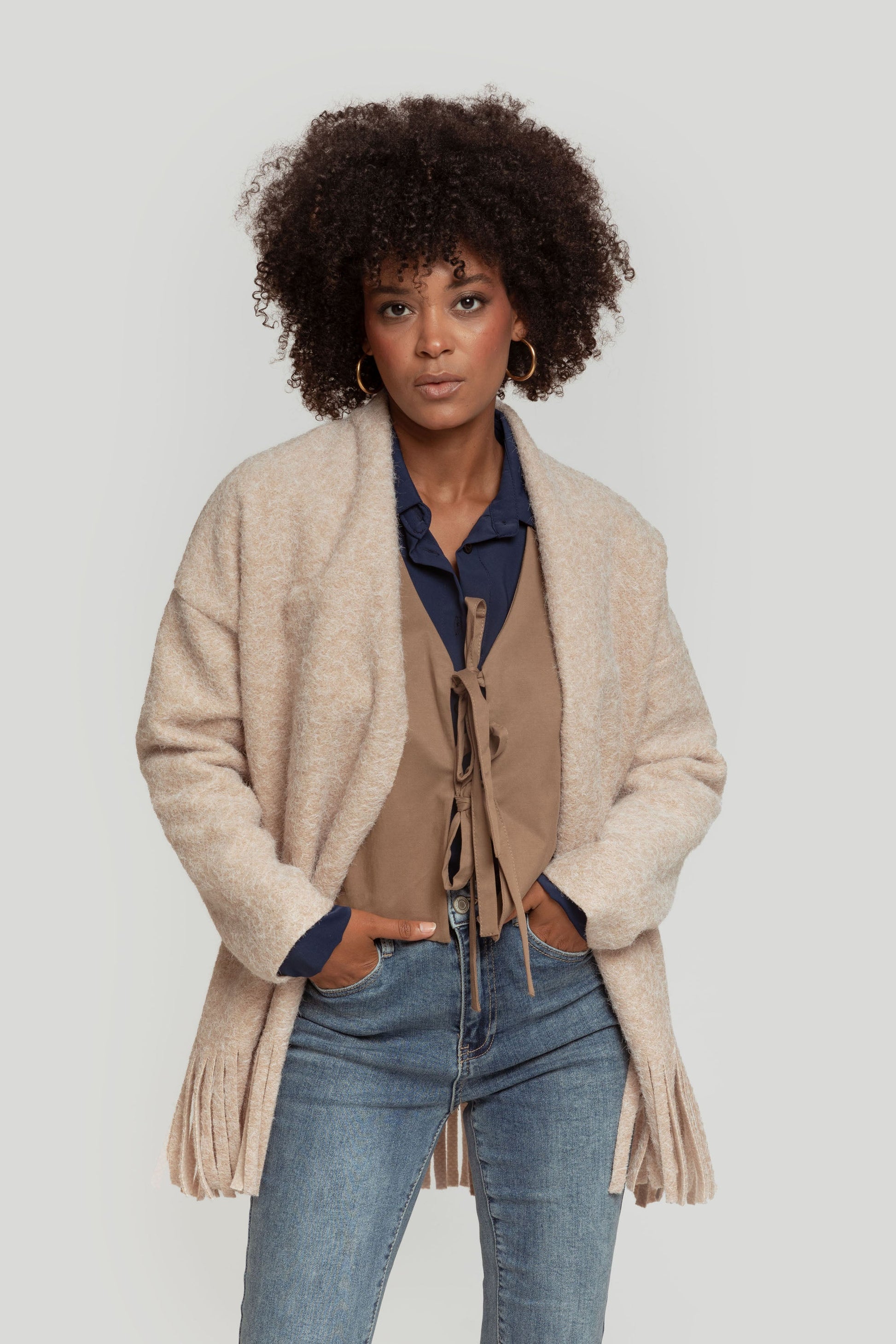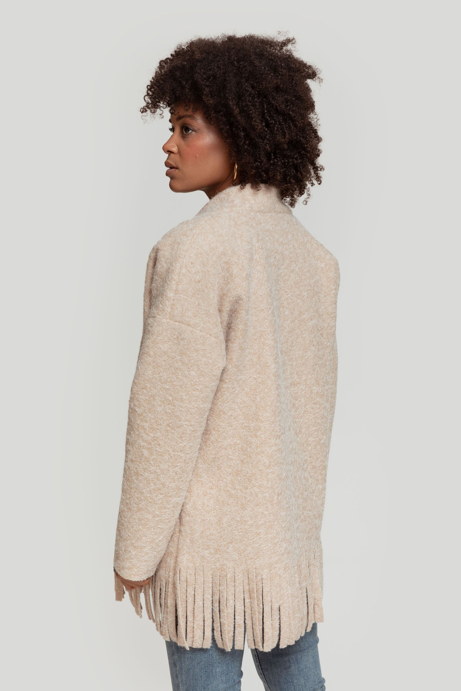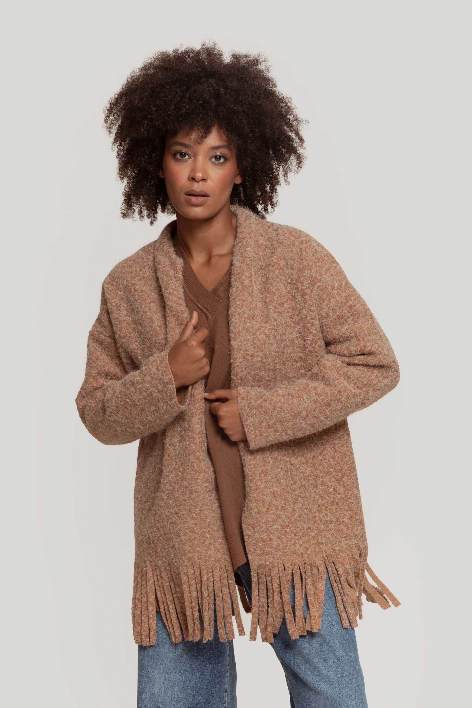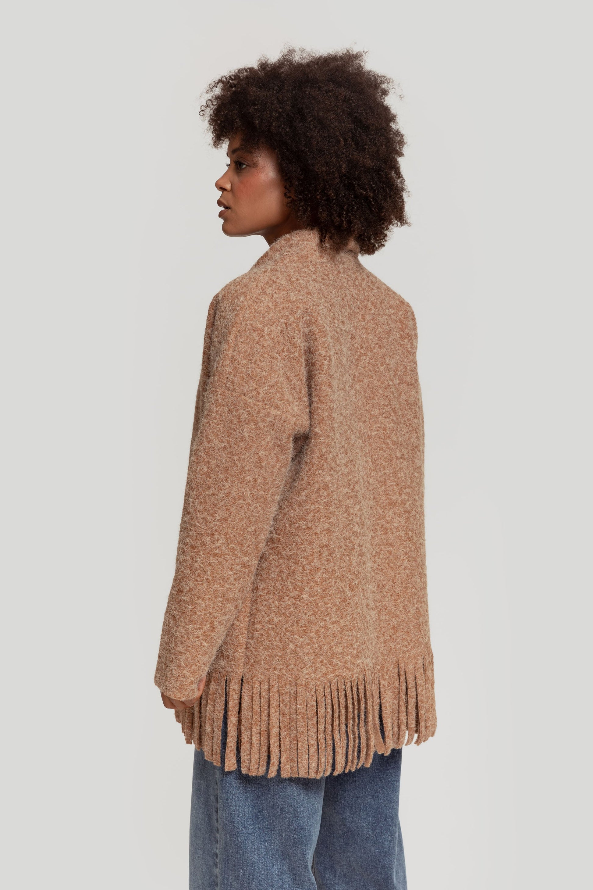 Tejido pelos. Diseño oversize. Diseño capa. Manga larga. Sin cierre. Bajo flecos. No forrado. Talla modelo: S. Altura modelo: 1,66 m.