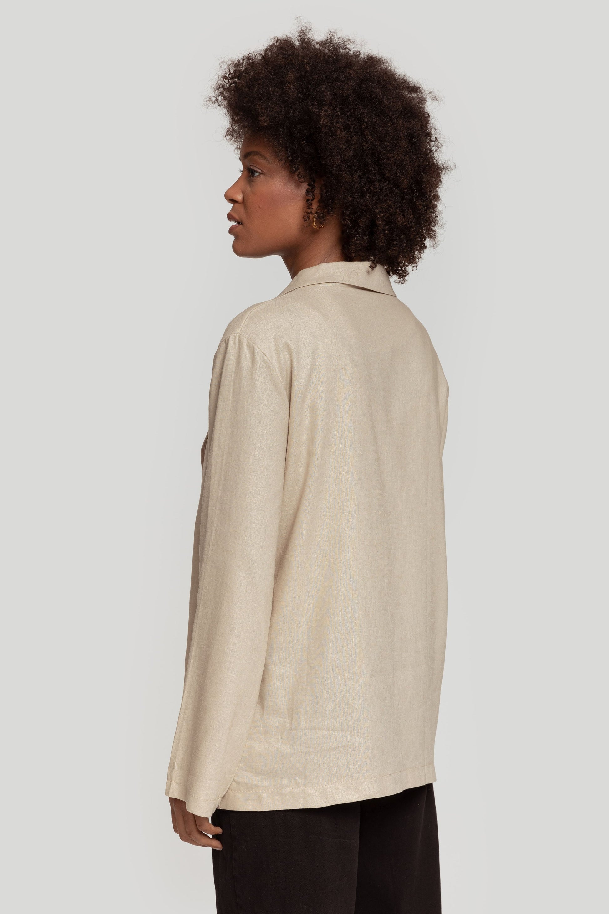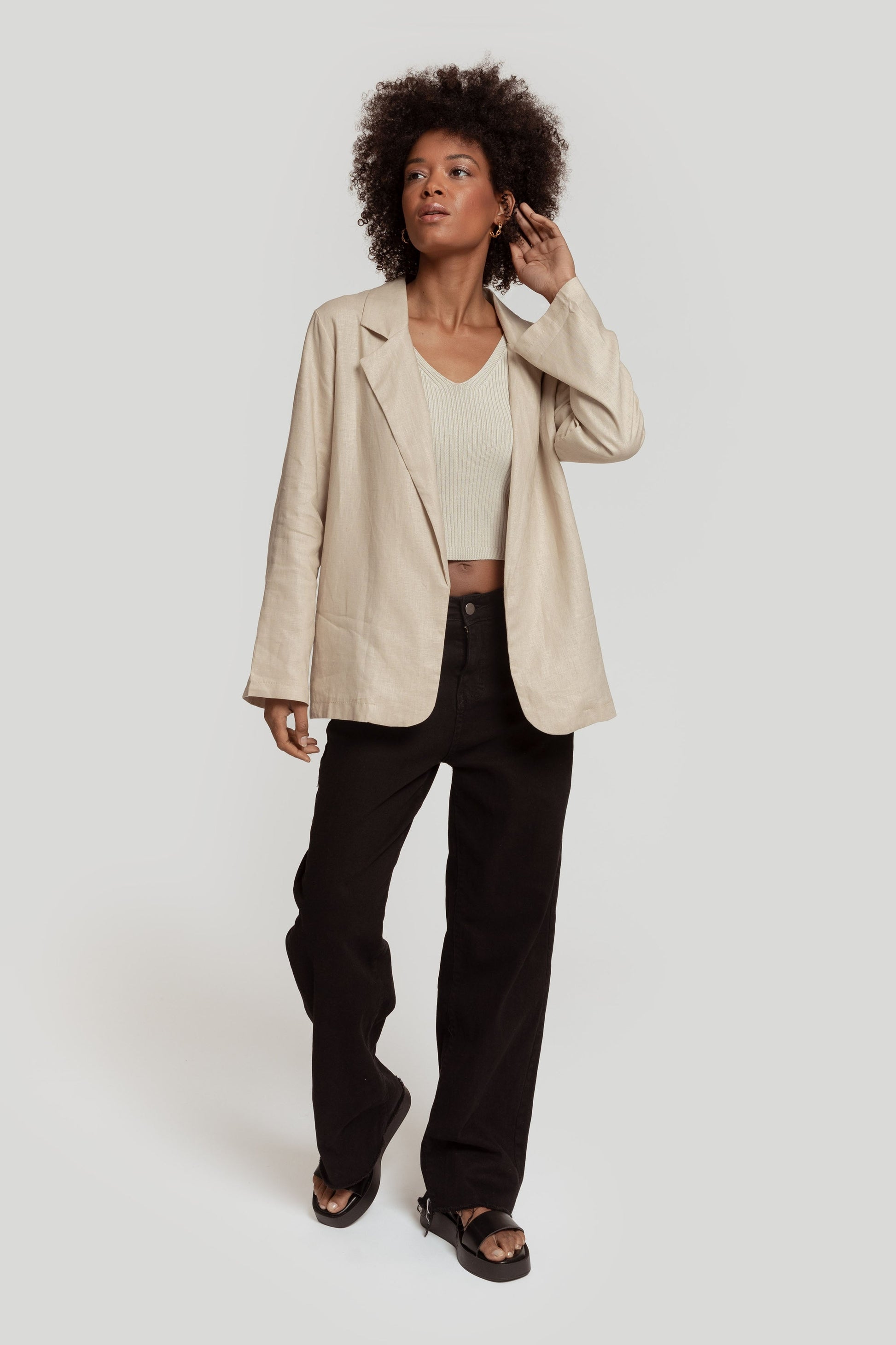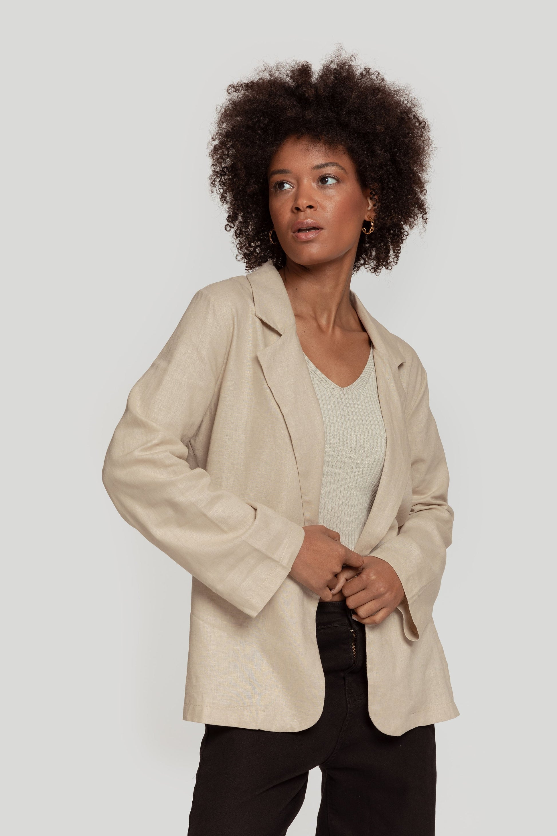 Tejido mezcla lino. Estilo blazer. Diseño recto. Diseño entallado. Cuello solapa. Manga larga. Bajo redondeado. Talla modelo: S. Altura modelo 1,65 m.