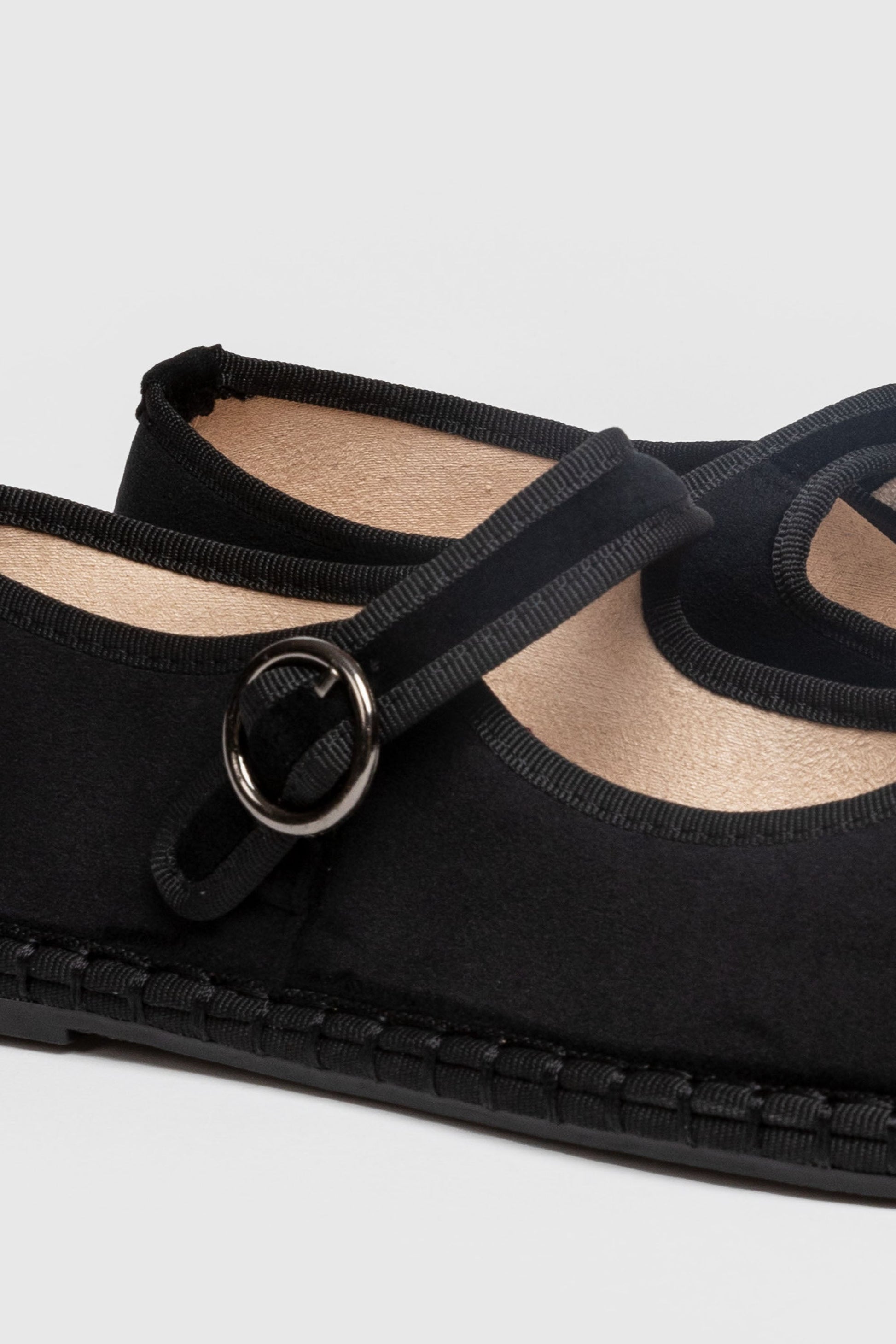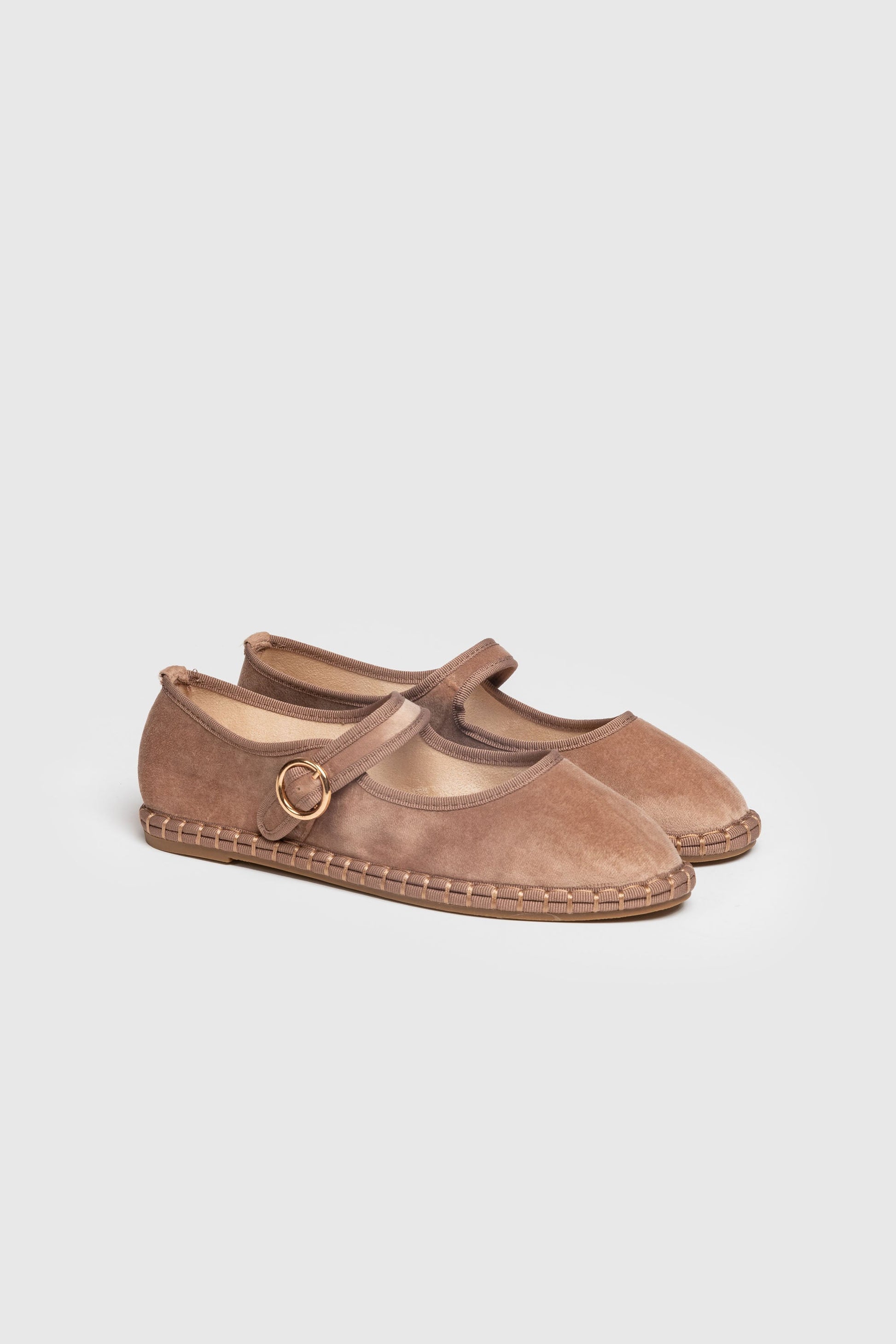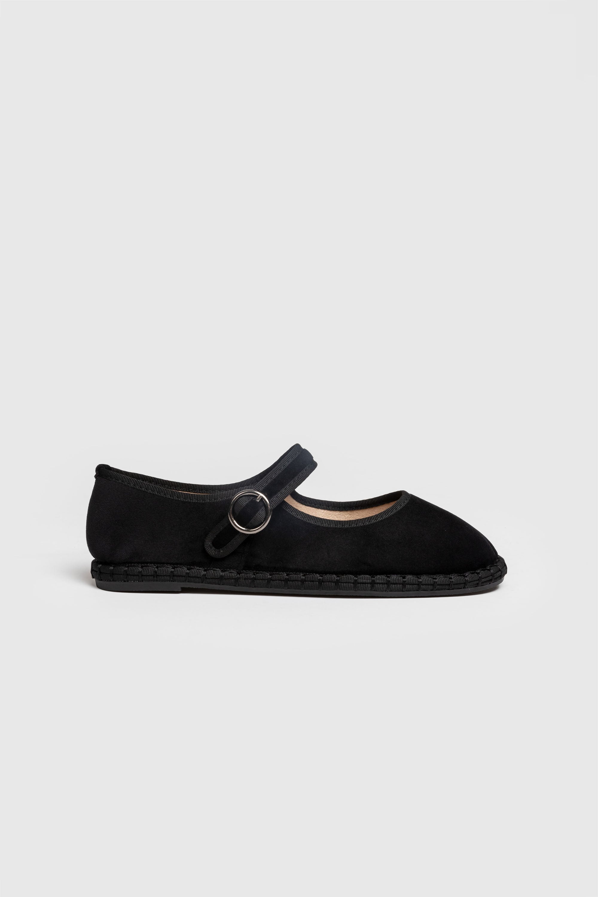 Zapato plano tipo bailarina. Tejido terciopelo. Acabado en punta cuadrada. Cierre de hebilla. Suela plana. Suela de contacto antideslizante.