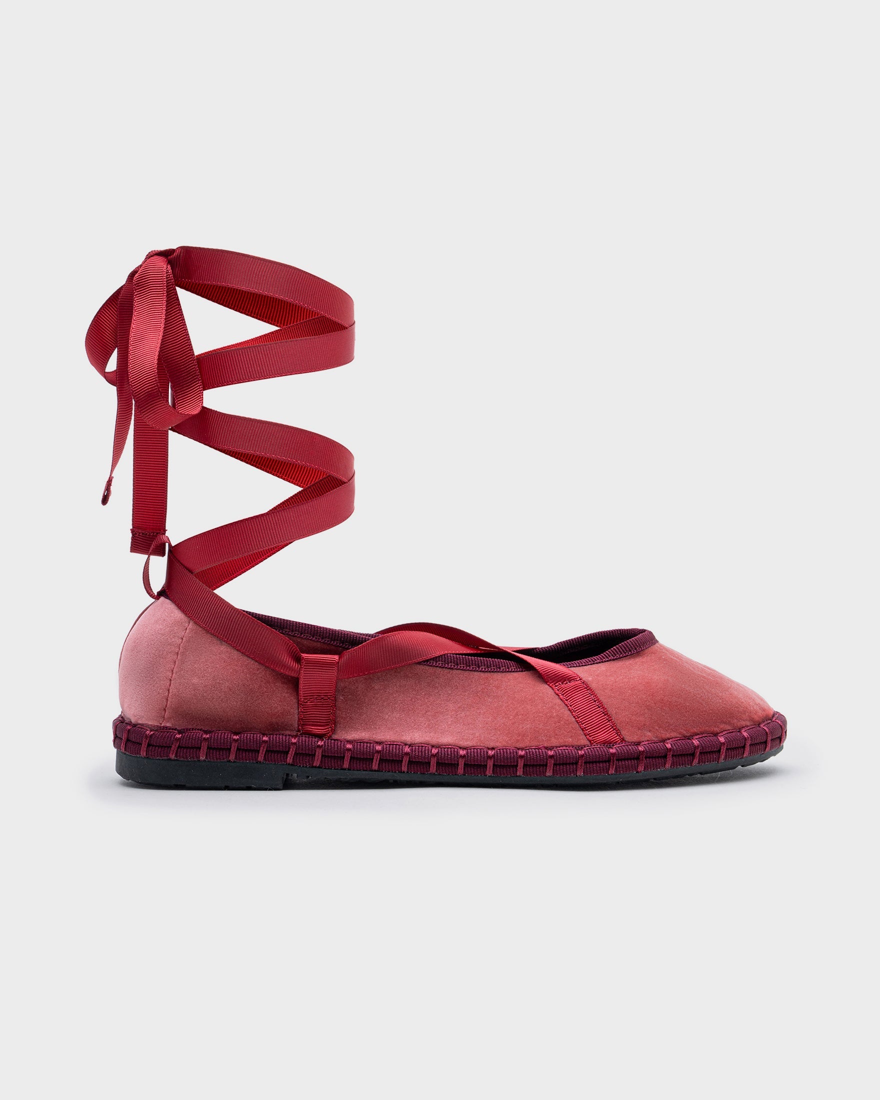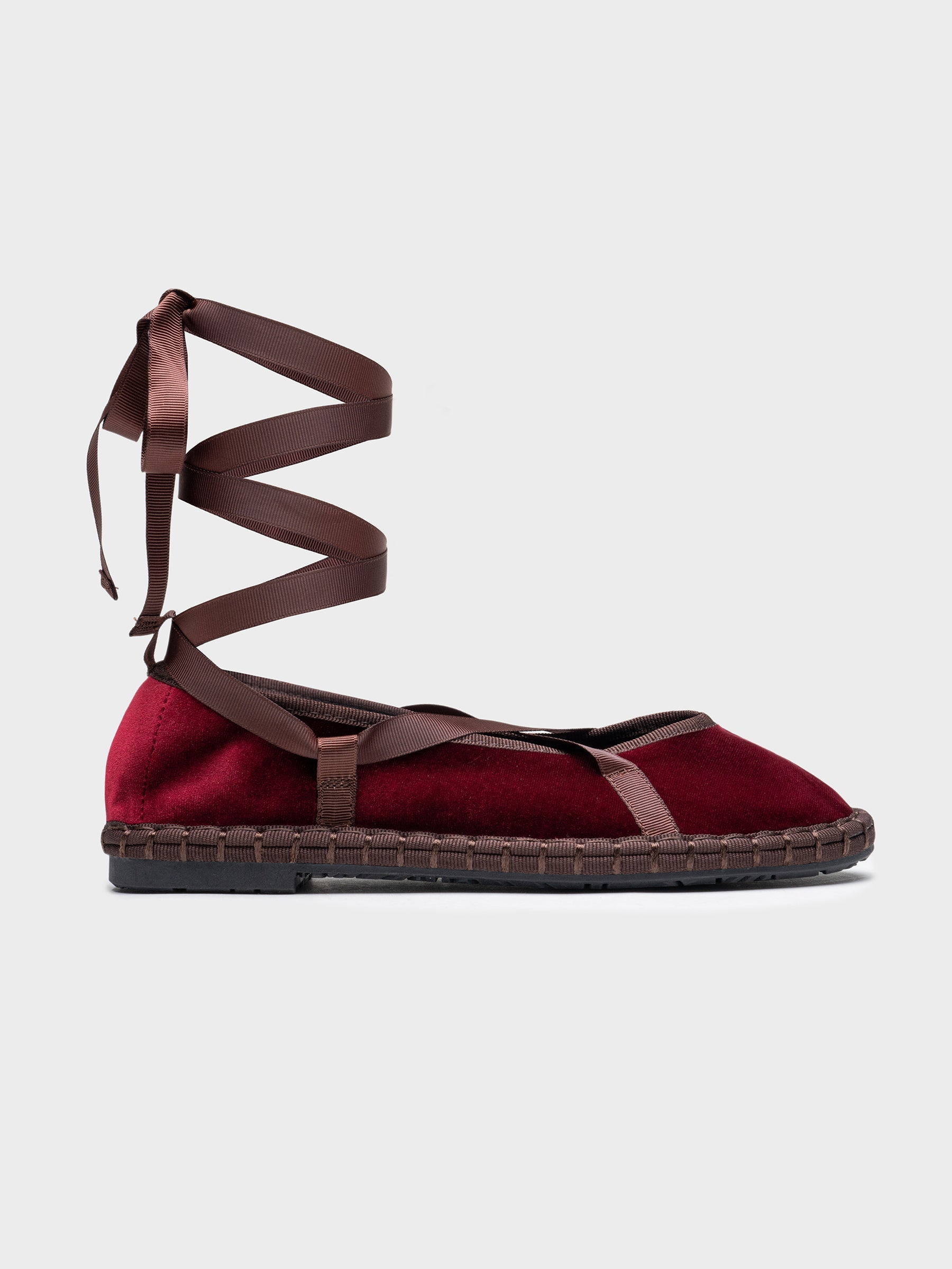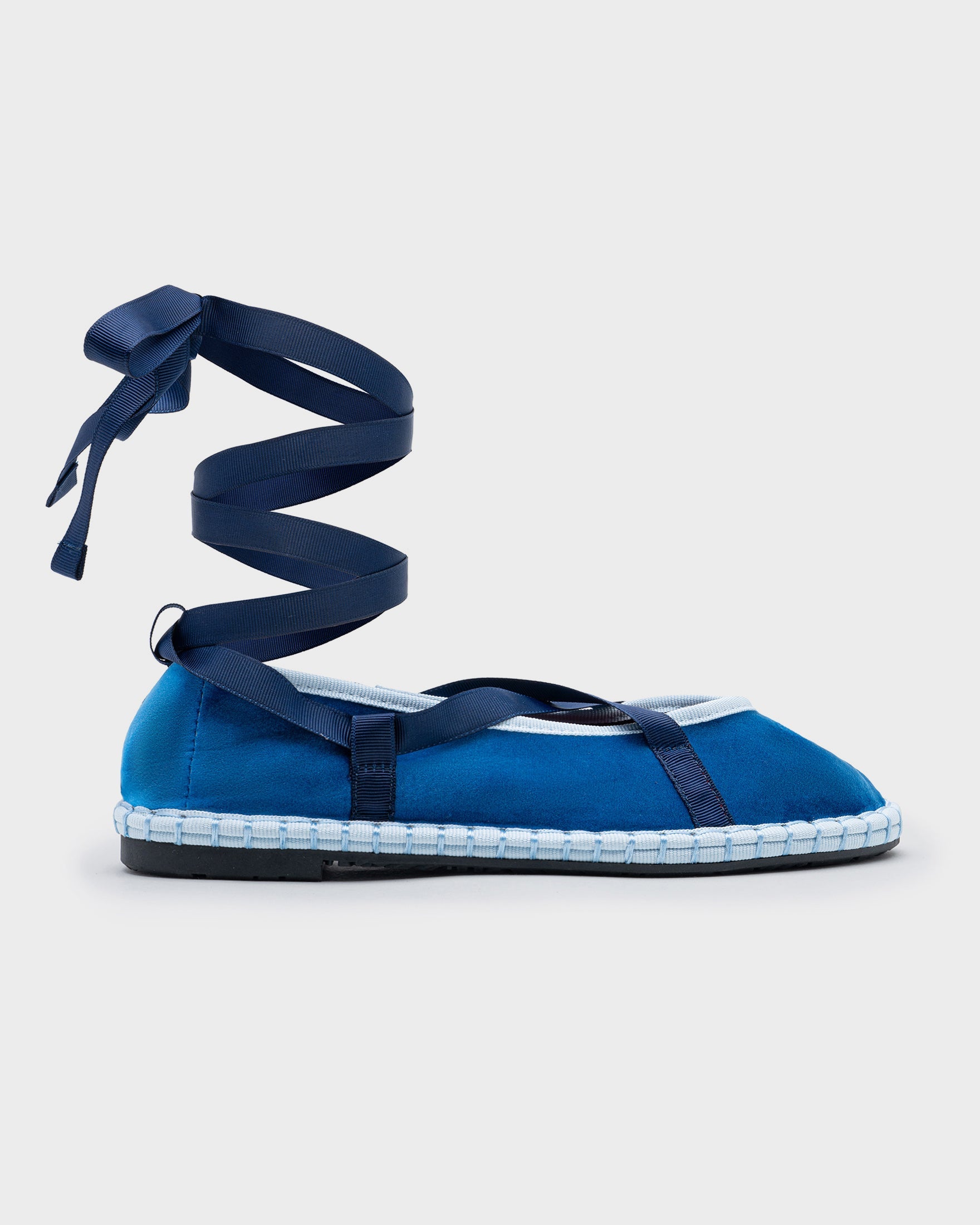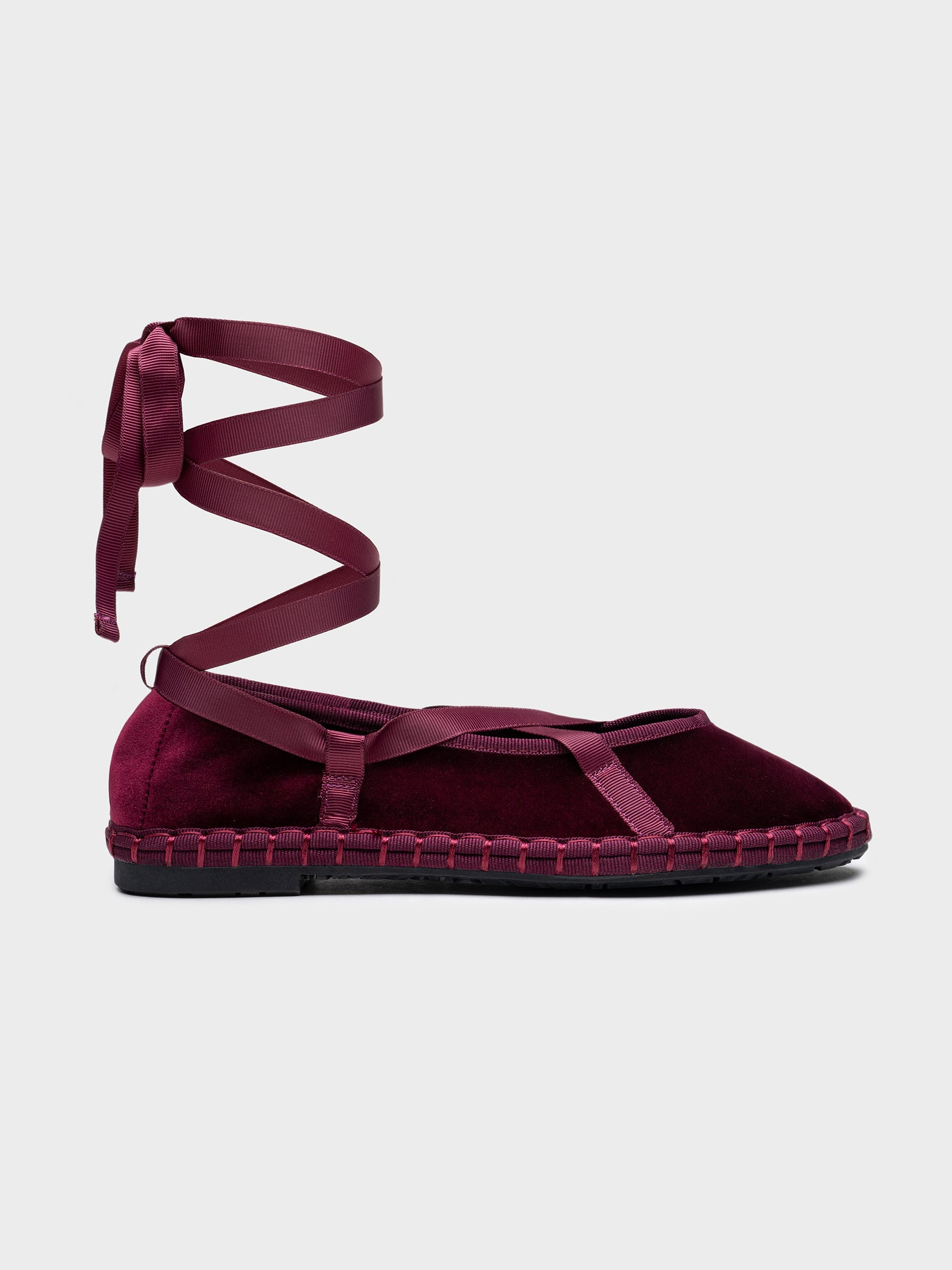 Zapato plano tipo bailarina. Tejido terciopelo. Acabado en punta redonda. Cierre de cordones. Suela plana. Suela de contacto antideslizante. Altura piso: 1.0 cm