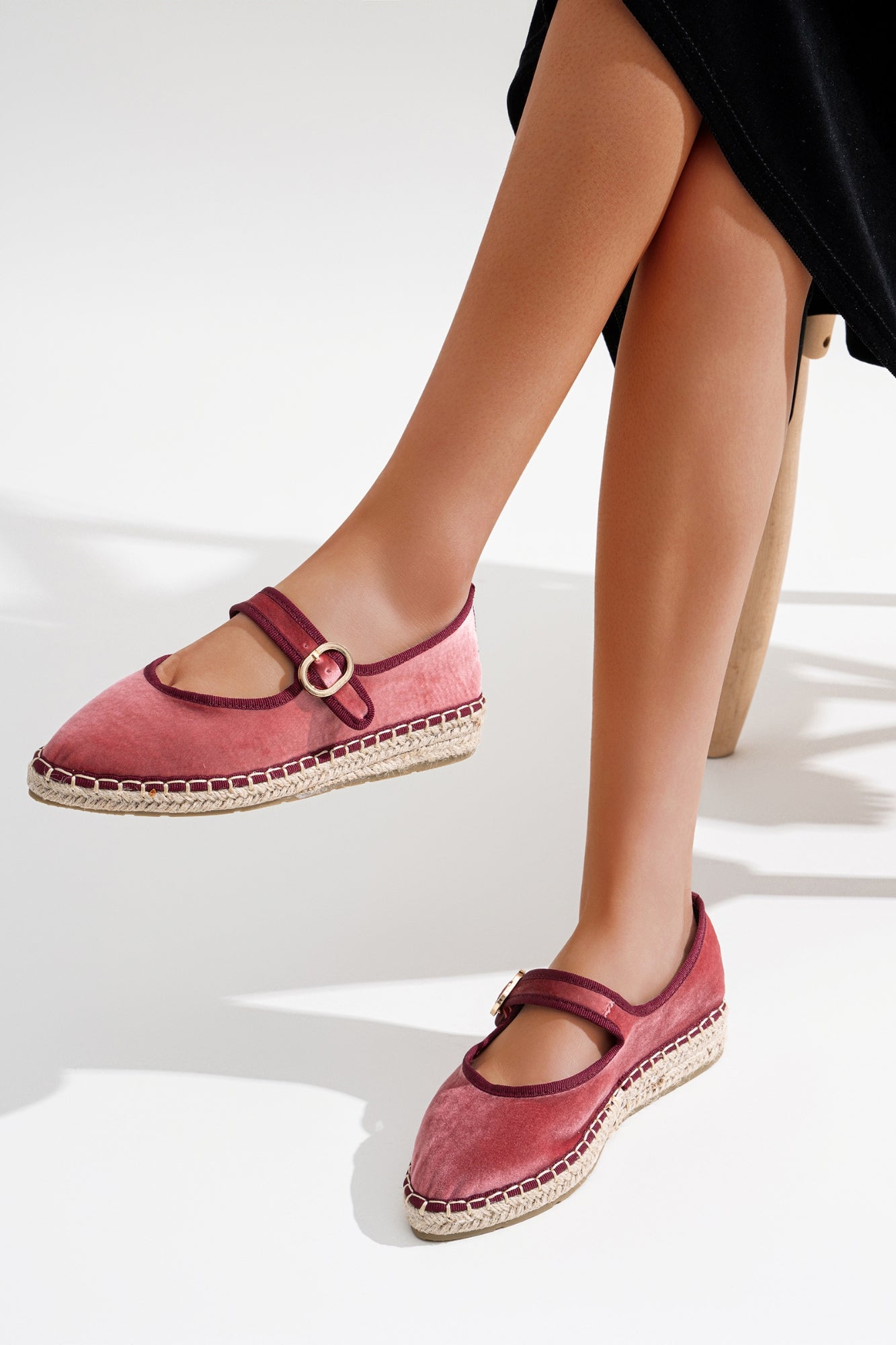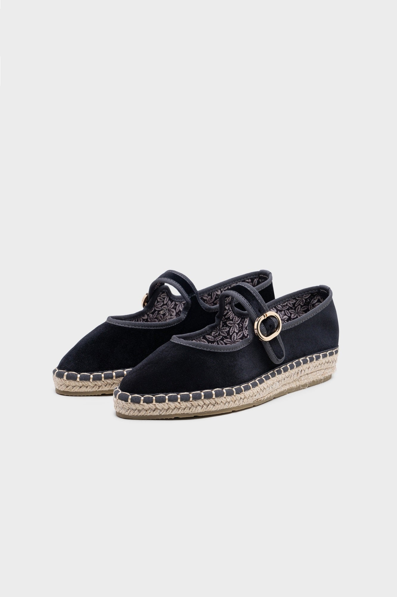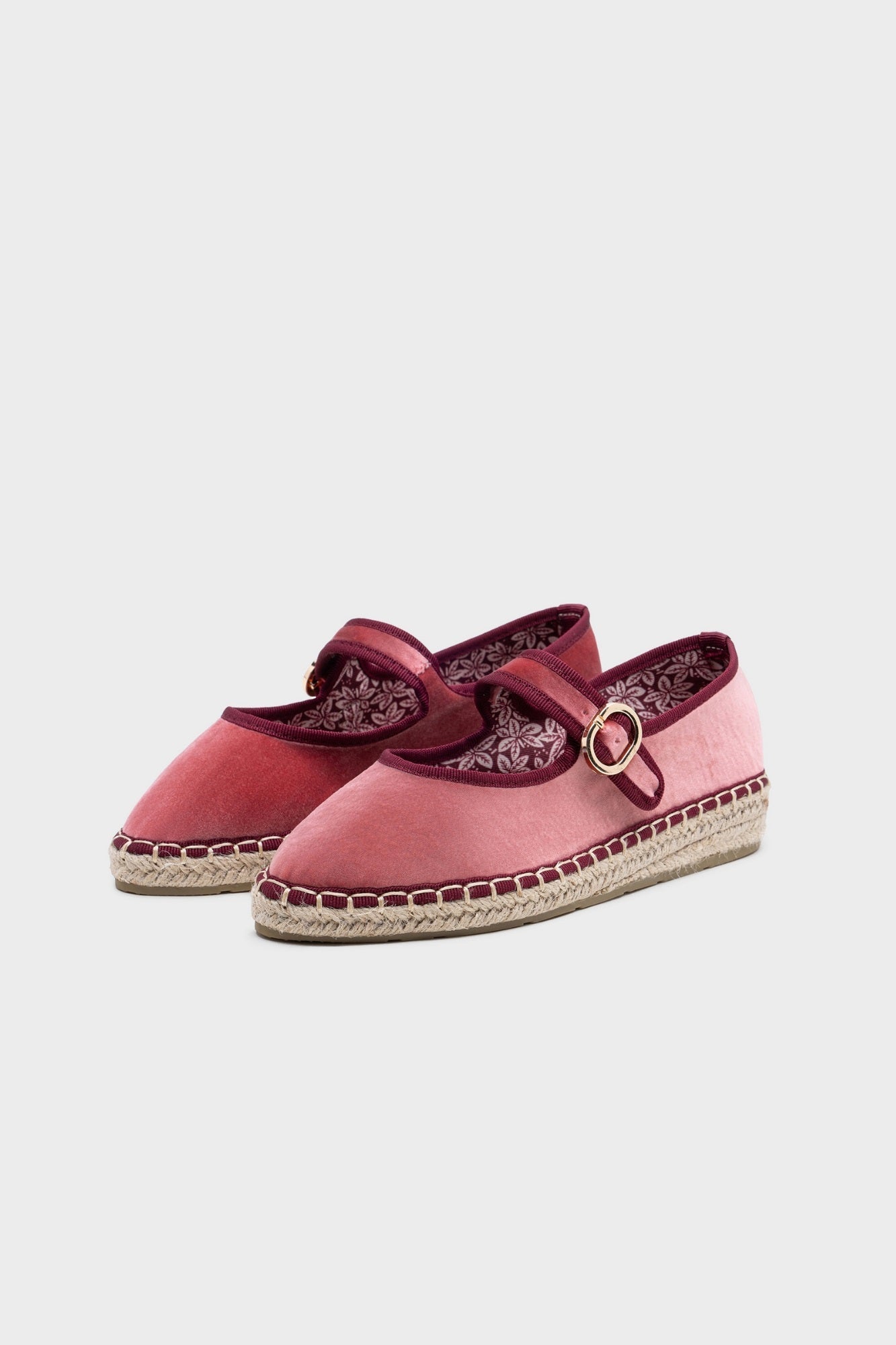 Zapato plano tipo bailarina. Tejido terciopelo. Interior estampado. Cierre de hebilla. Suela plana. Suela de contacto antideslizante.