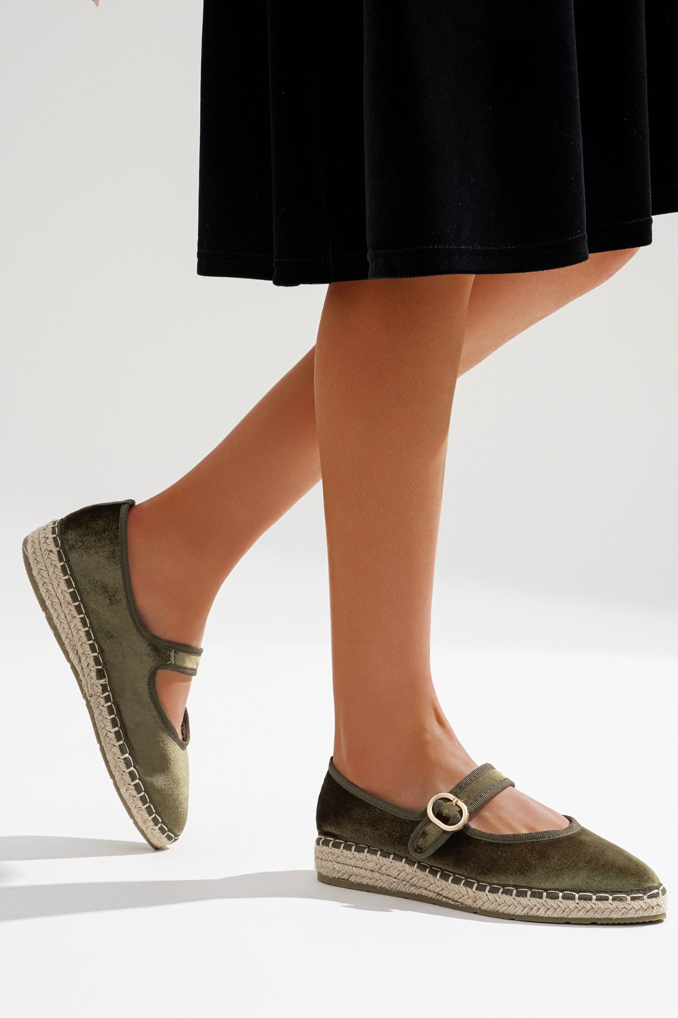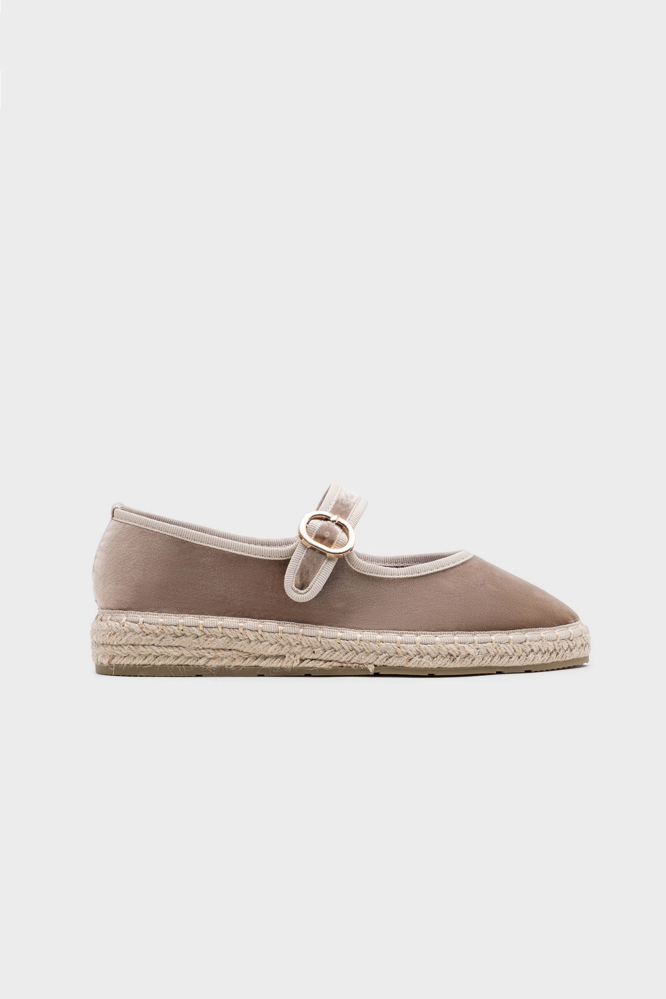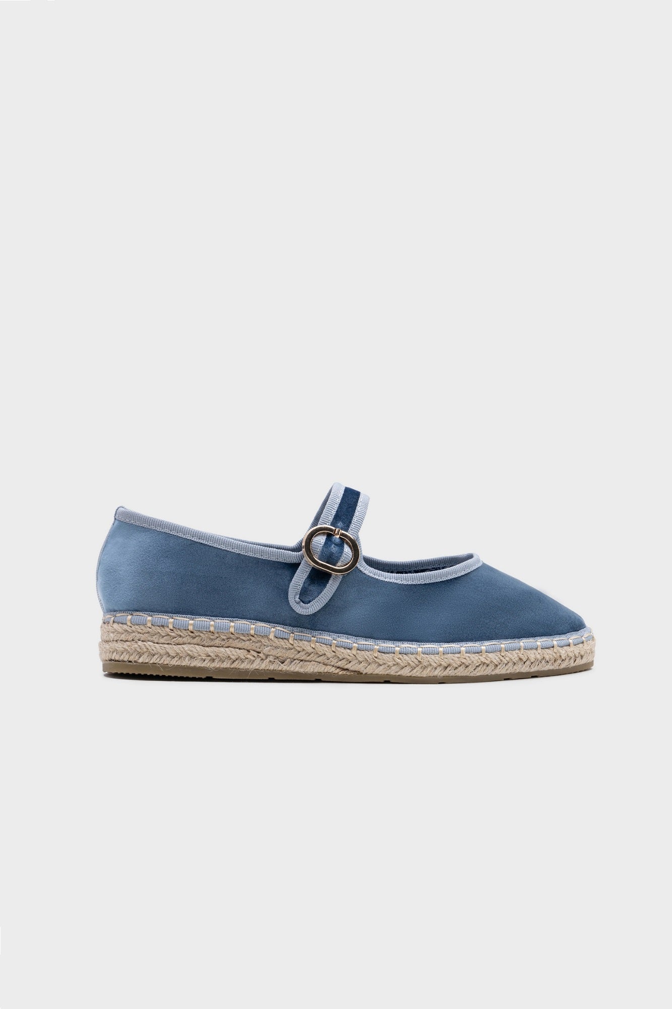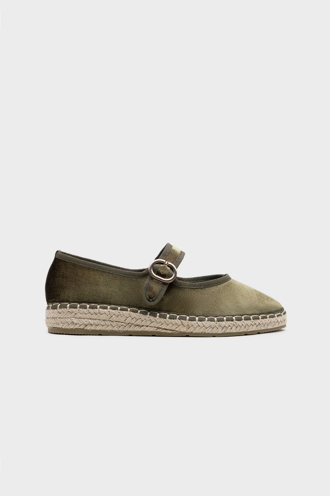 Zapato plano tipo bailarina. Tejido terciopelo. Interior estampado. Cierre de hebilla. Suela plana. Suela de contacto antideslizante.