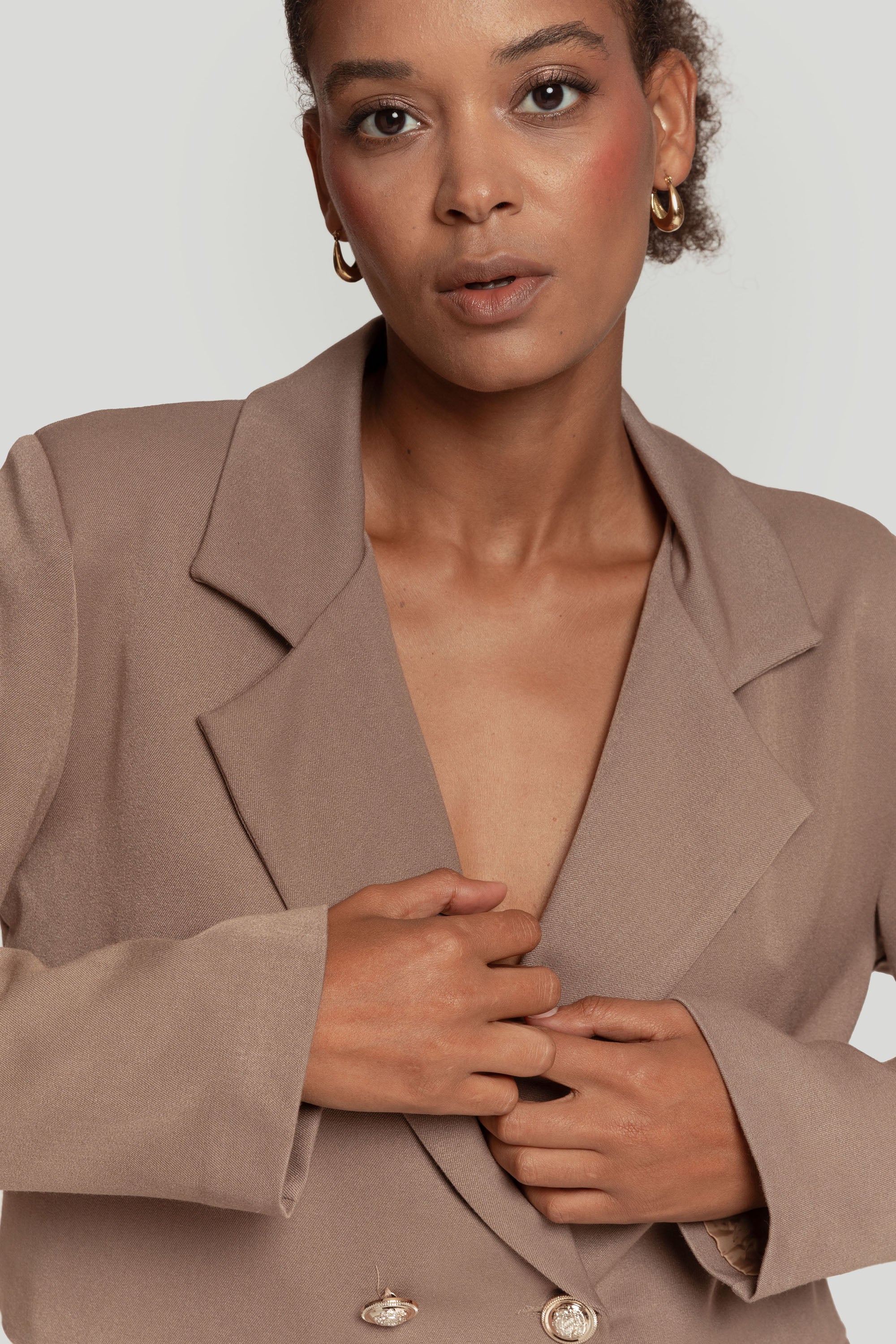 stilo blazer. Diseño cropped. Diseño oversize. Diseño recto. Cuello pico. Cuello solapa. Manga larga. Hombreras. Forro interior. Talla modelo: S. Altura modelo 1,66 m.