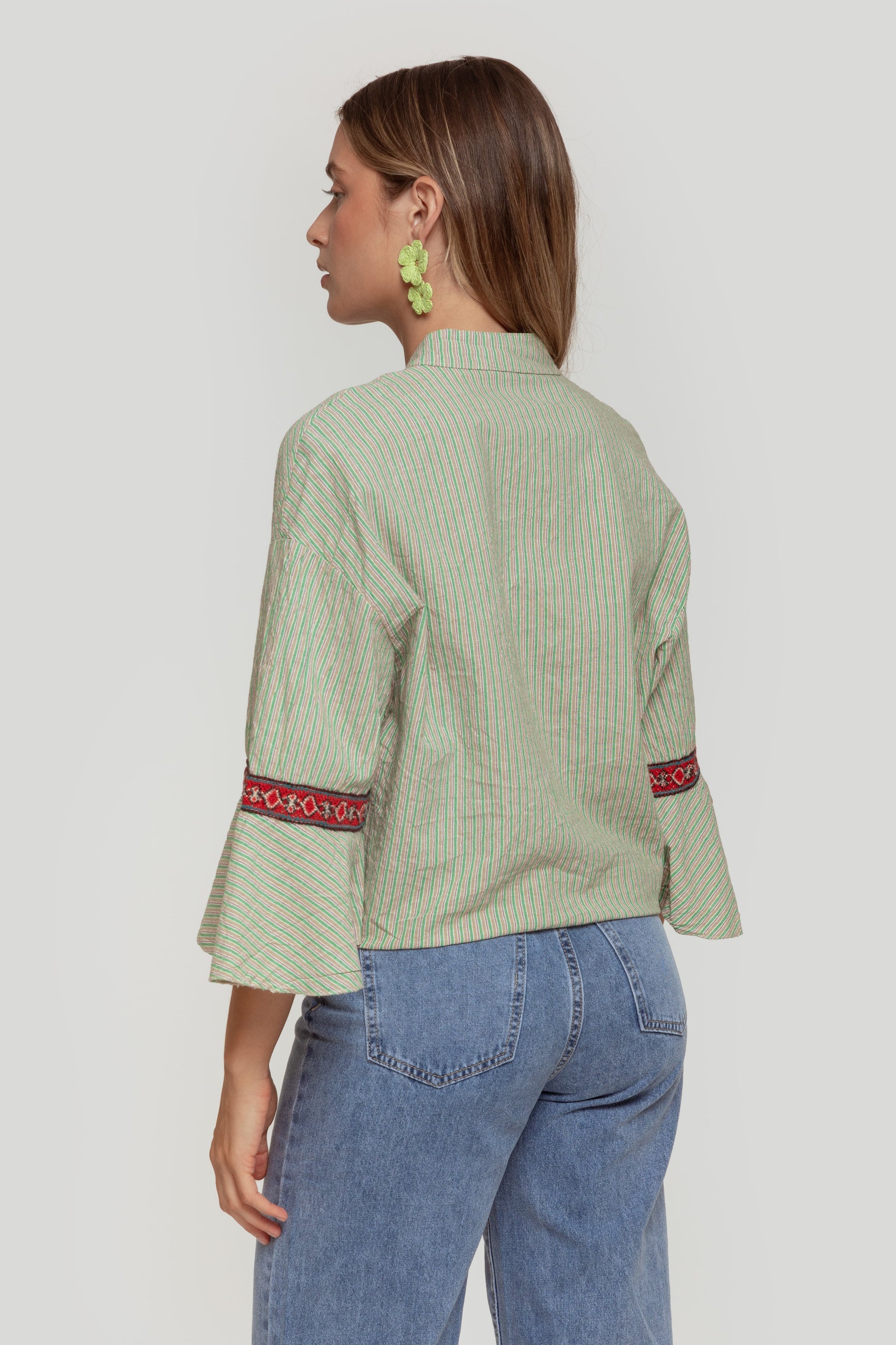 Tejido de algodón. Diseño estampado rayas. Diseño oversize. Diseño nudo. Cuello redondo. Manga larga. Manga acampanada. Cierre de botones. Bolsillo frontal. Bajo volante. Talla modelo: S. Altura modelo 1,76 m.