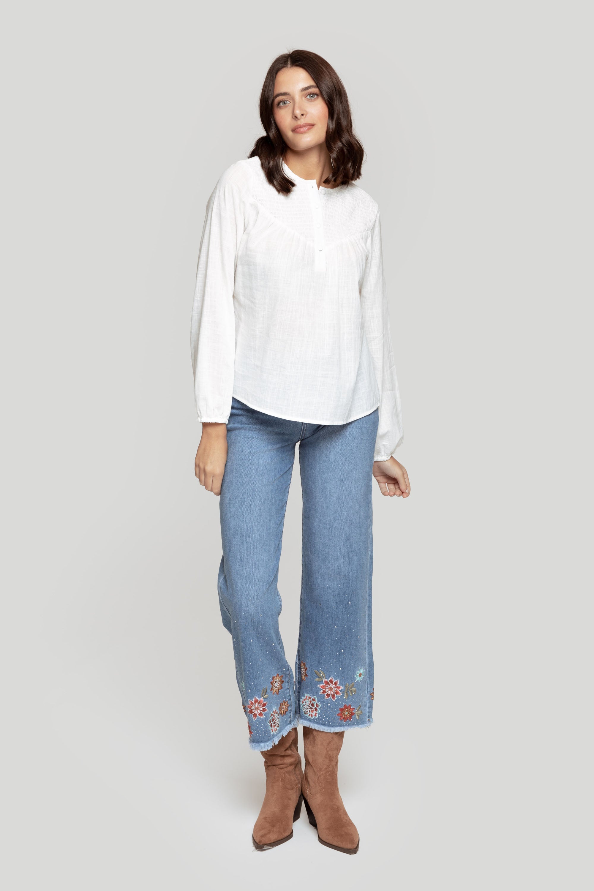 Tejido de algodón. Diseño recto. Diseño amplio. Cuello redondo. Manga larga. Puño elástico. Abotonado en el escote. Talla modelo: S. Altura modelo: 1.75 m.