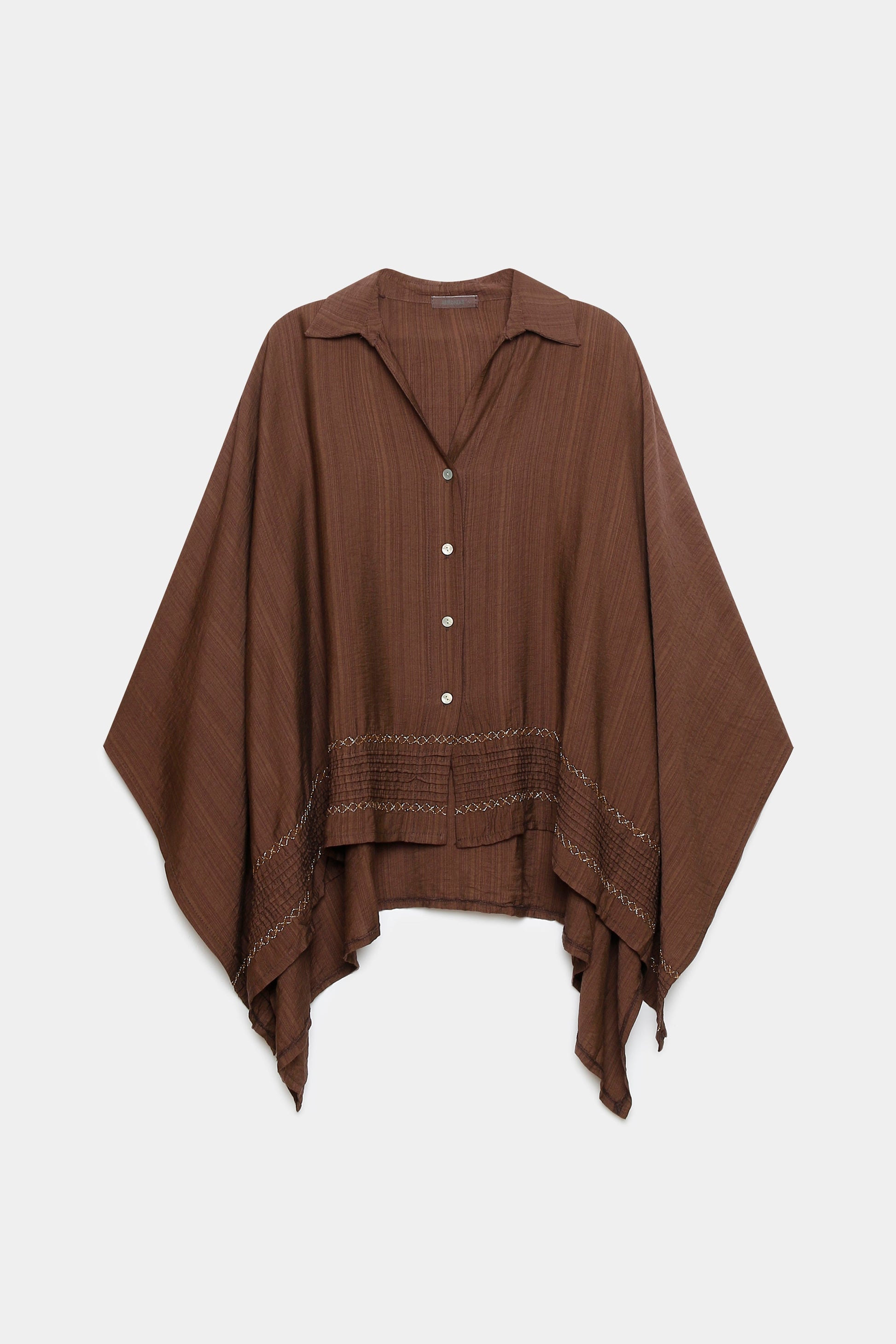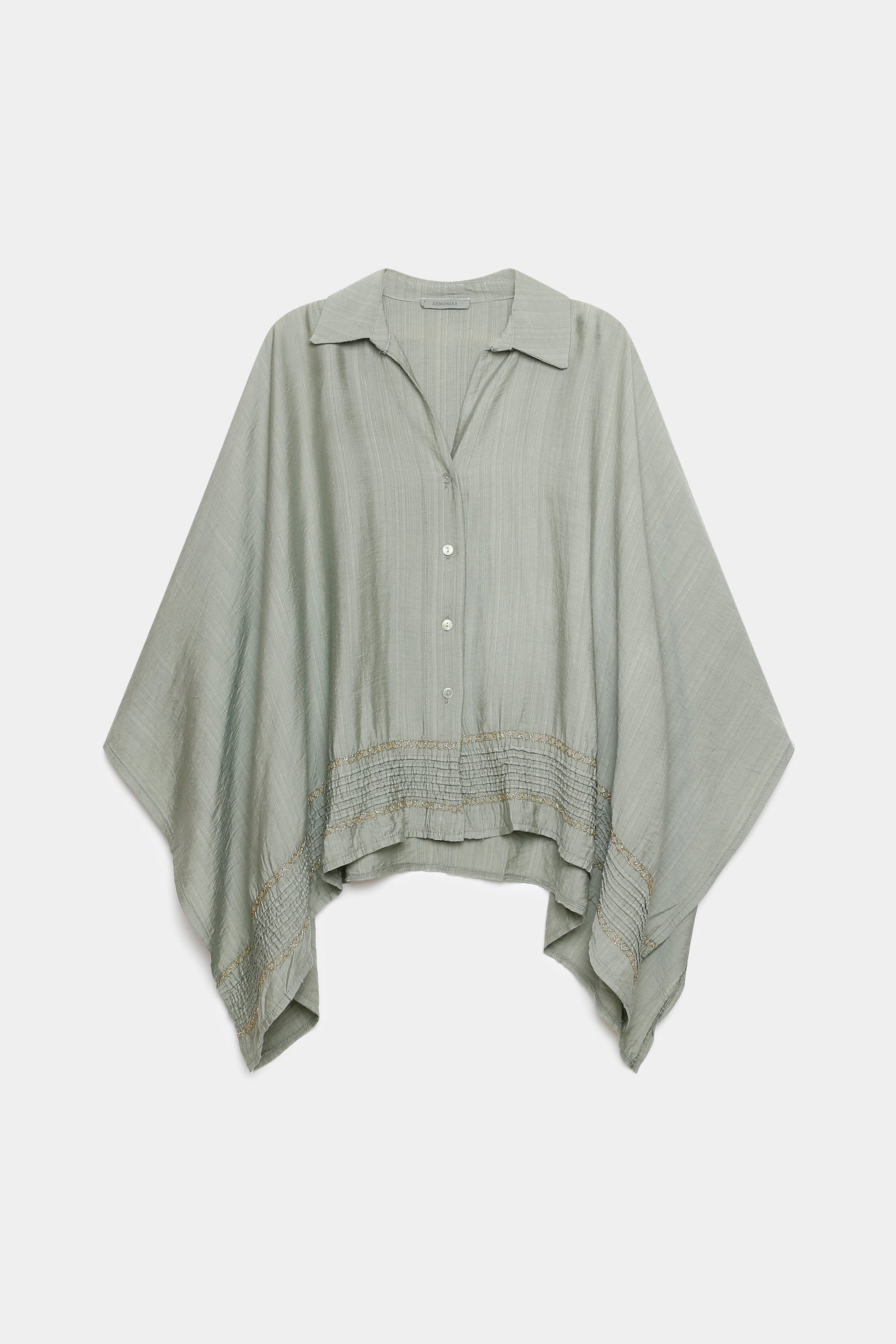 Tejido fino y fluido. Manga corta. Cierre botones. Cuello solapa. Diseño asimétrico. Desde una 38 hasta una 58.