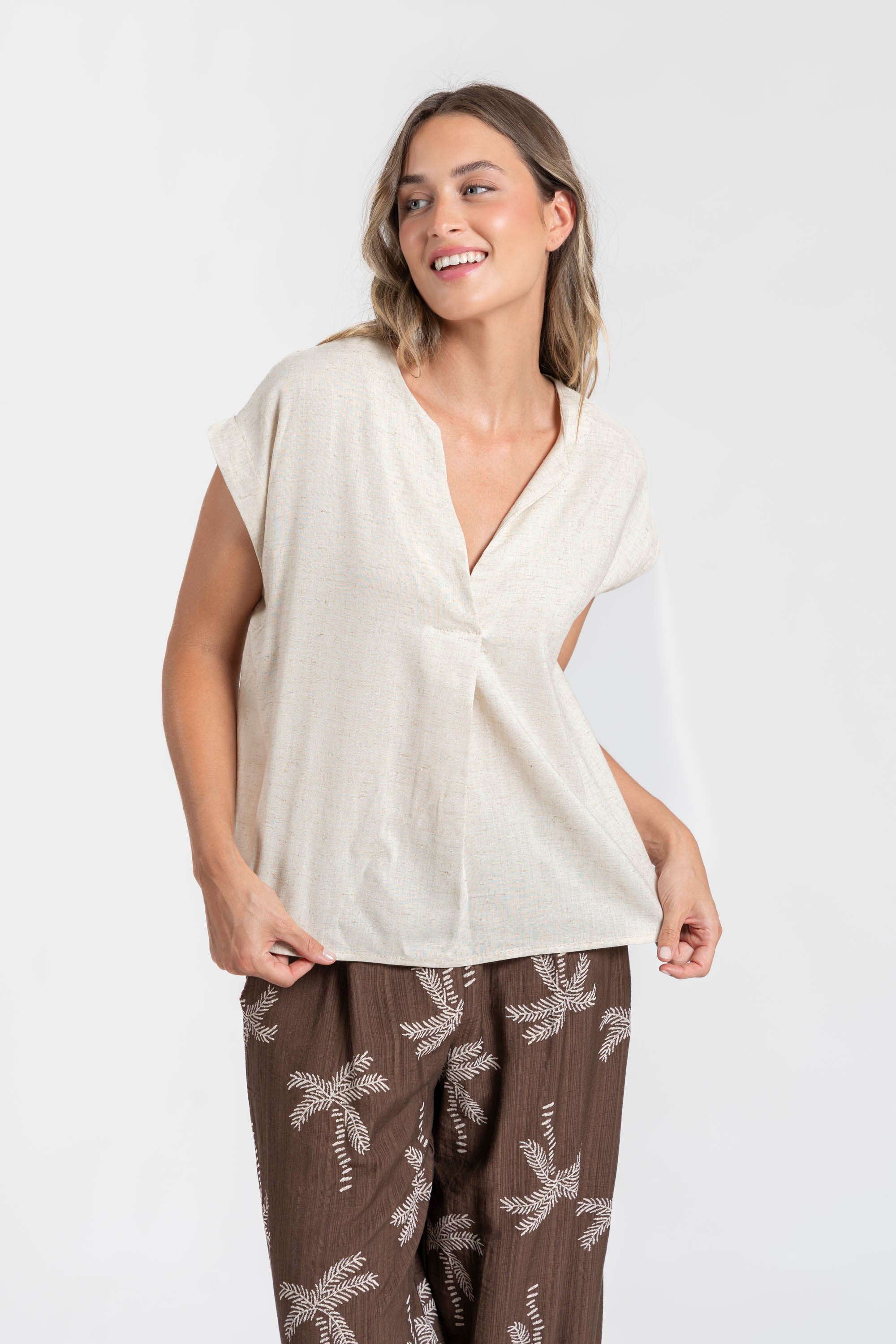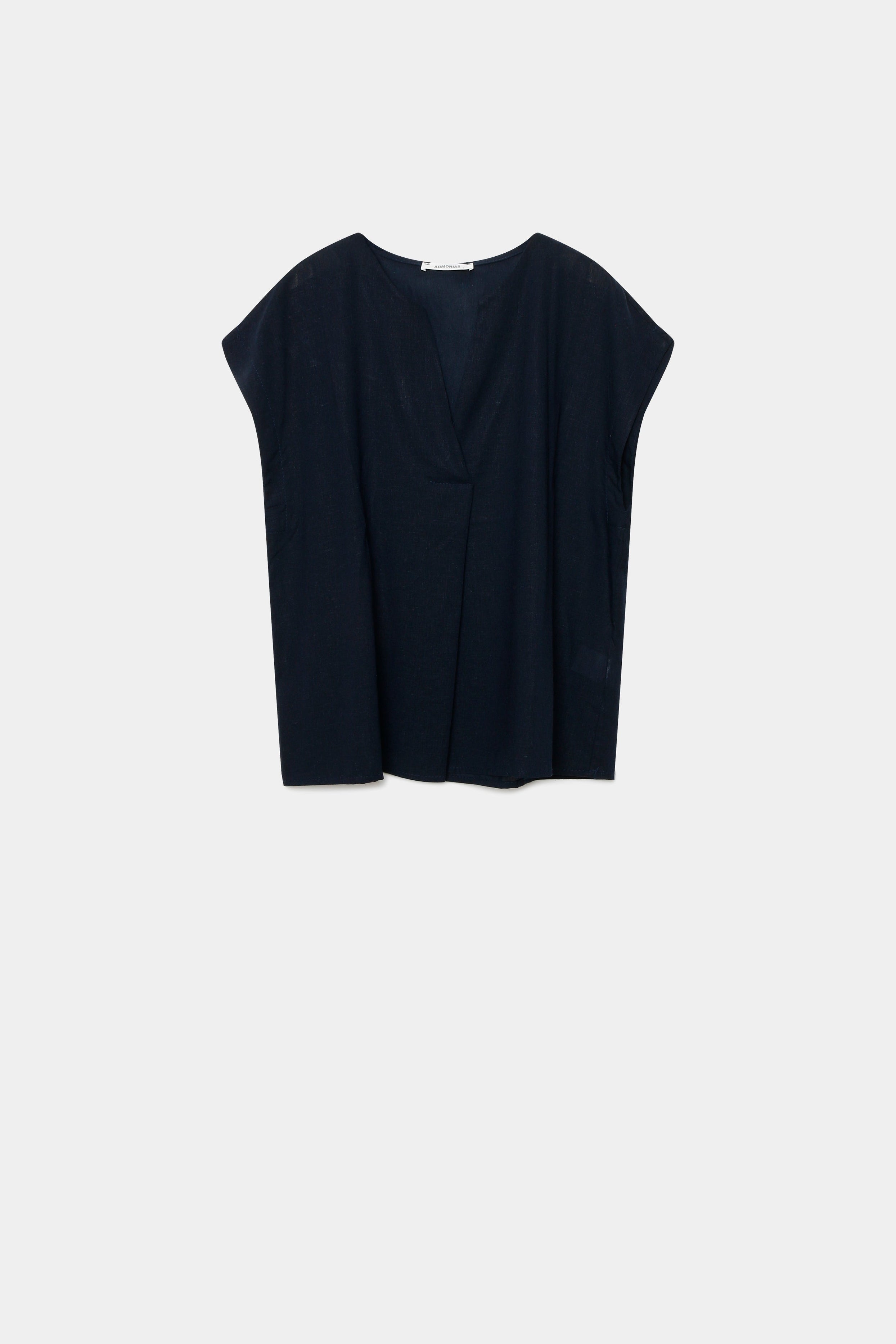 Tejido mezcla lino. Cuello pico. Manga sisa.