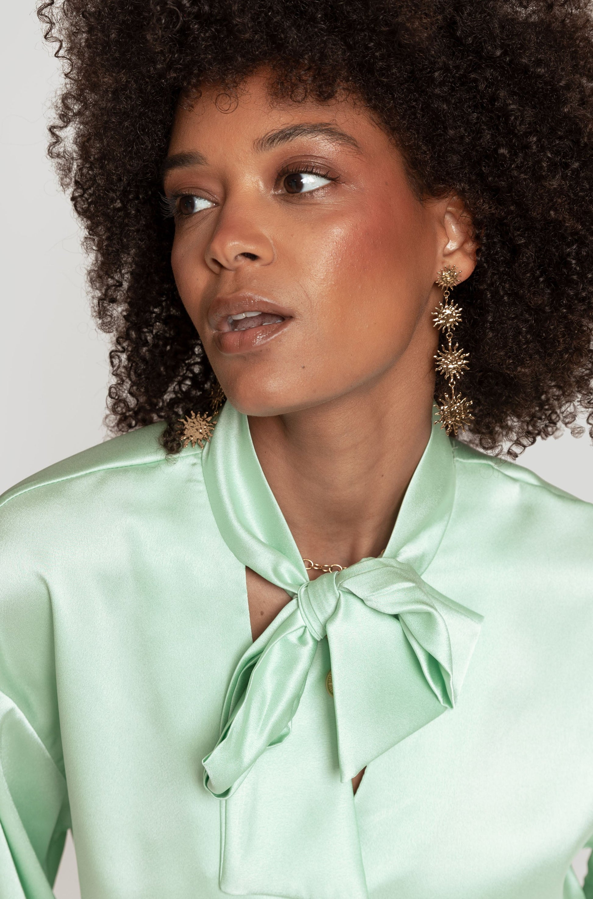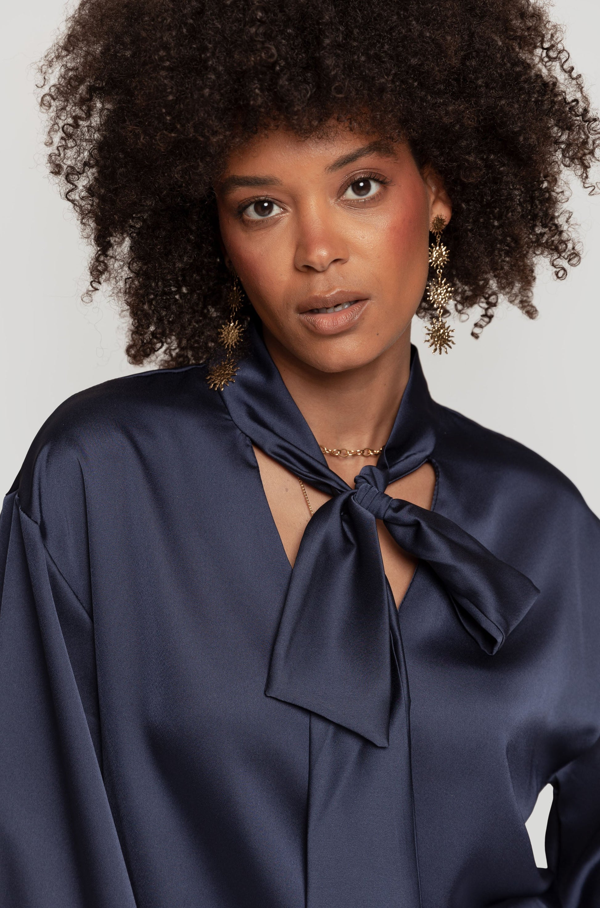 Tejido satinado. Diseño amplio. Diseño recto. Cuello redondo. Cuello con lazada. Manga acampanada. Talla modelo: S. Altura modelo: 1.66 m.