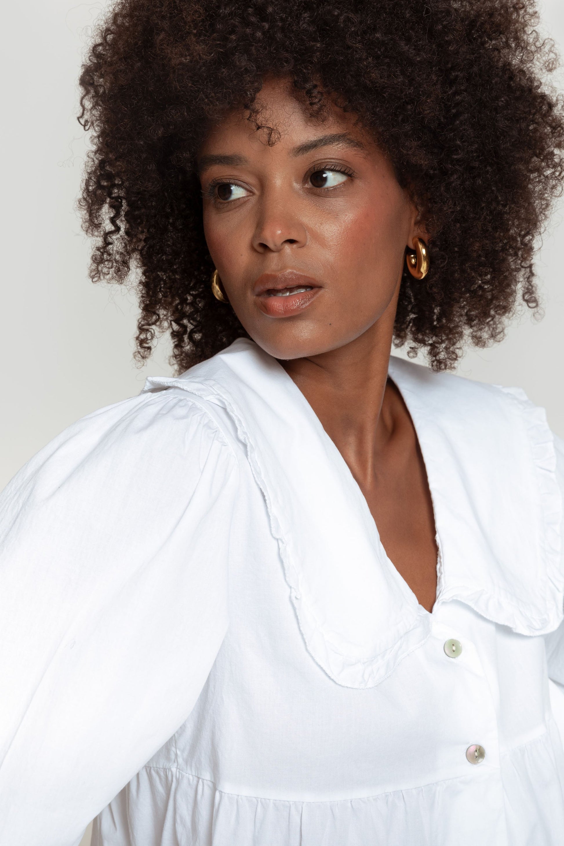 Tejido mezcla de algodón. Diseño oversize. Cuello bobo. Manga larga. Puño acampanado. Cierre de botones.