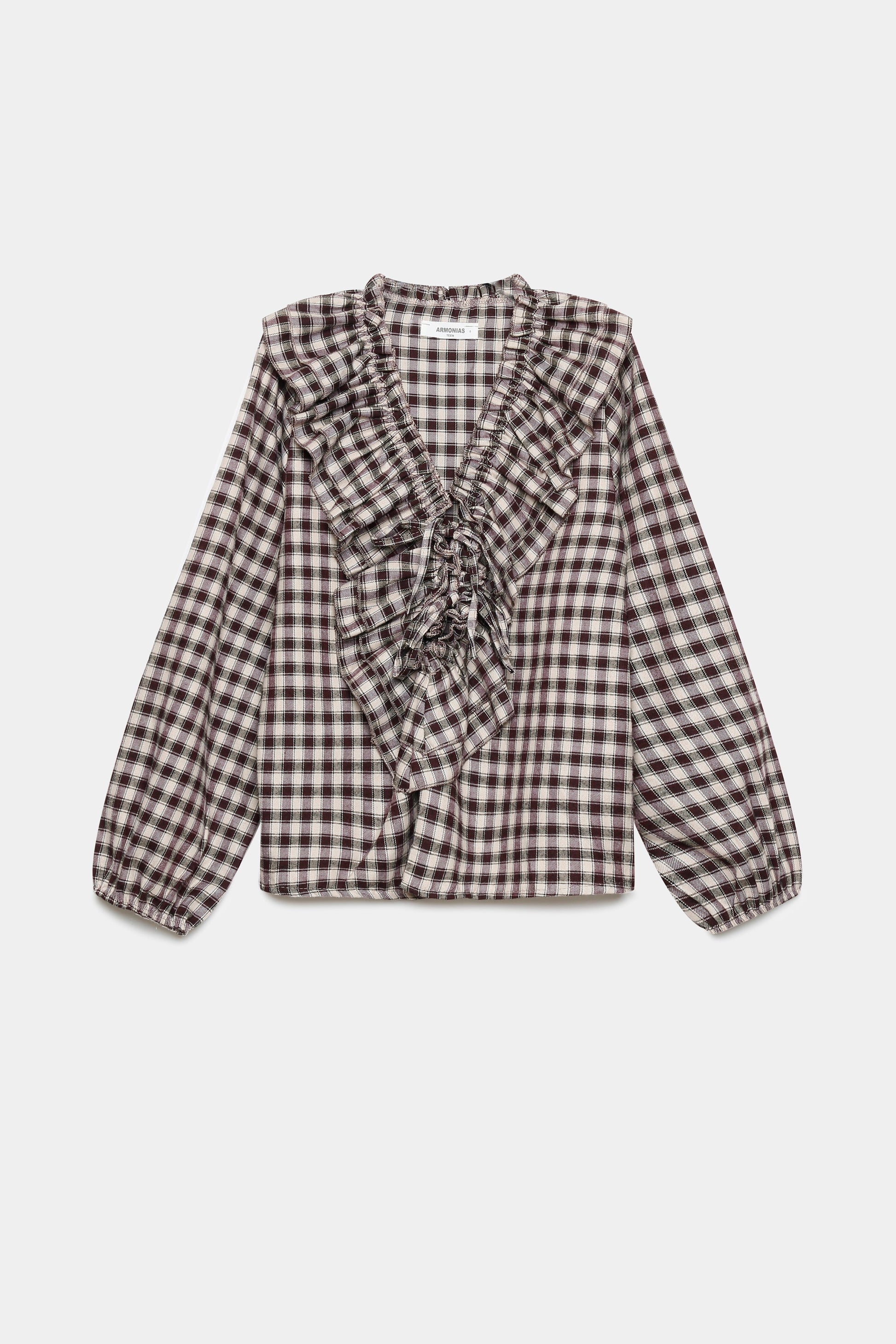 Tejido estampado cuadros. Escote pico. Manga larga. Detalle volantes.