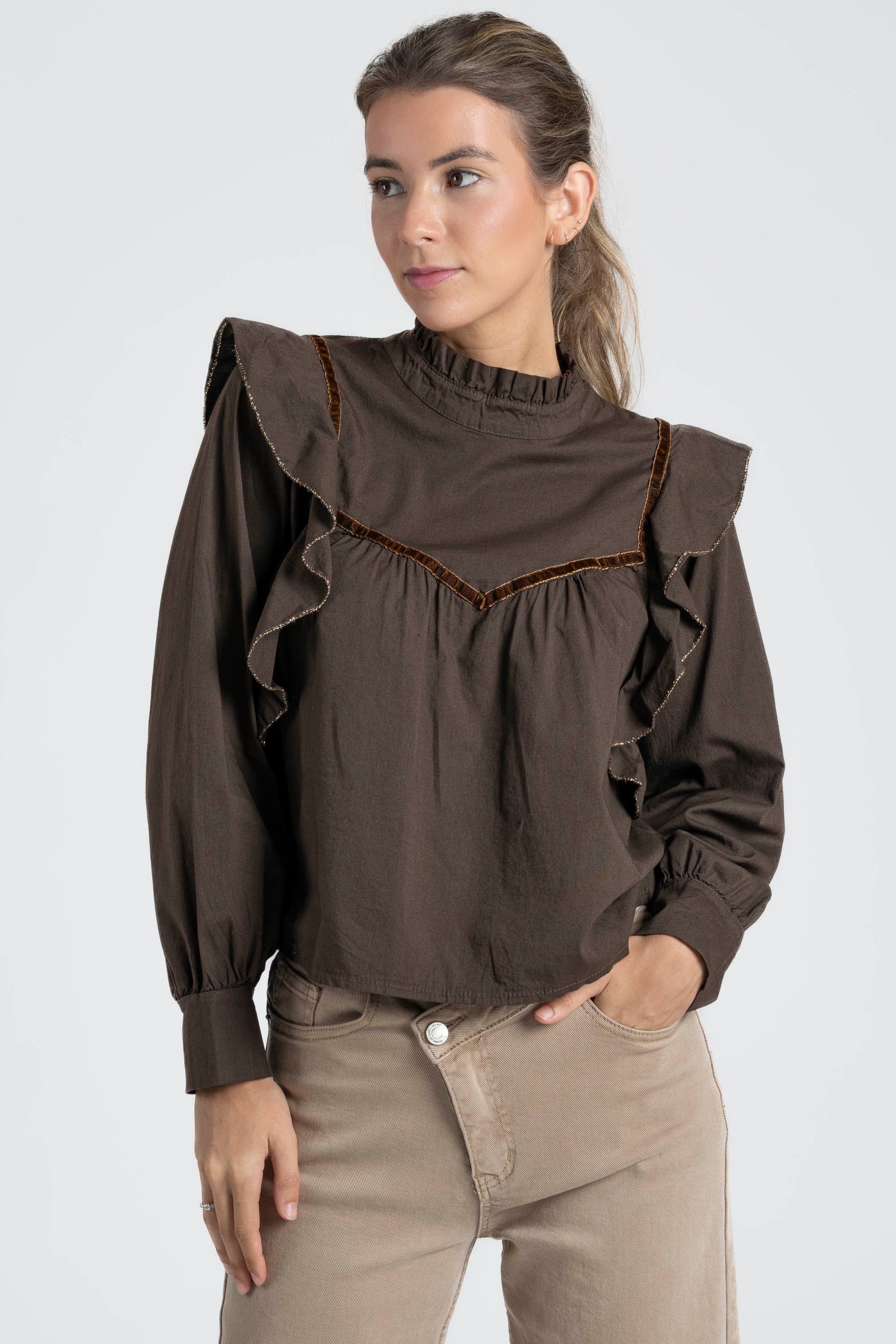 Tejido de algodón. Cuello subido. Manga larga. Detalle volantes.