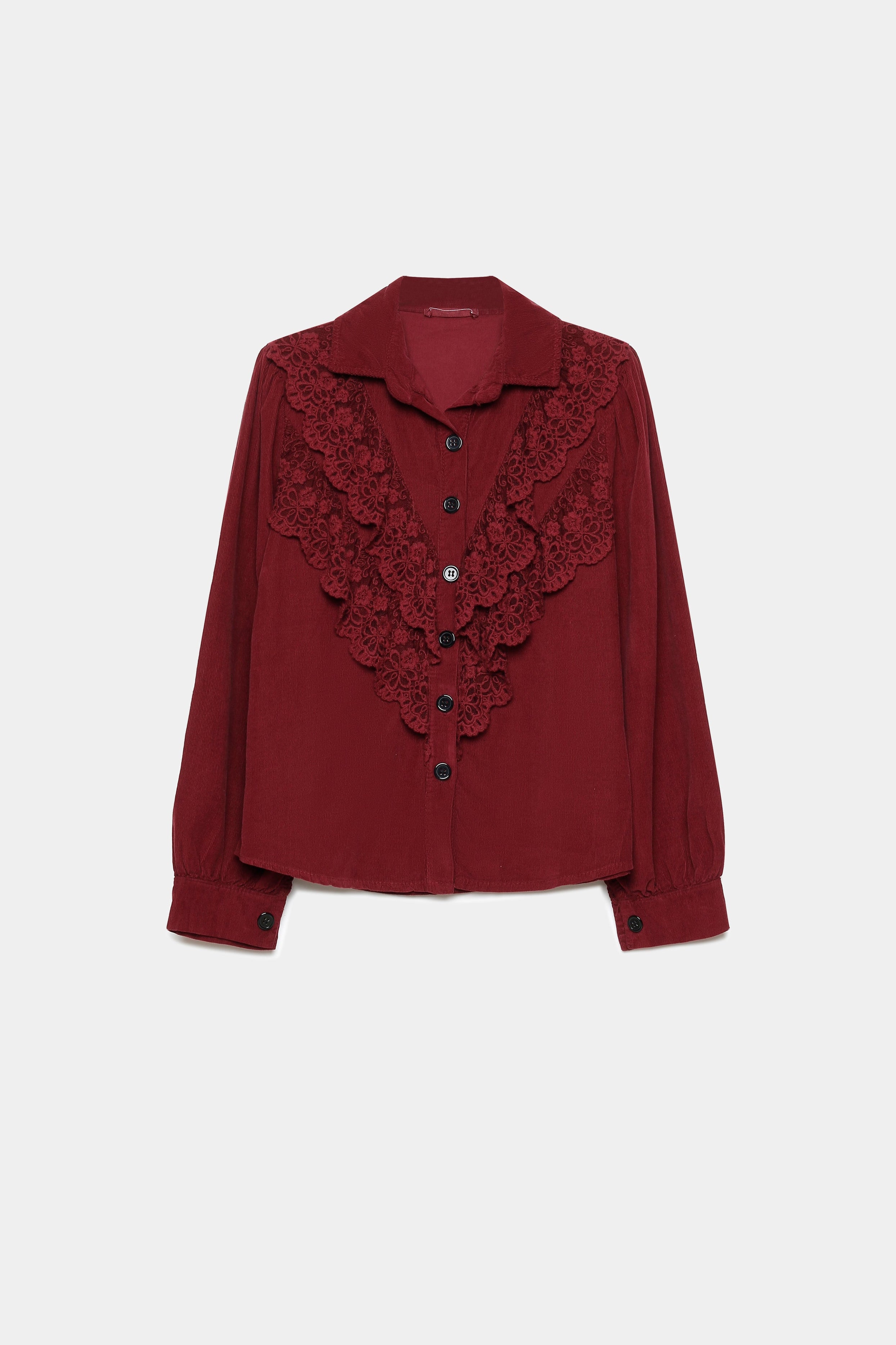 Tejido de algodón. Cuello solapa. Manga larga. Detalle bordados.