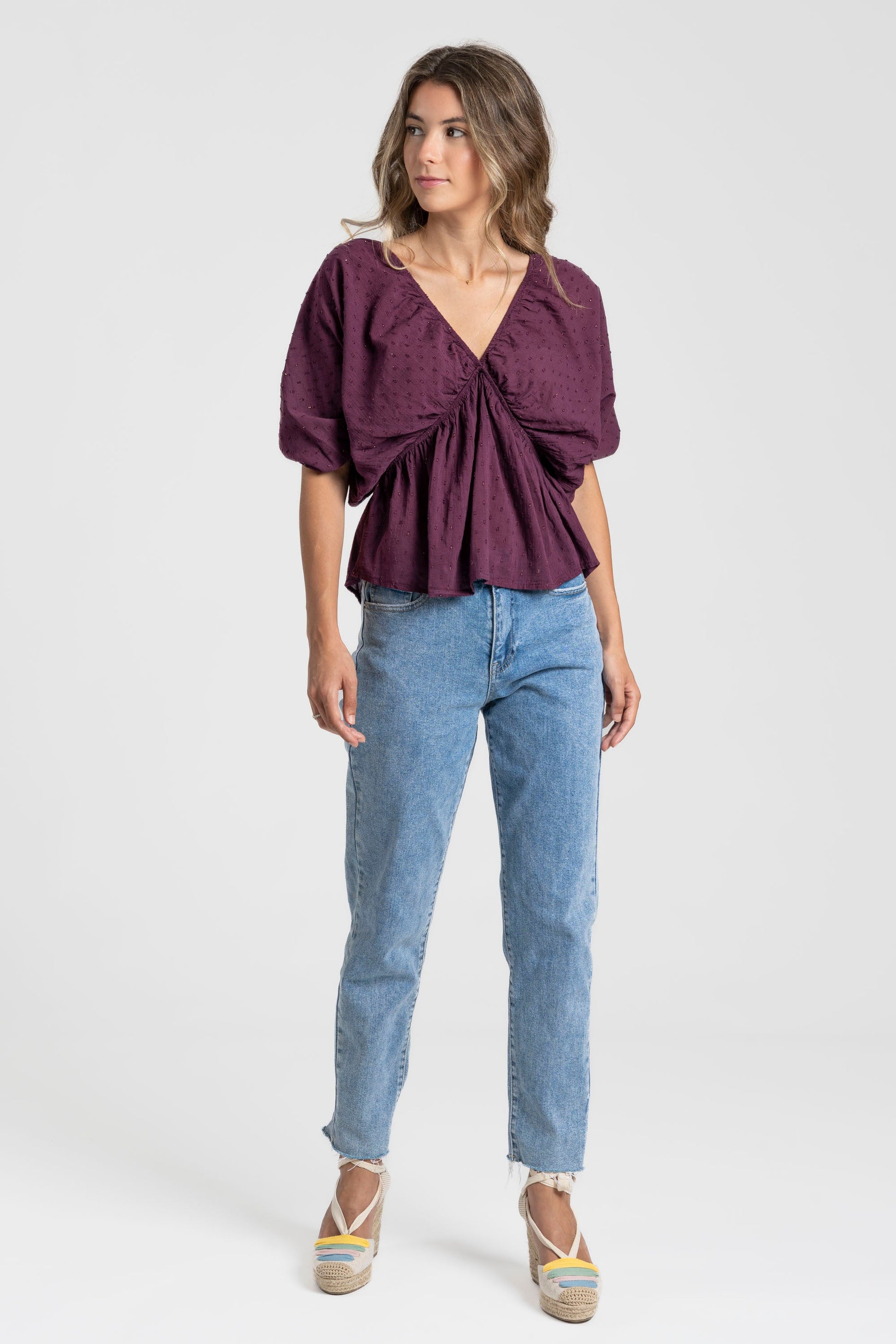 Tejido de algodón. Tejido plumeti con brillo. Escote pico. Manga corta. Lazada en la espalda.