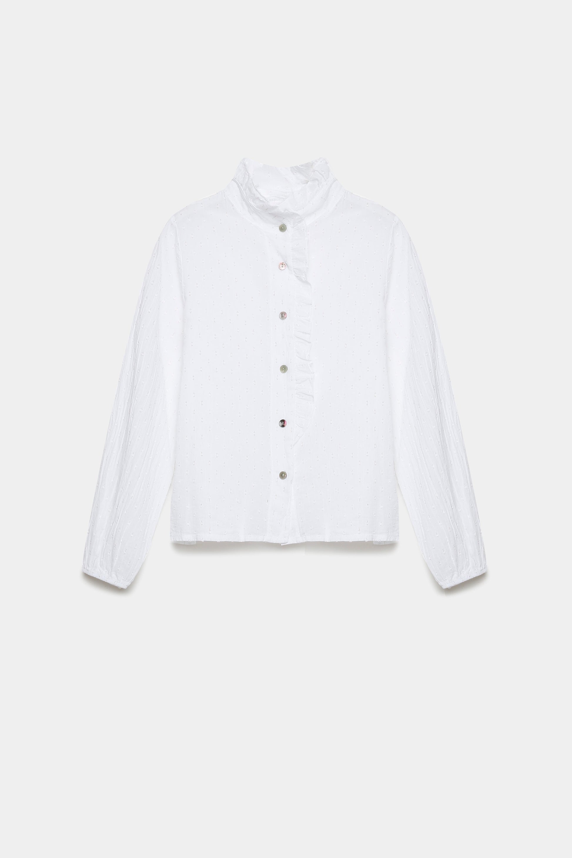 Tejido plumeti. Cuello redondo subido. Manga larga. Cierre de botones. Detalle de brillos.