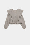 Tejido cuadros. Escote pico. Manga larga. Cierre botones. Detalle volantes.