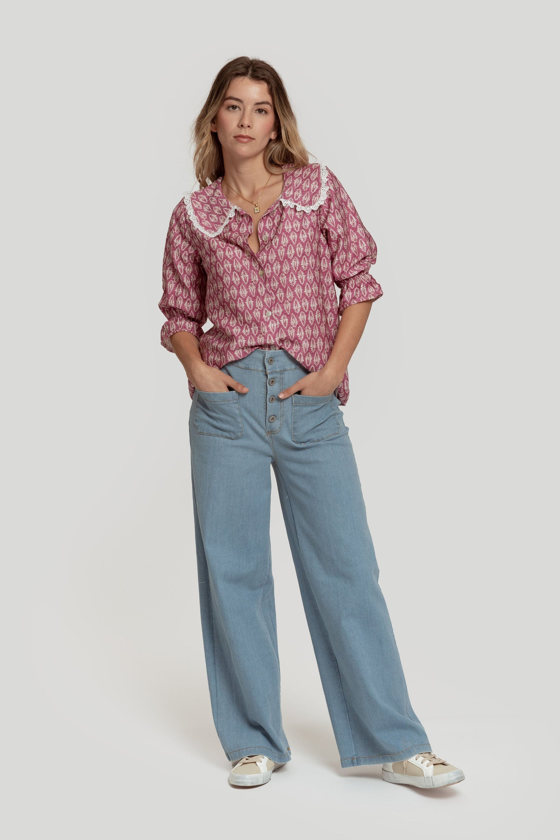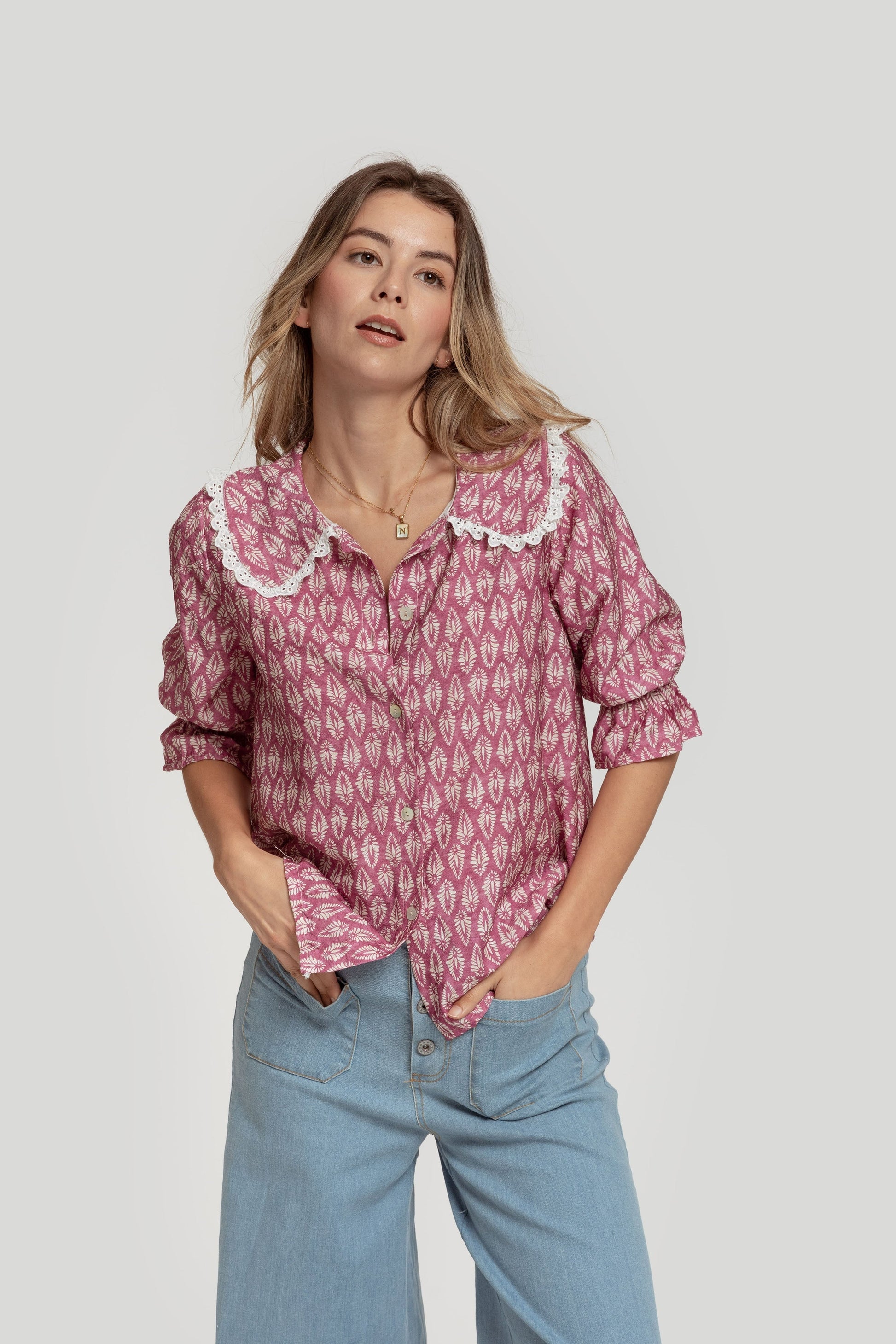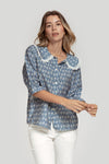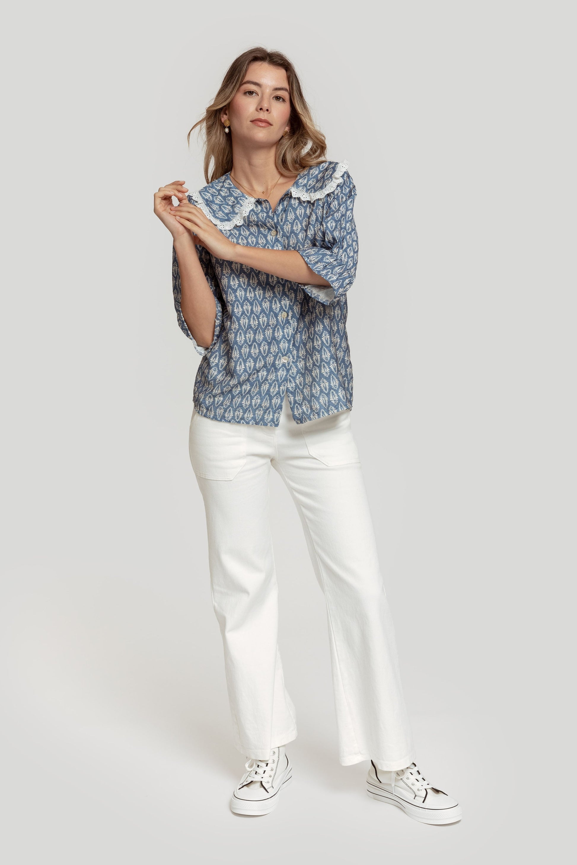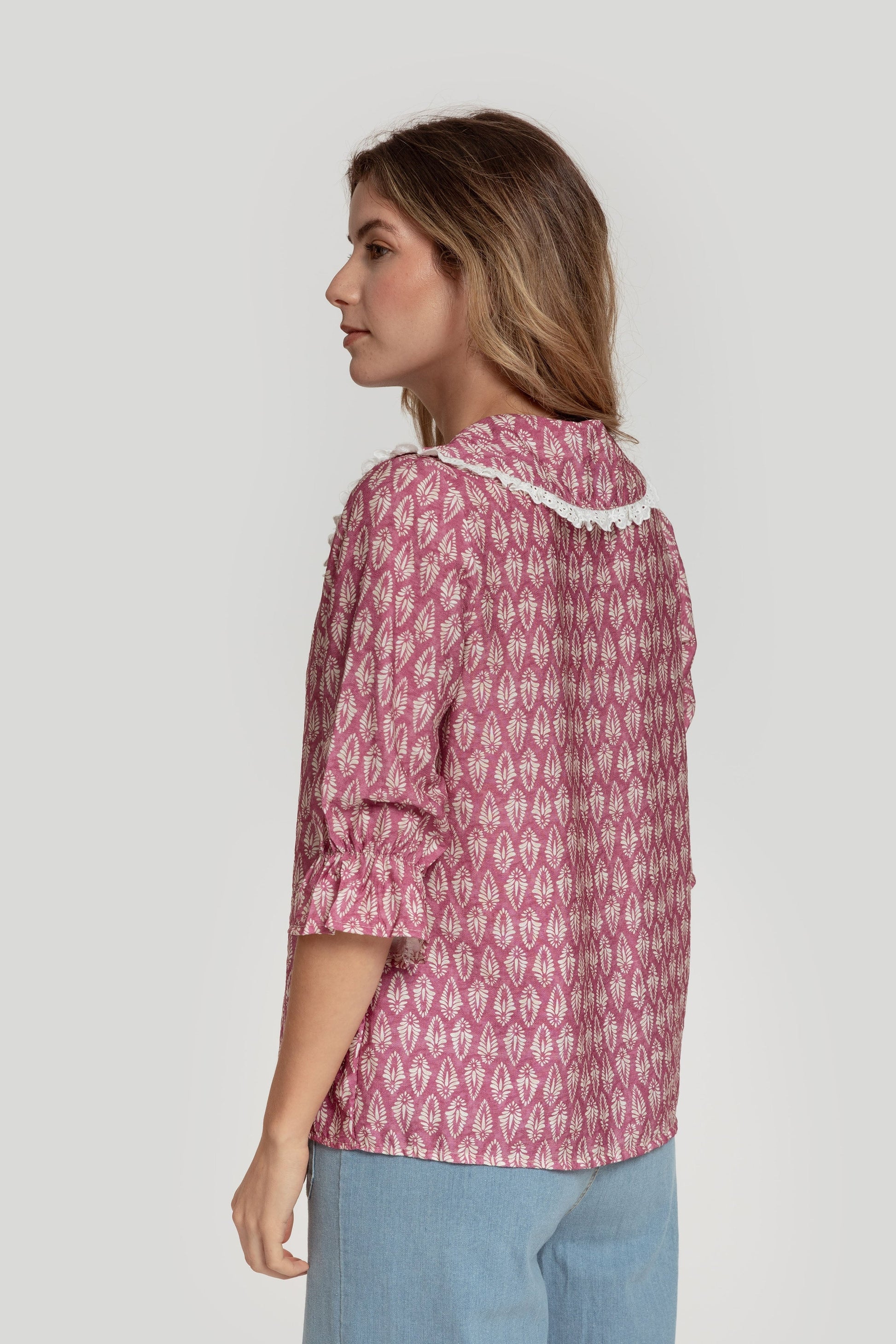 Tejido rústico. Diseño estampado. Diseño recto. Cuello bobo. Manga tres cuartos. Puño volante. Cierre de botones. Talla modelo: S. Altura modelo 1,70 m.