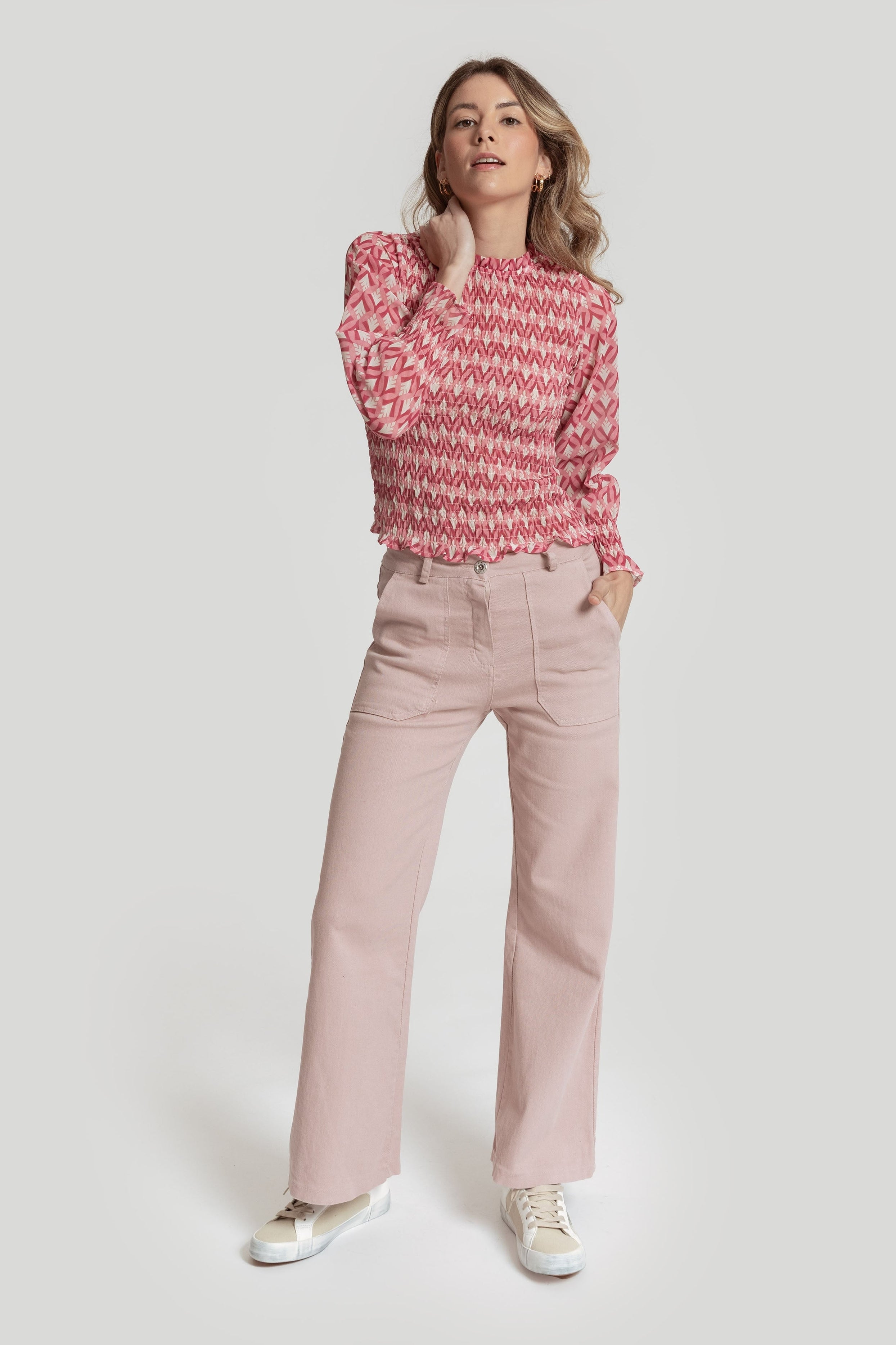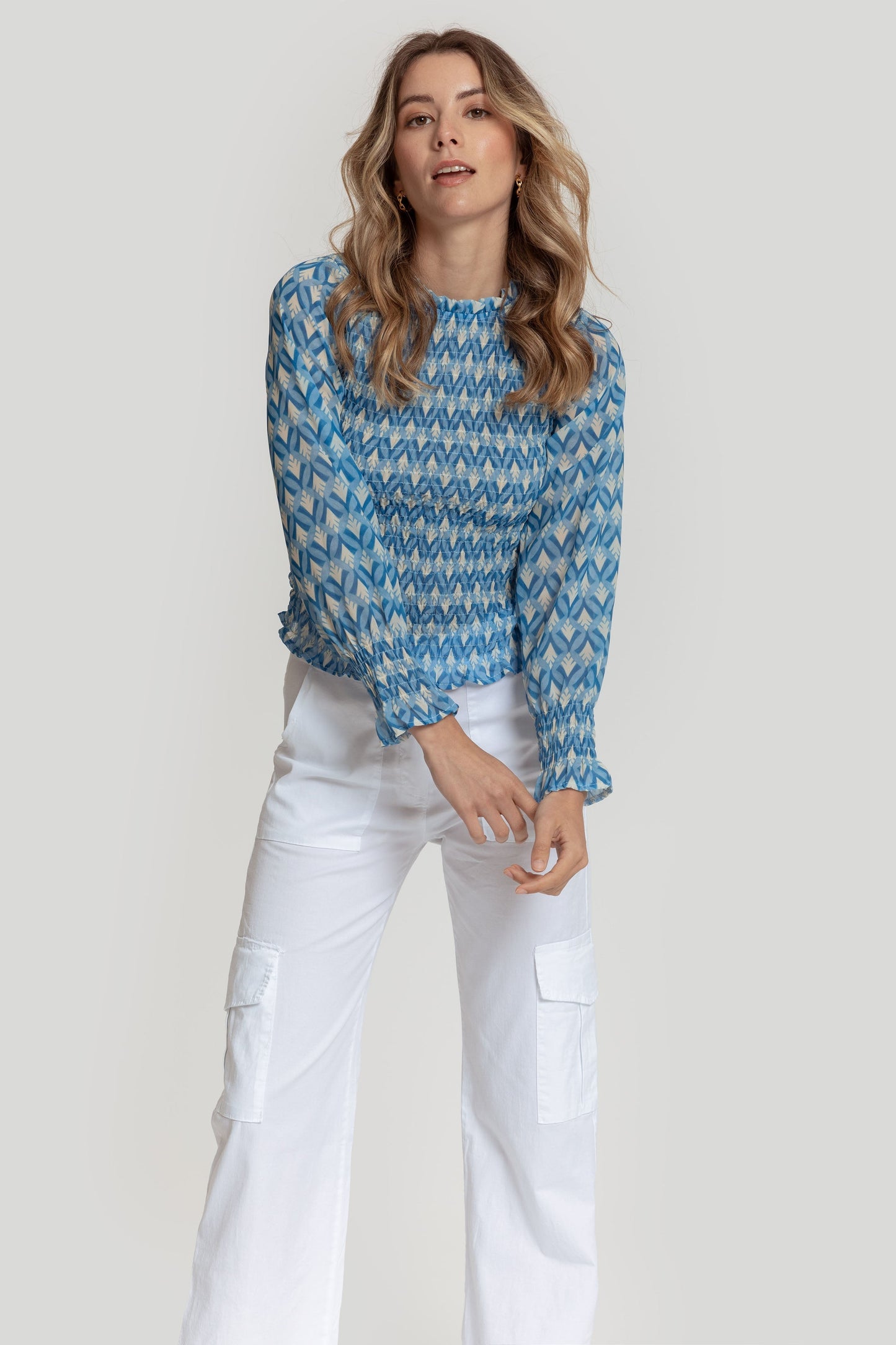 Tejido gasa. Diseño estampado. Diseño recto. Cuello alto. Manga larga. Puño elástico. Cuerpo nido. Talla modelo: S. Altura modelo 1,70 m.