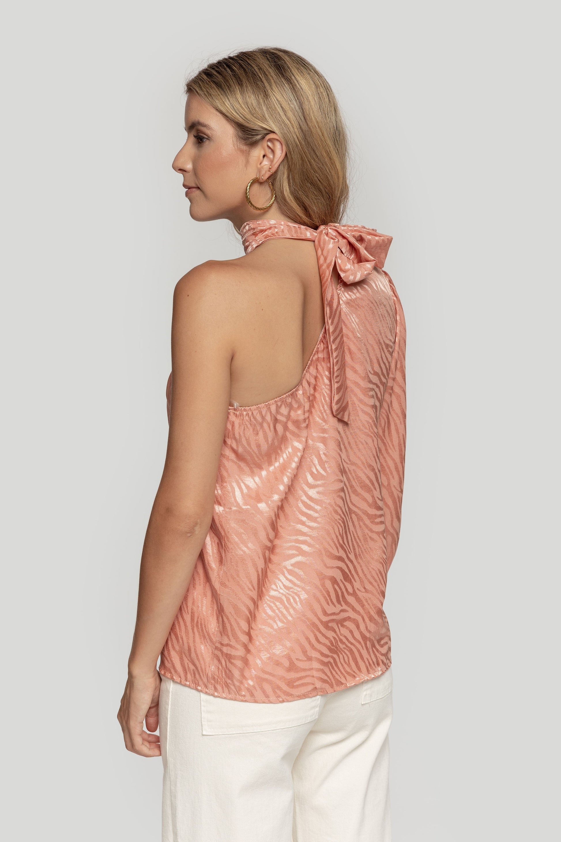 Tejido satinado. Diseño estampado. Diseño recto. Cuello halter con lazada. Manga asimétrica. Manga larga. Talla modelo: S. Altura modelo 1,70 m.
