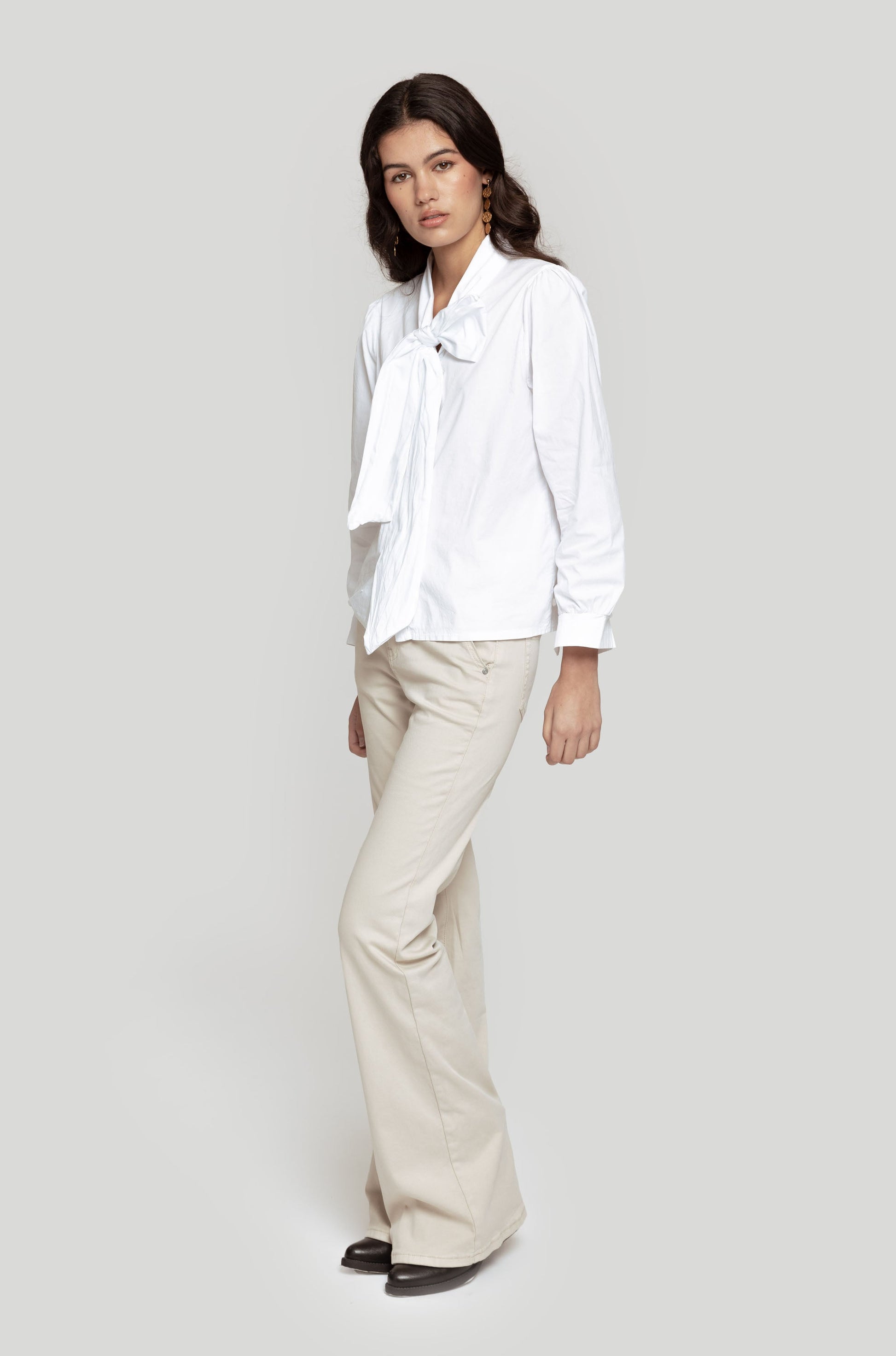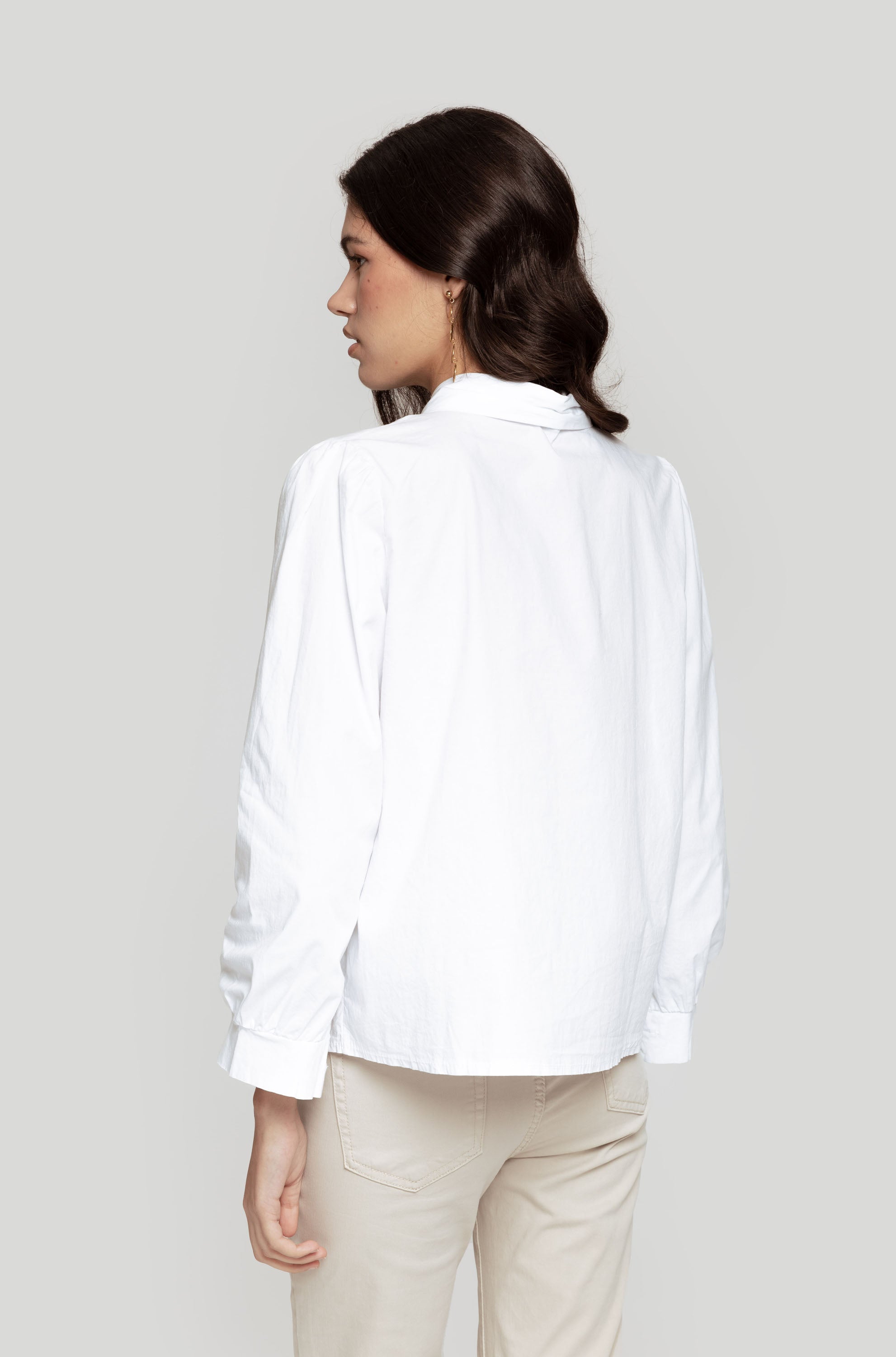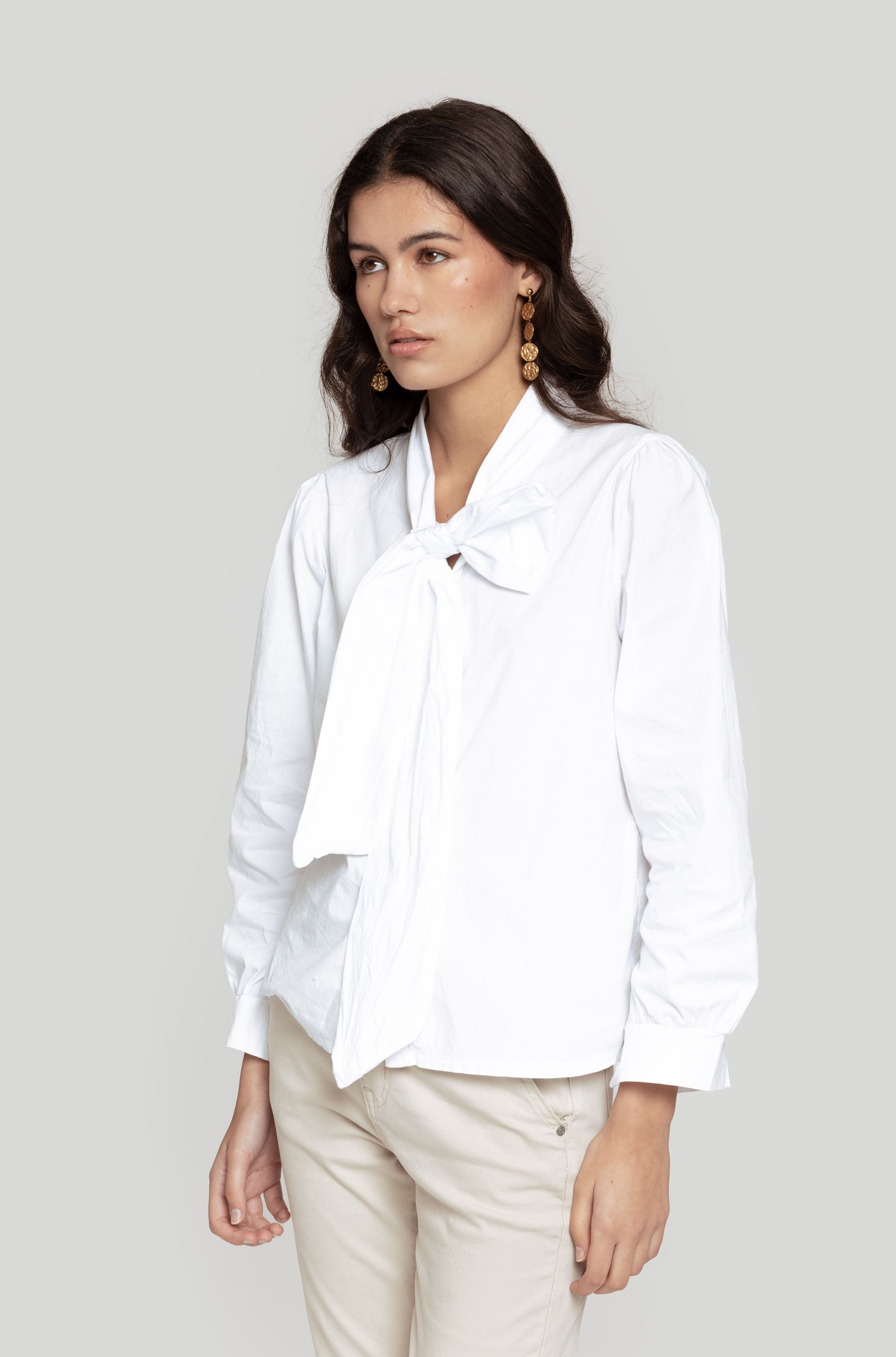 Tejido fluido. Tejido de algodón. Diseño recto. Cuello pico. Manga larga. Puño abotonado. Detalle lazo. Talla modelo: S. Talla modelo: S. Altura modelo: 1.75 m.
