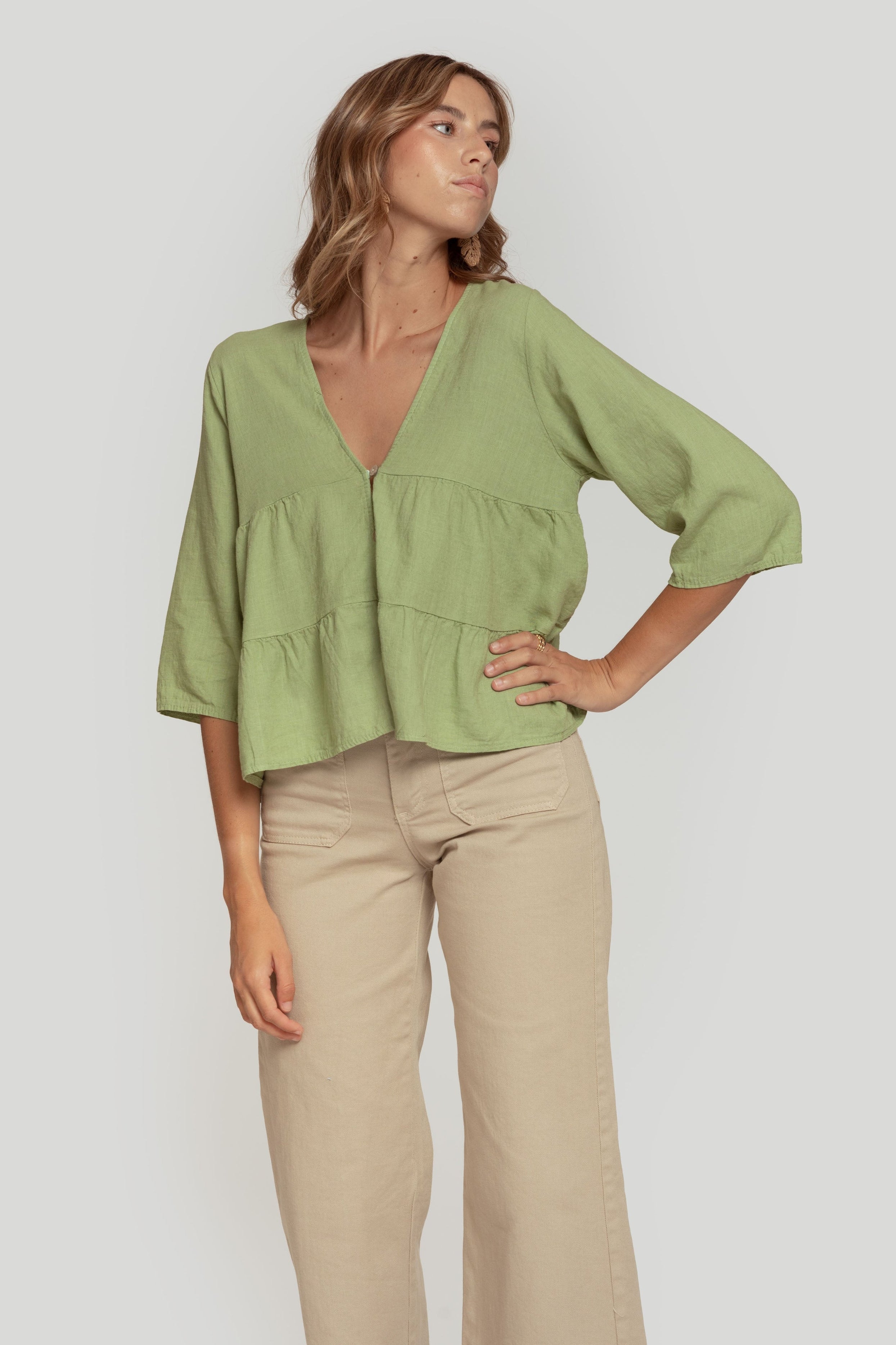 Tejido mezcla lino. Diseño oversize. Cuello pico. Manga corta. Cierre de botones. Detalles pinzas. Costuras visibles. Talla modelo: S. Altura modelo: 1,70 m.
