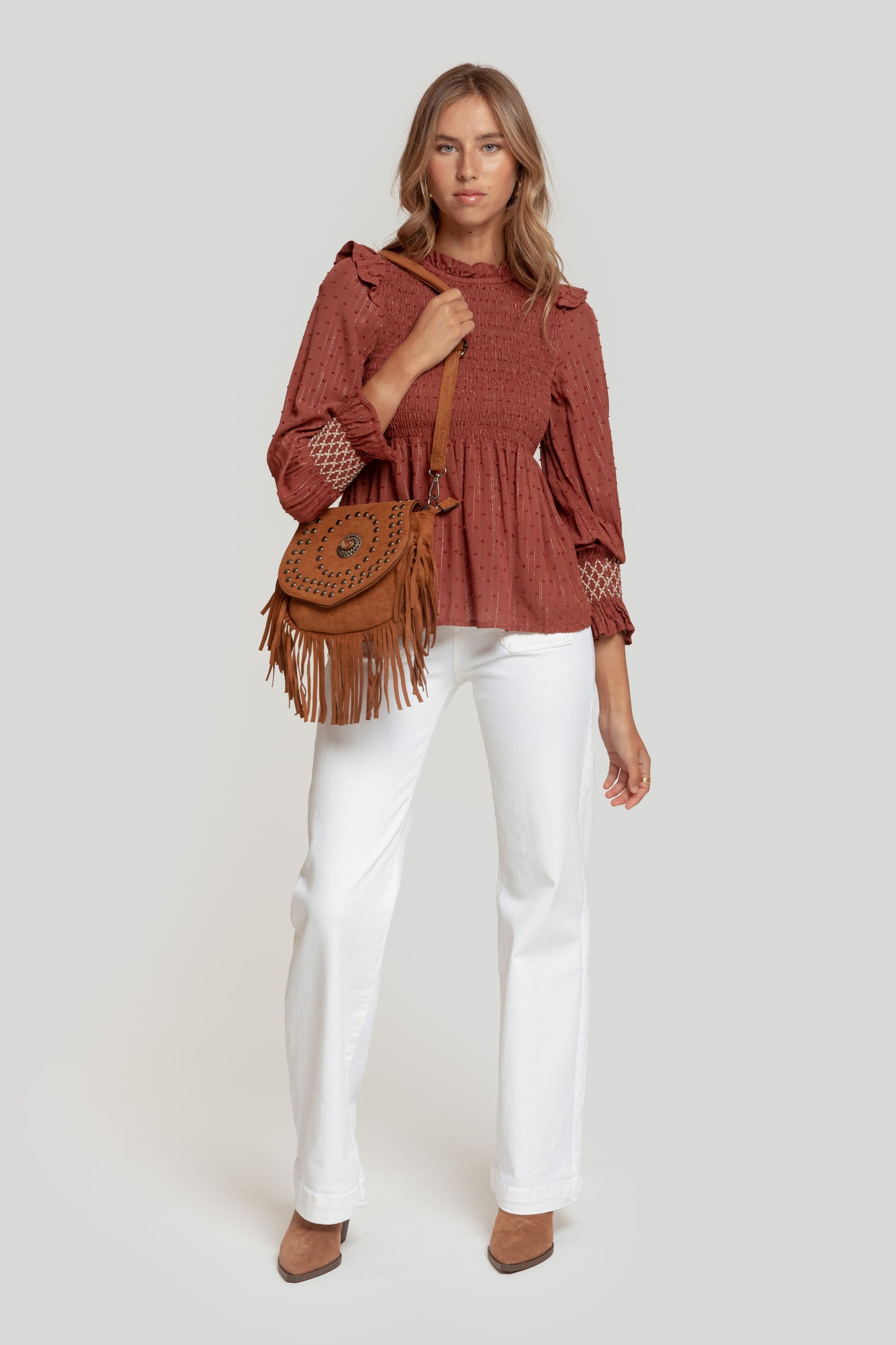 Tejido combinado. Diseño peplum. Cuello redondo. Manga larga. Puño acampanado. Abotonado en la nuca. Trama brillante. Detalles volantes.
