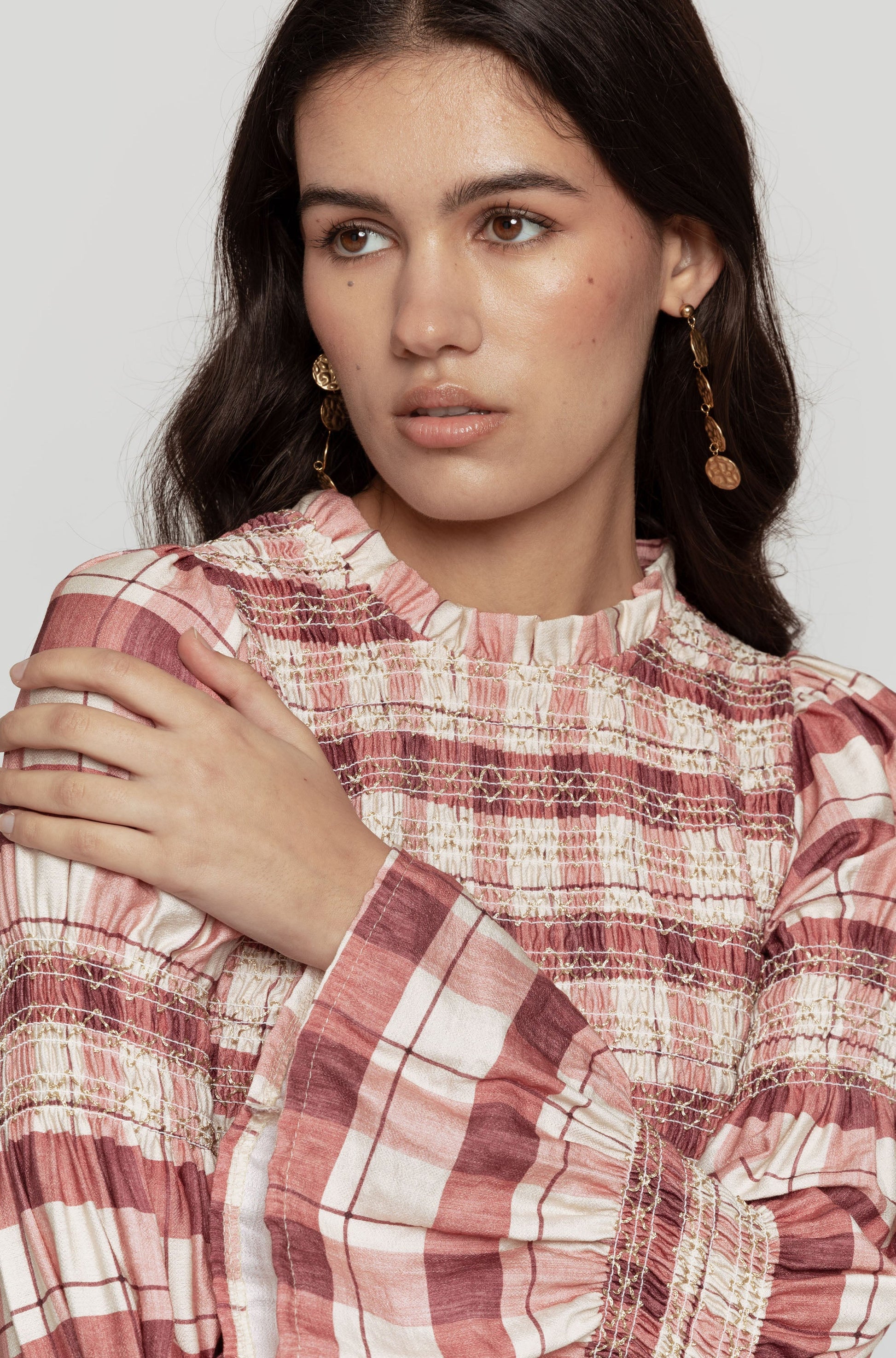 Tejido fluido. Diseño estampado. Diseño peplum. Cuello redondo. Manga larga. Puño acampanado. Panel elástico. Costuras visibles. Talla modelo: S. Altura modelo: 1,75 m.