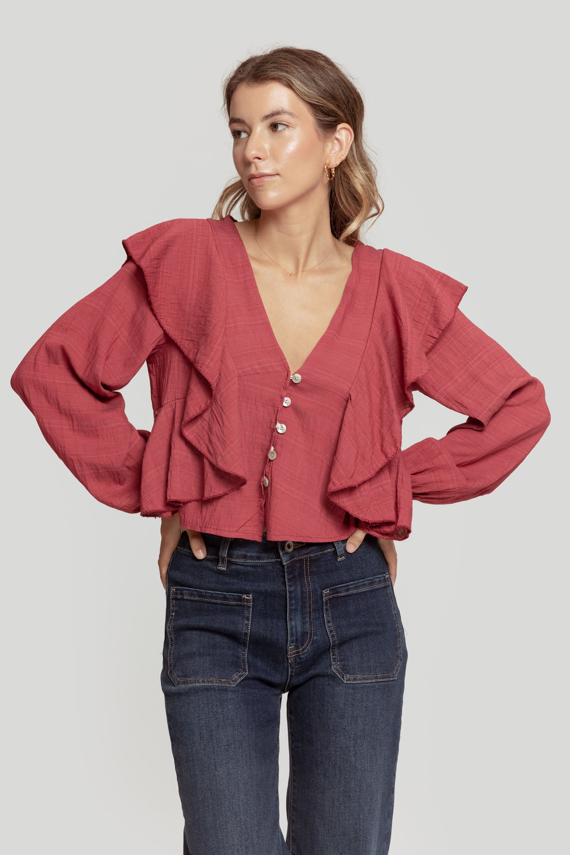 Tejido fluido. Diseño recto. Diseño cropeed. Cuello pico. Manga larga. Puño elástico. Cierre de botones. Detalle volantes. Talla modelo: S. Altura modelo: 1.70 m.