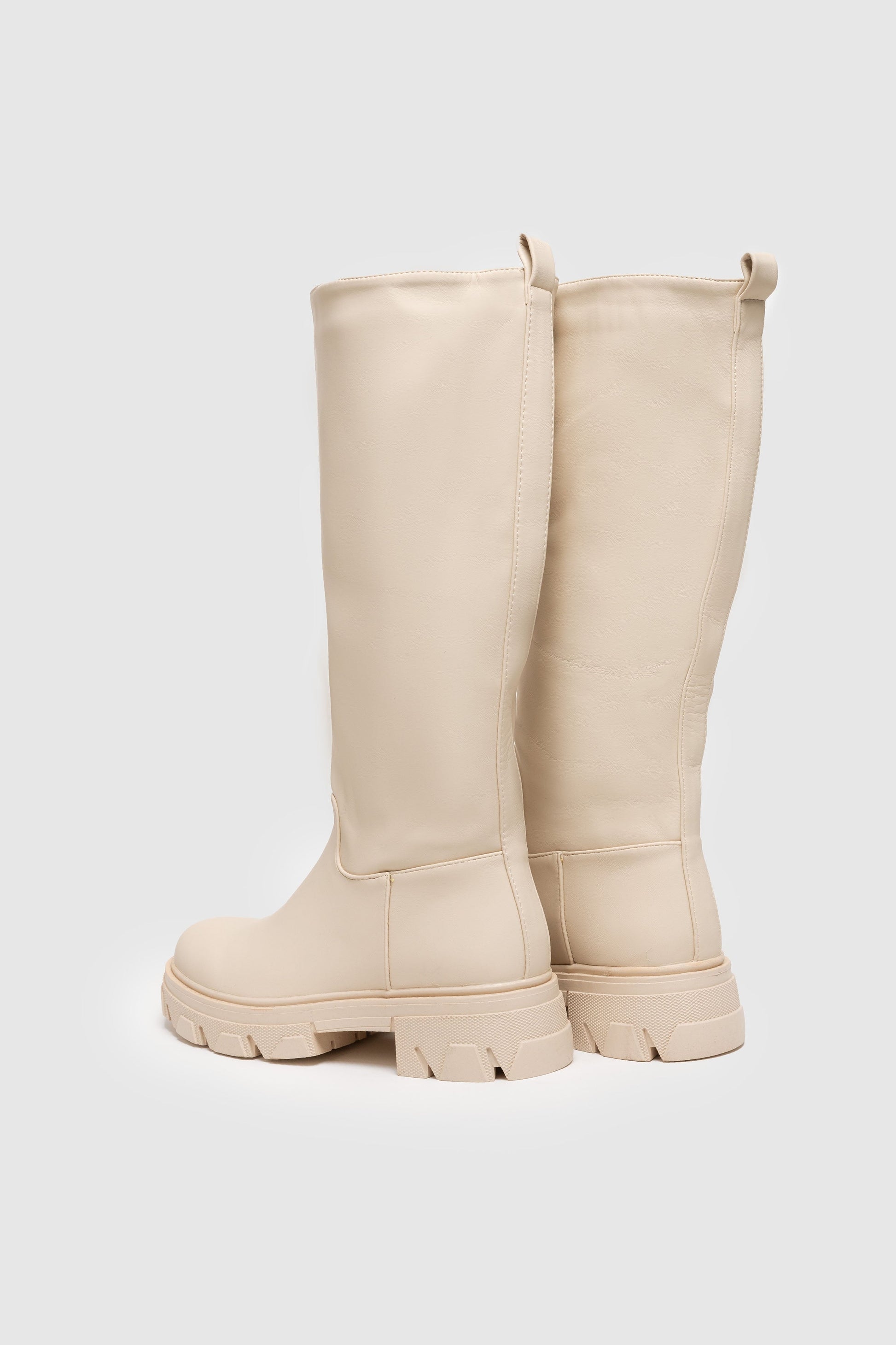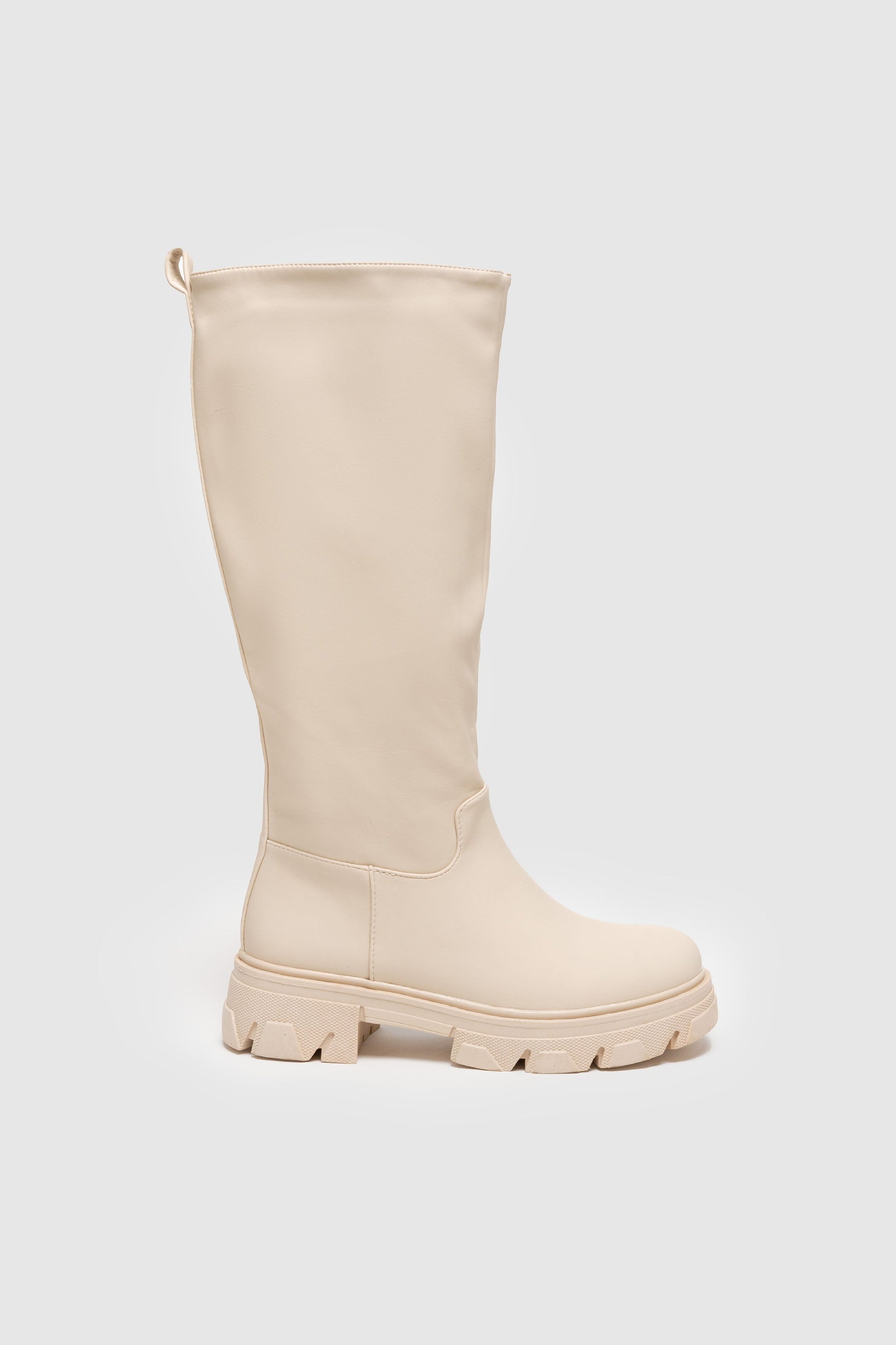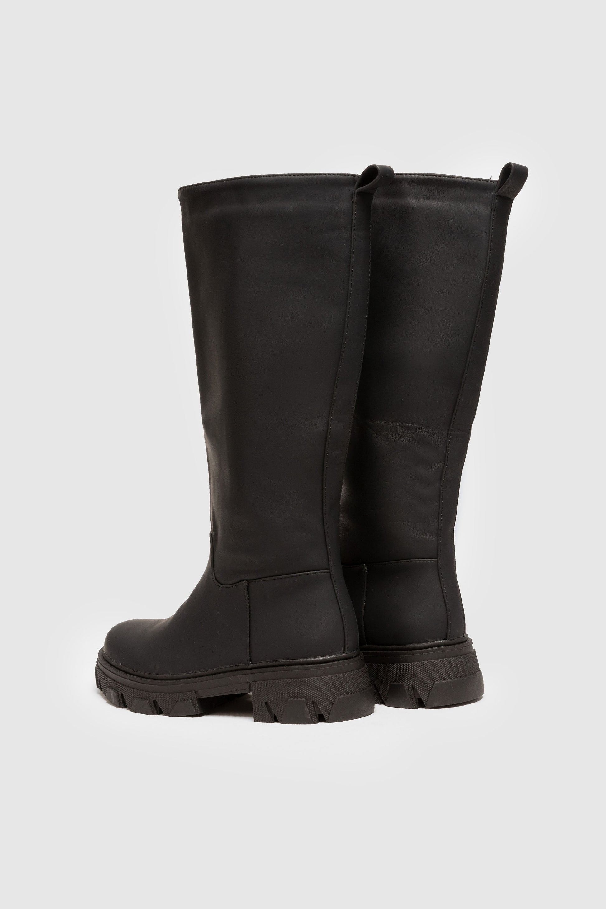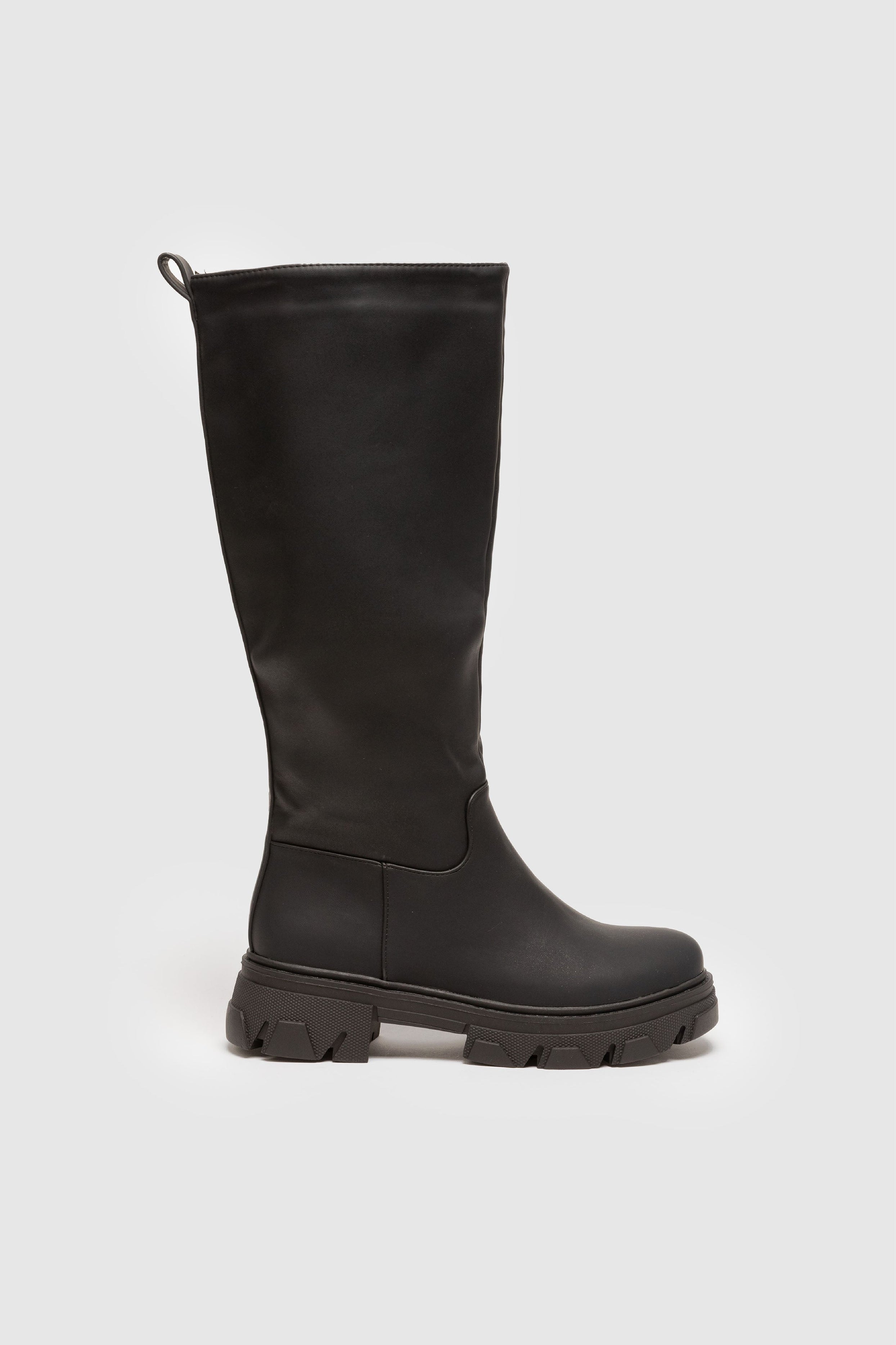 Bota plana engomada. Punta redonda. Caña alta . Suela track. Forro interior. Sin cierre. Detalle de tirador trasero.
