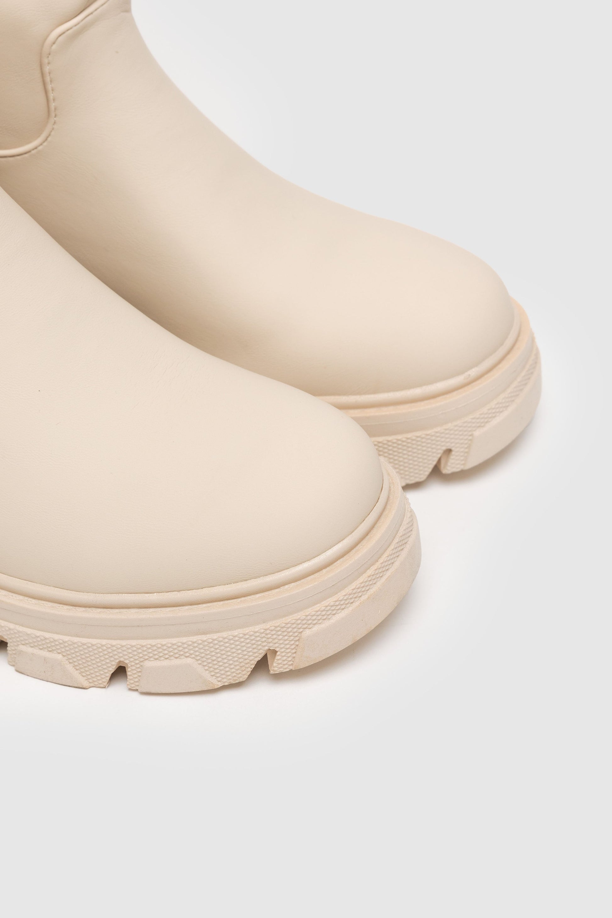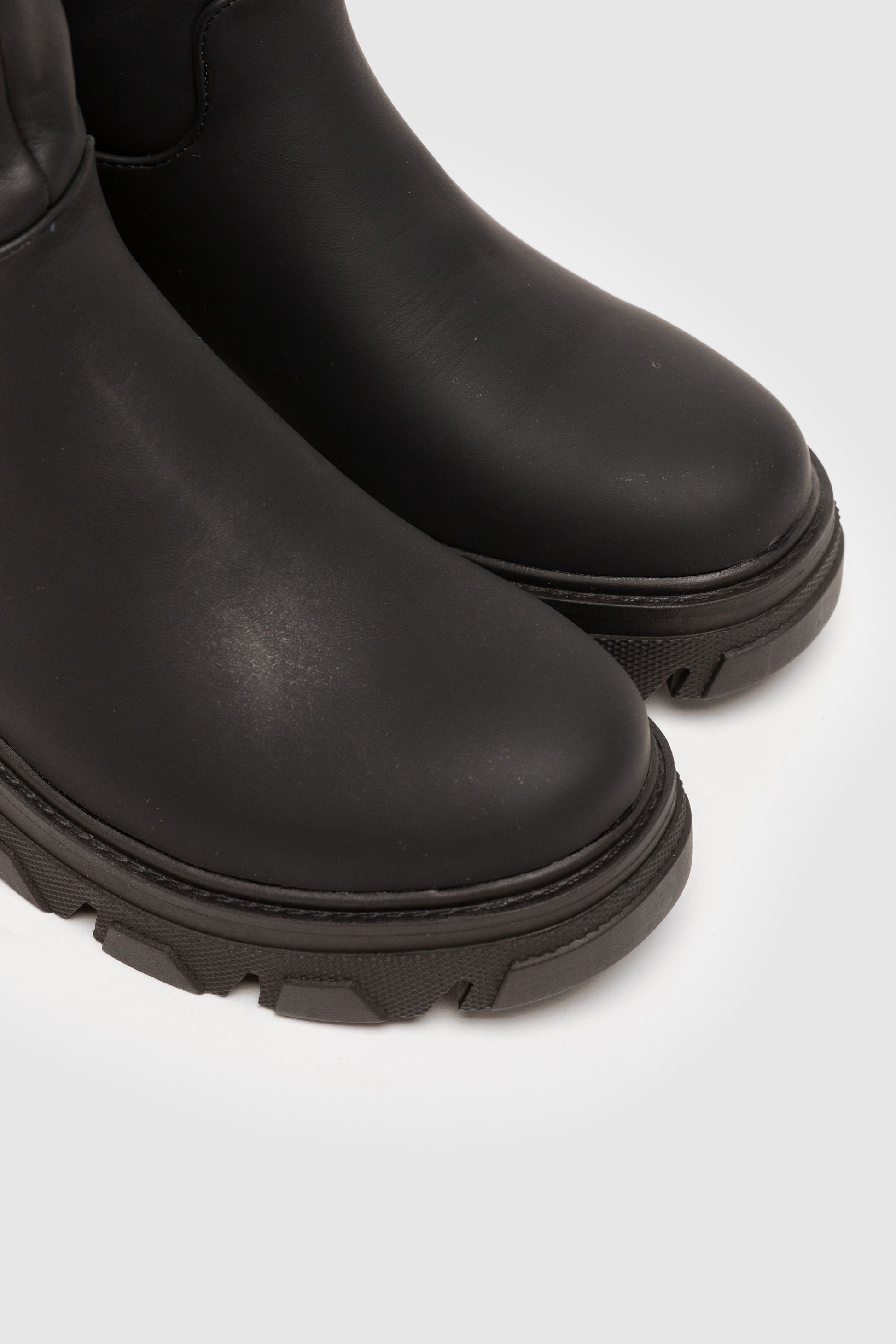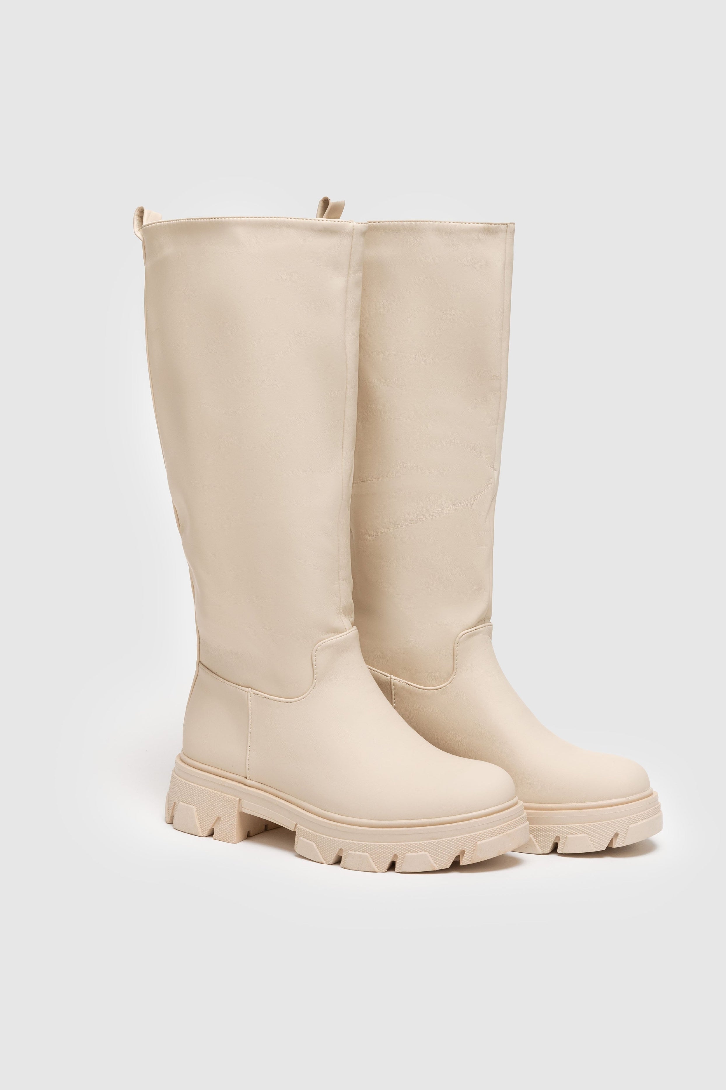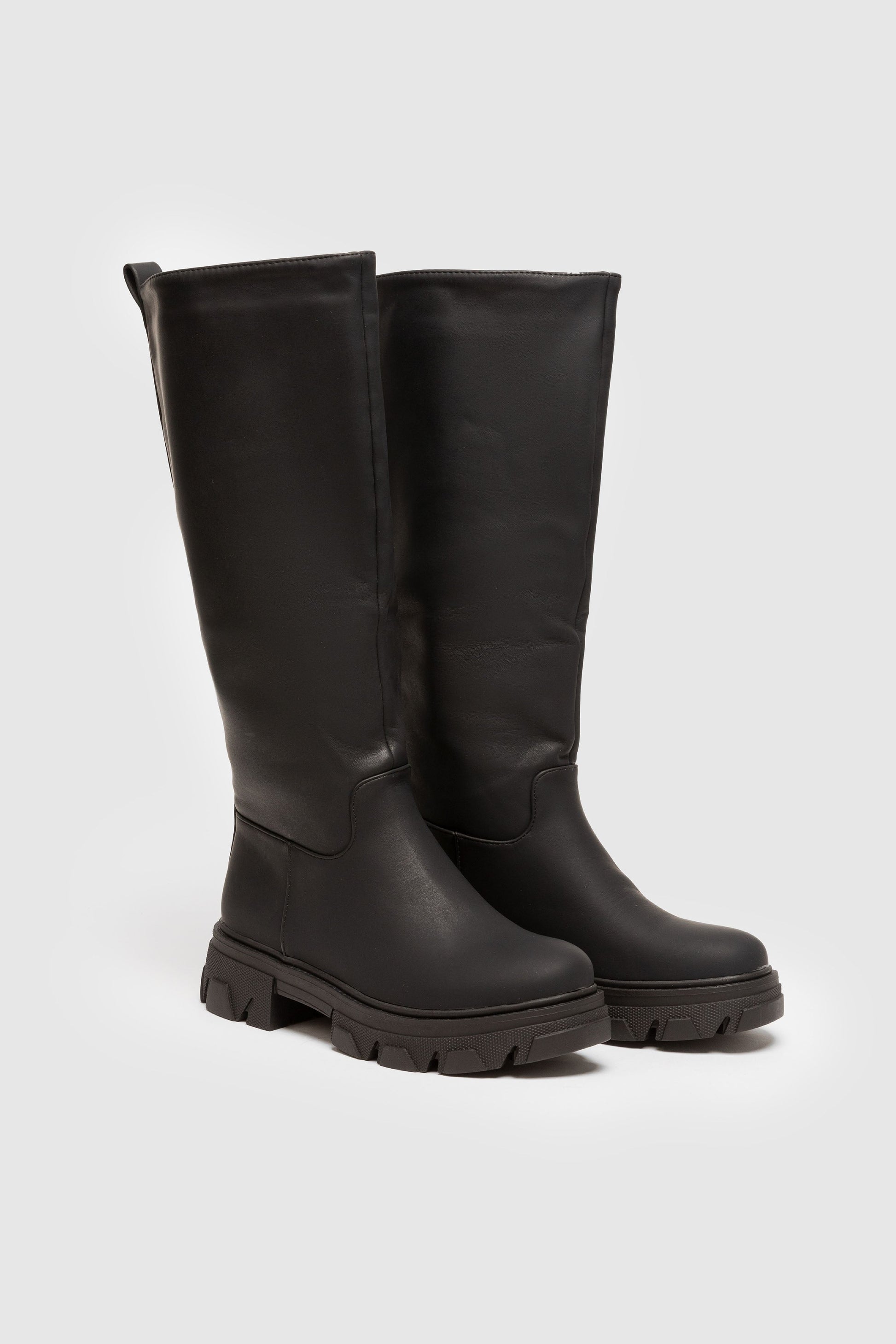 Bota plana engomada. Punta redonda. Caña alta . Suela track. Forro interior. Sin cierre. Detalle de tirador trasero.